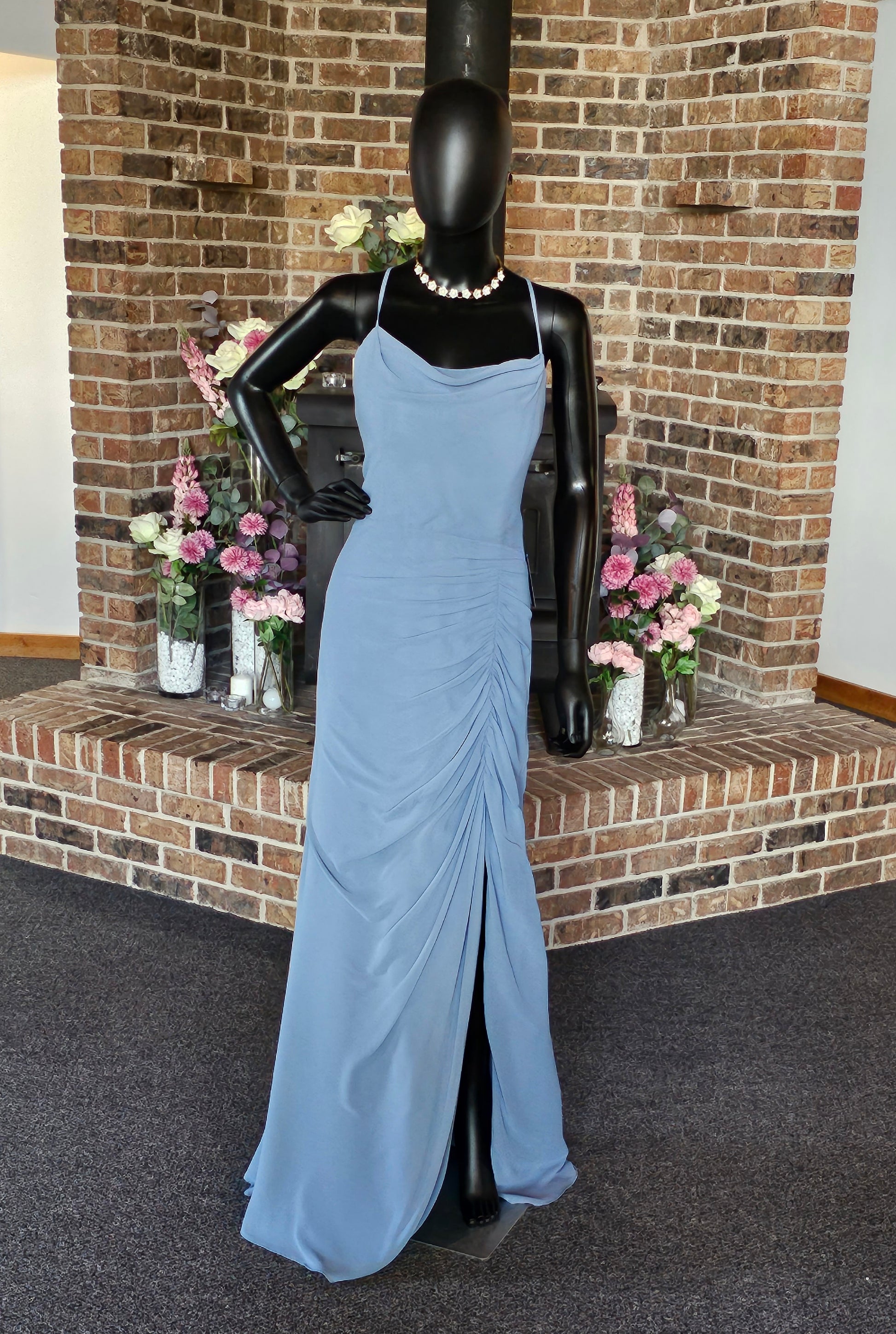 This romantic blue gown is wonderful for a wedding or night out. The loose chiffon is draped across the chest and gathered along one leg. The slit adds a sexy touch to match the elegant spaghetti straps.
