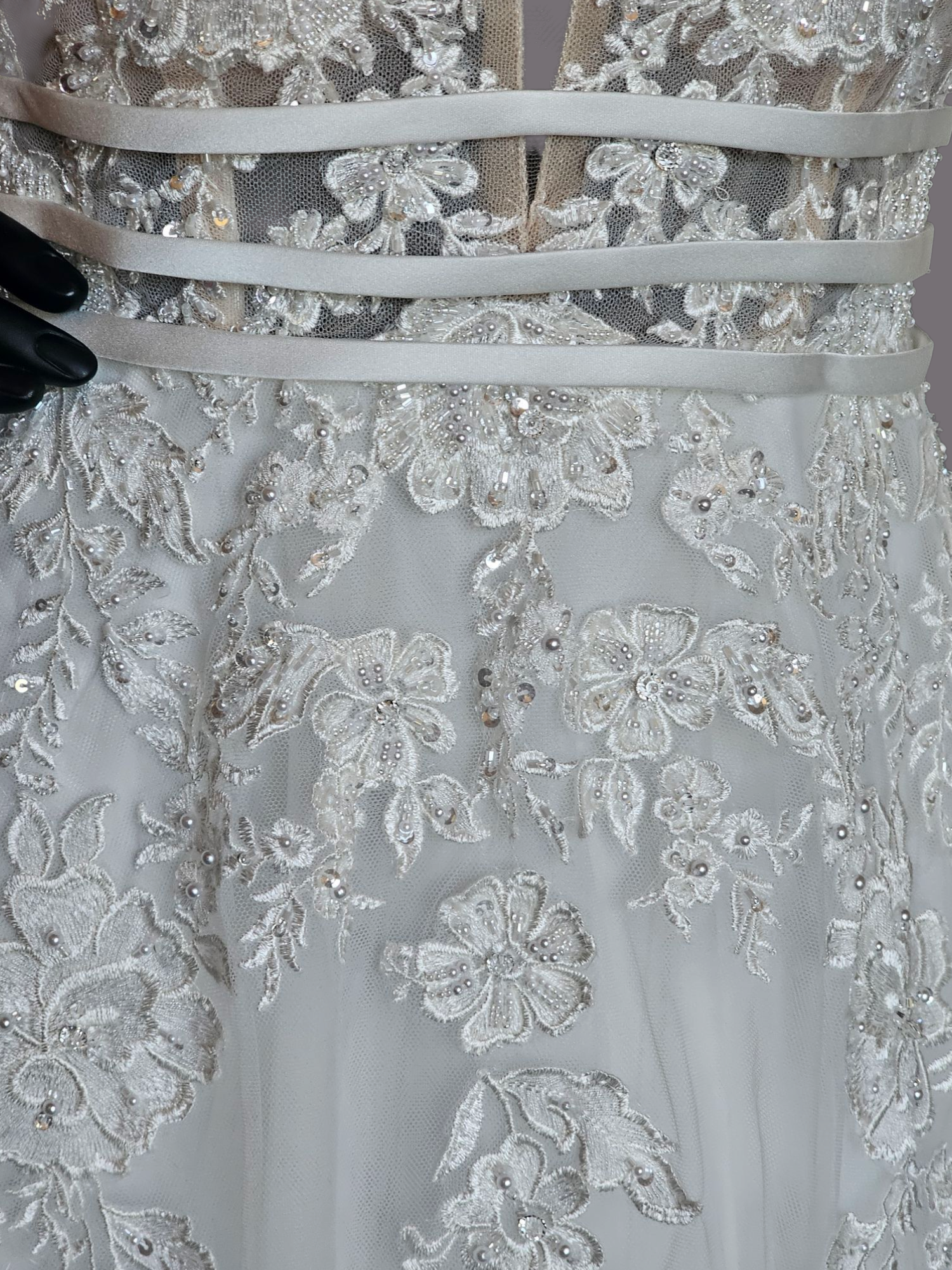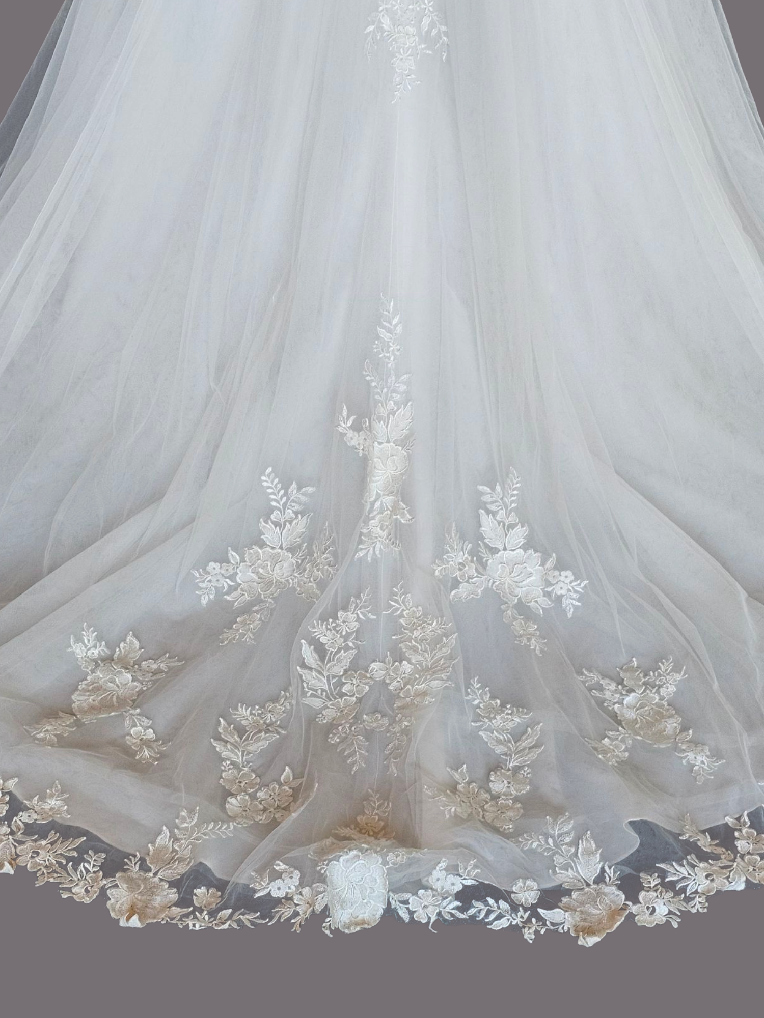 Experience an ethereal wedding in our Ivory A-Line Illusion Bodice Floral Applique Gown from Bliss Bridal. Wide straps and a plunging v-neckline add elegance, while the sheer/illusion bodice and delicate belts cinch the natural waistline. Cutouts under the arms and a scoop back reveal a modern twist. The full tulle skirt and chapel train, adorned with floral embroidery appliques and a touch of sparkle, make this dress a dream come true.