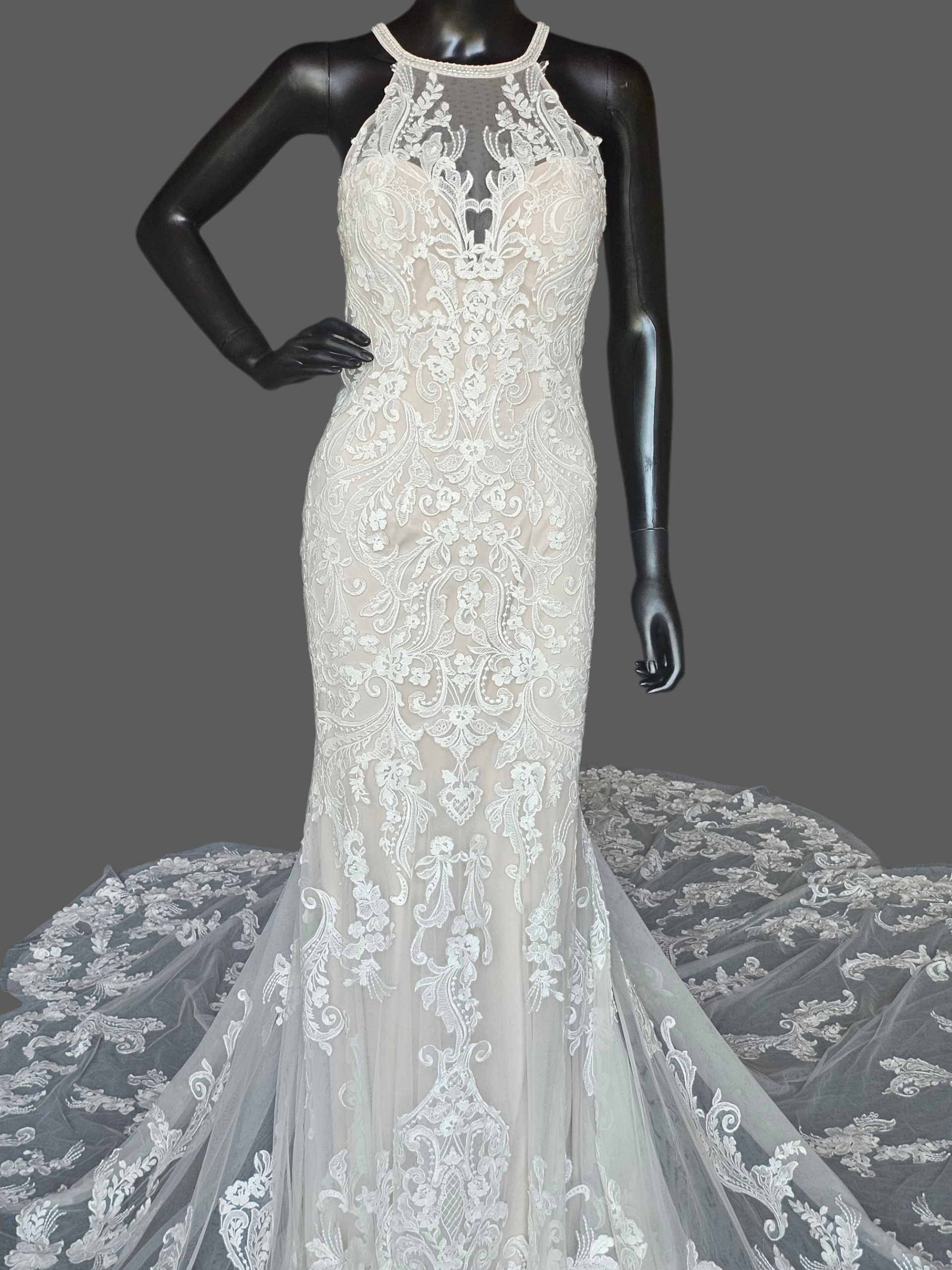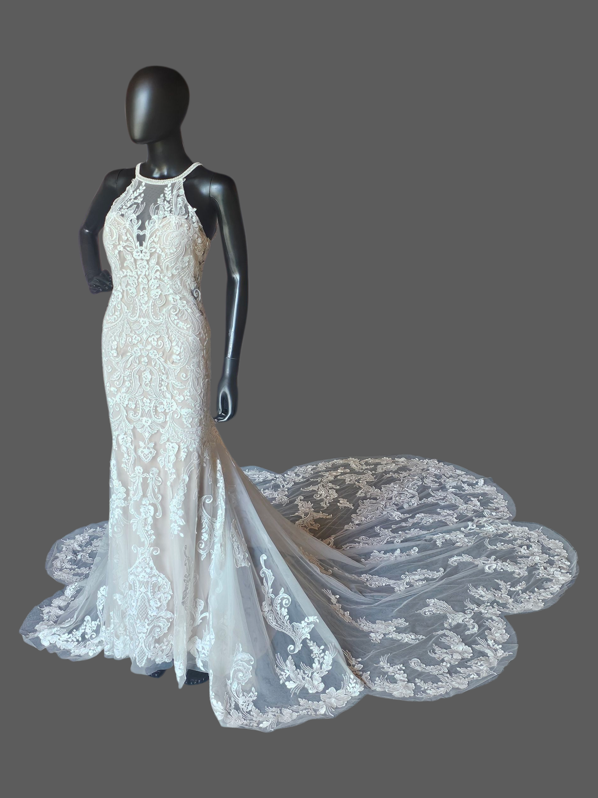 Ivory/Cappuccino Lace Halter Fit/Flare Scallop Train Wedding Gown - Mori Lee