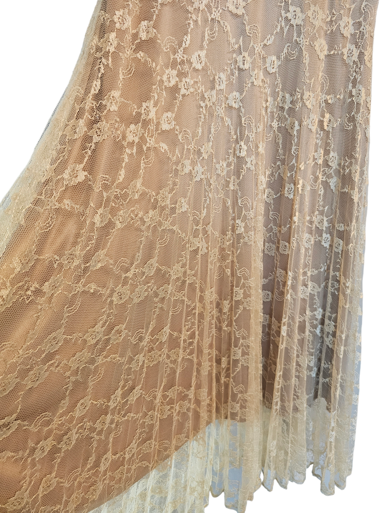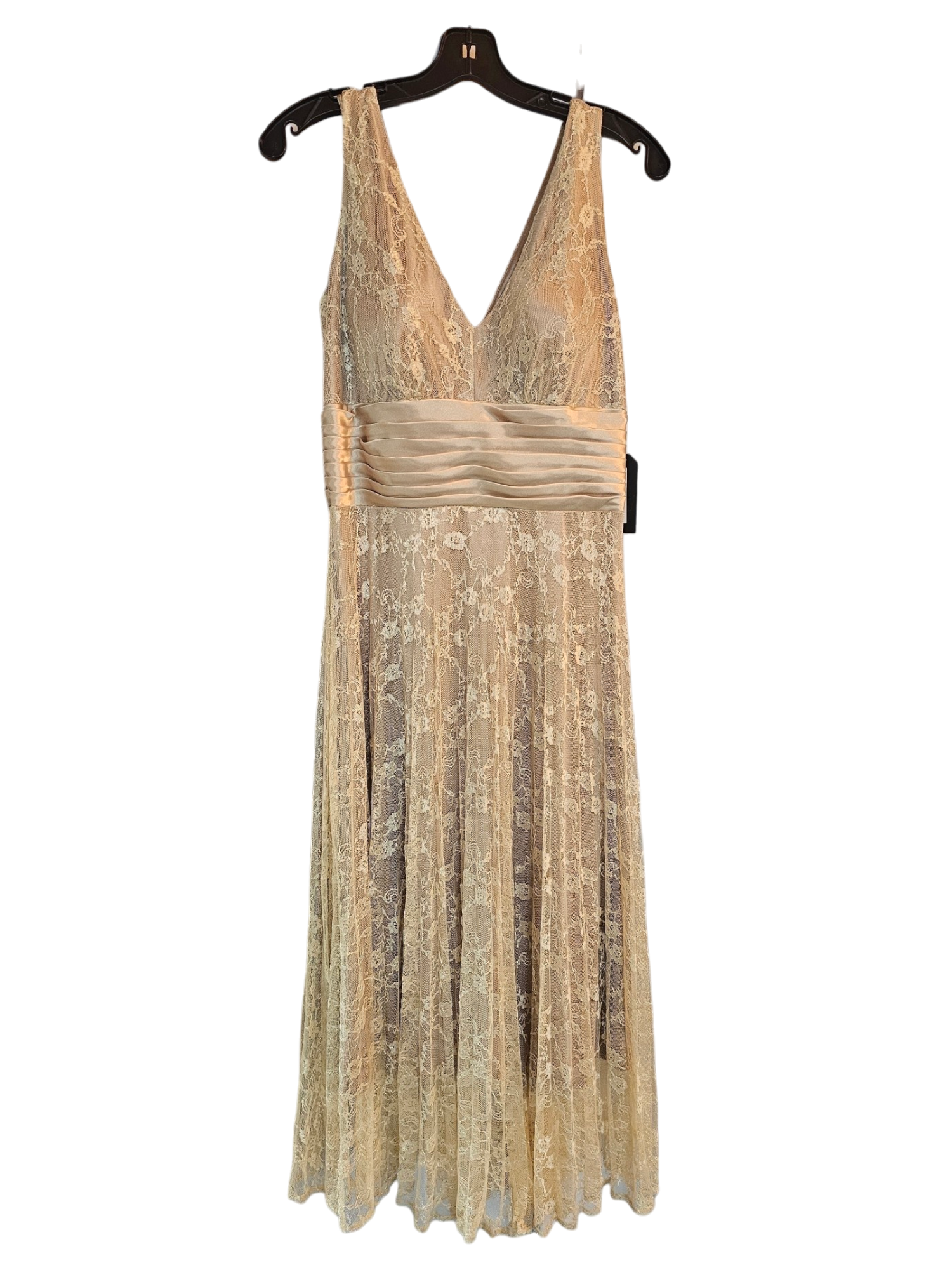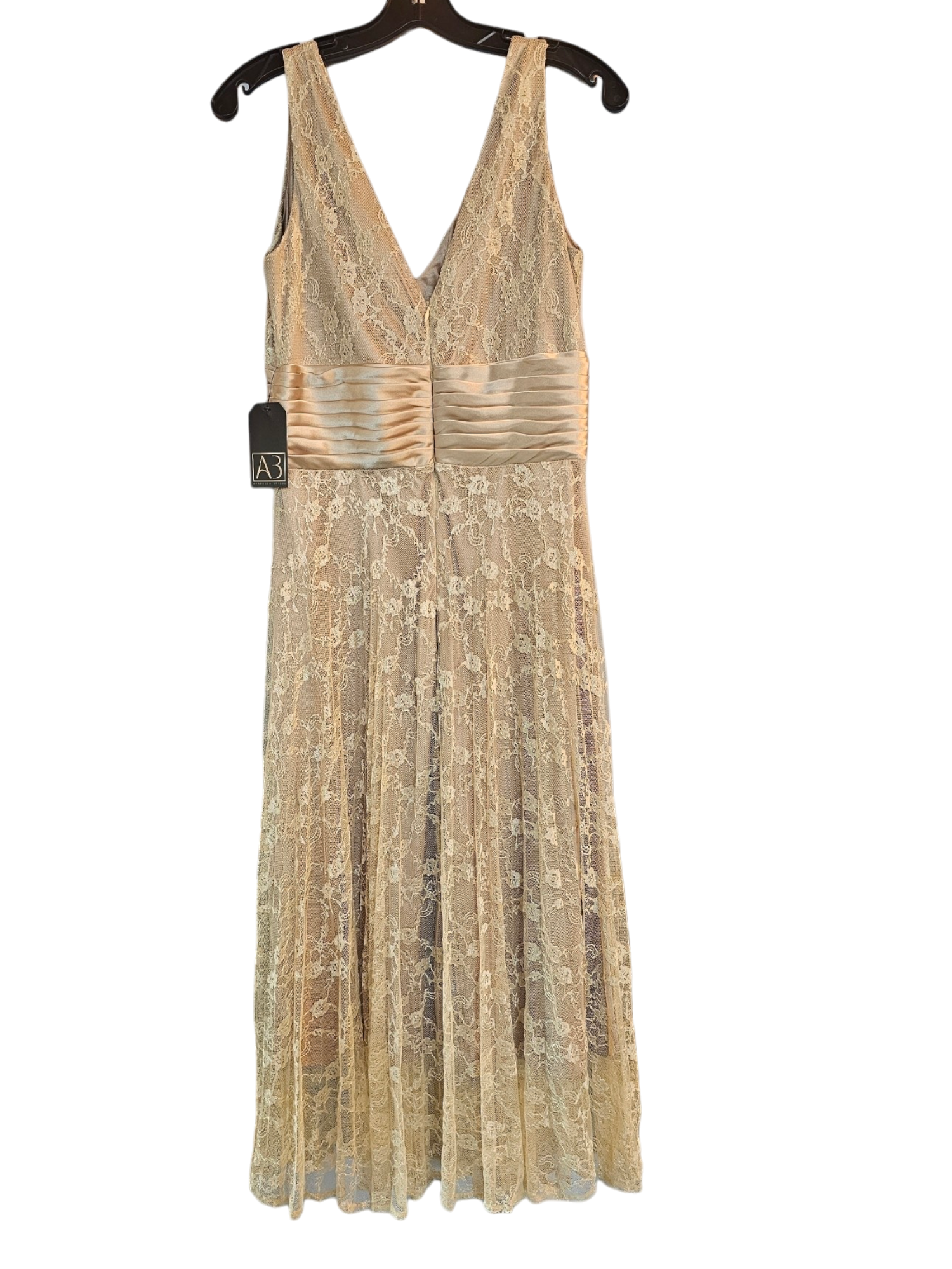 Special Attributes: Lace overlay, satin accent at the waistline