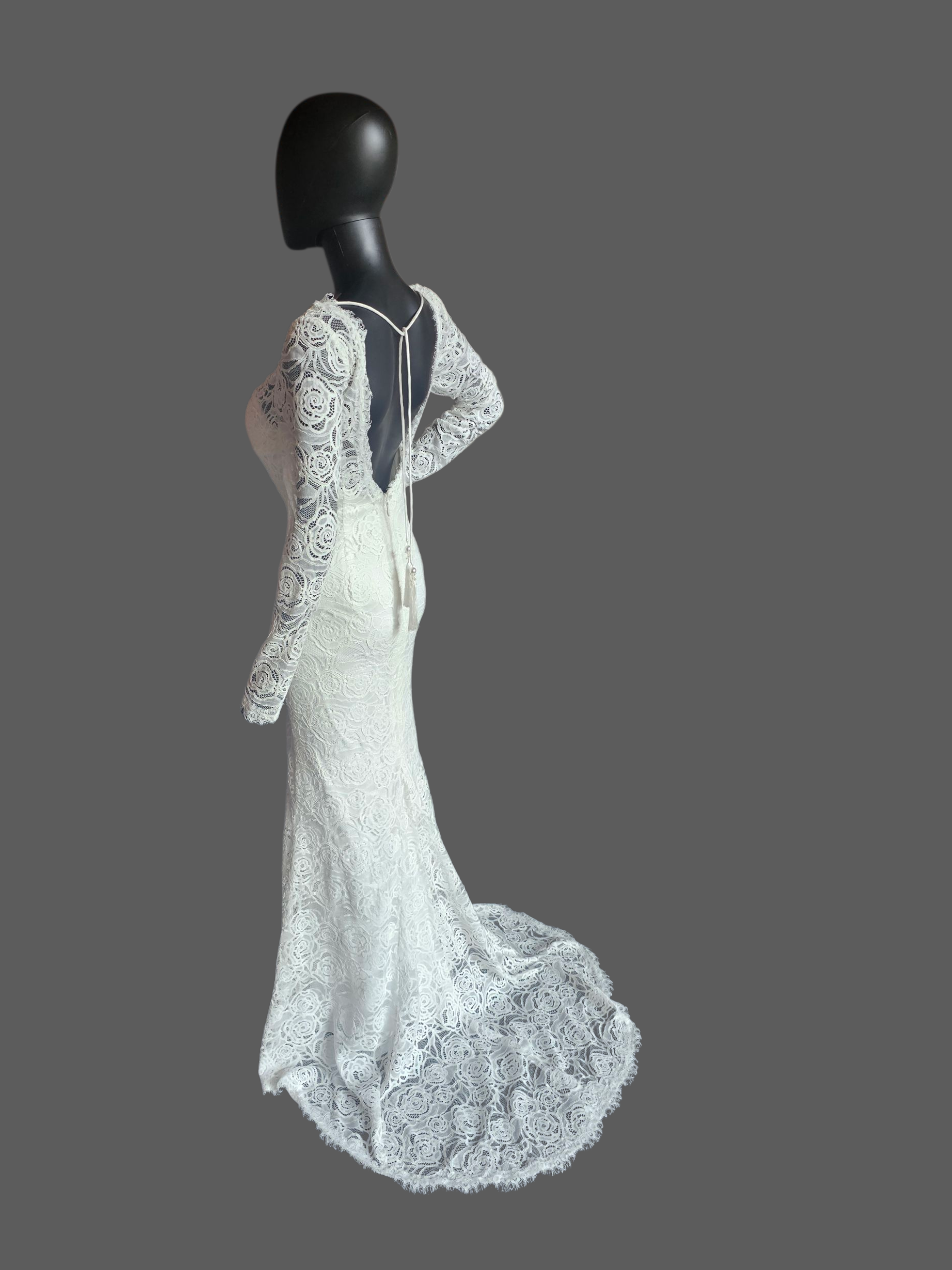 Expertly crafted for the modern bride, this Ivory Long Sleeve Lace Fit/Flare Wedding Gown from DB Bridal features a sleek fit and flare silhouette and a sweep train for a timeless and elegant look. The large scale soft floral lace with eyelash detail and open scoop back add a touch of romance, while the tie detail along the neck adds a unique touch. Perfect for any wedding day.