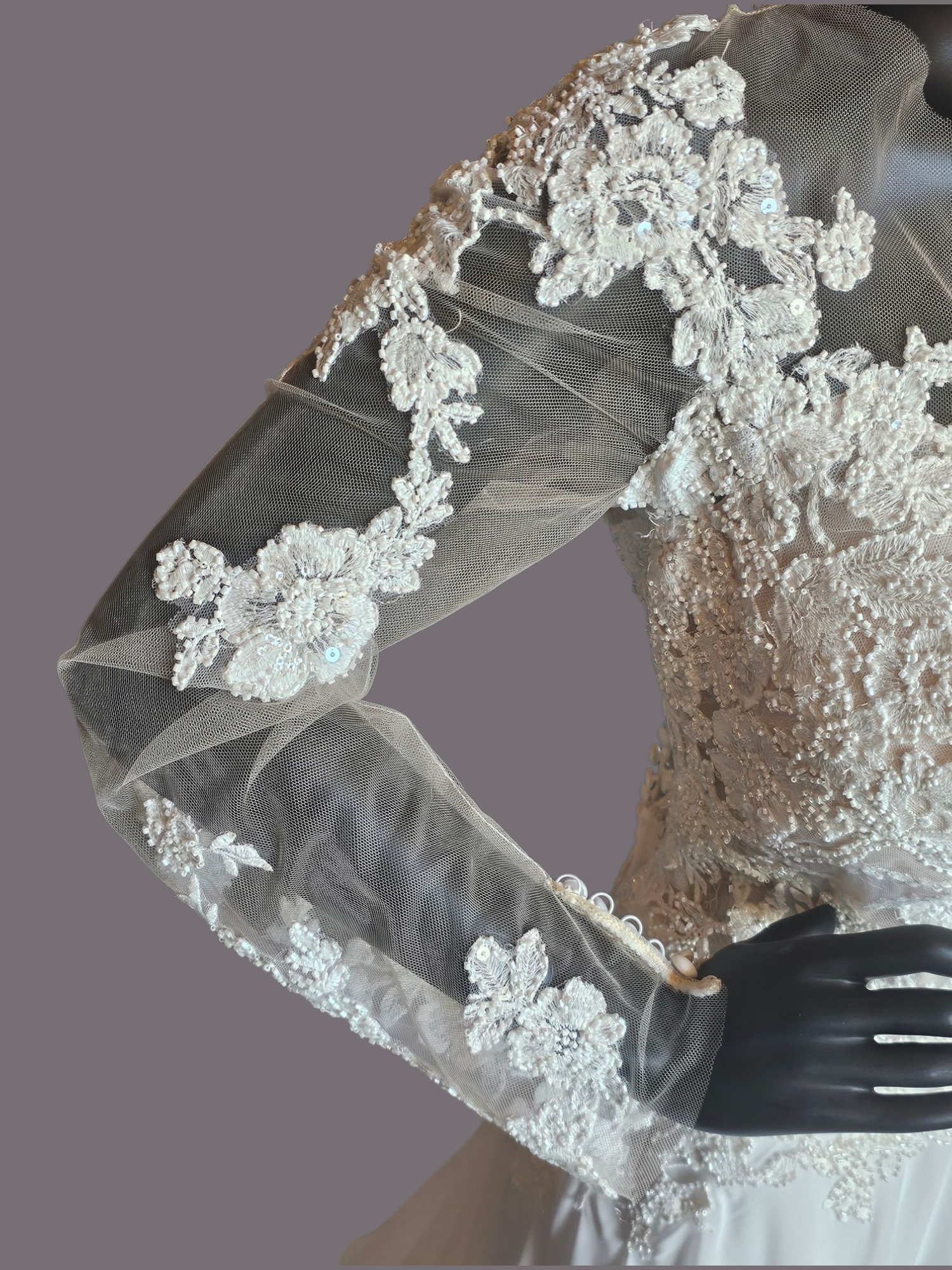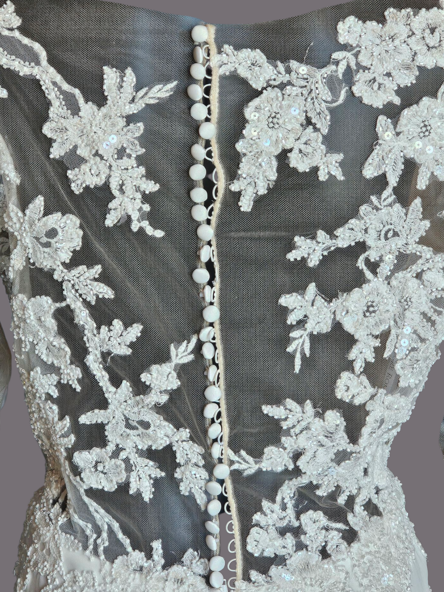 This gown is part of our store sample collection. It has never been worn for a wedding or altered in any way. Many will still have the original store tags on them. They may show some slight signs of wear from being tried on in the store. All prices reflect the condition of the gown. Please contact me to schedule a virtual consultation where we can go through the gown together and verify the condition so you feel confident in your purchase.