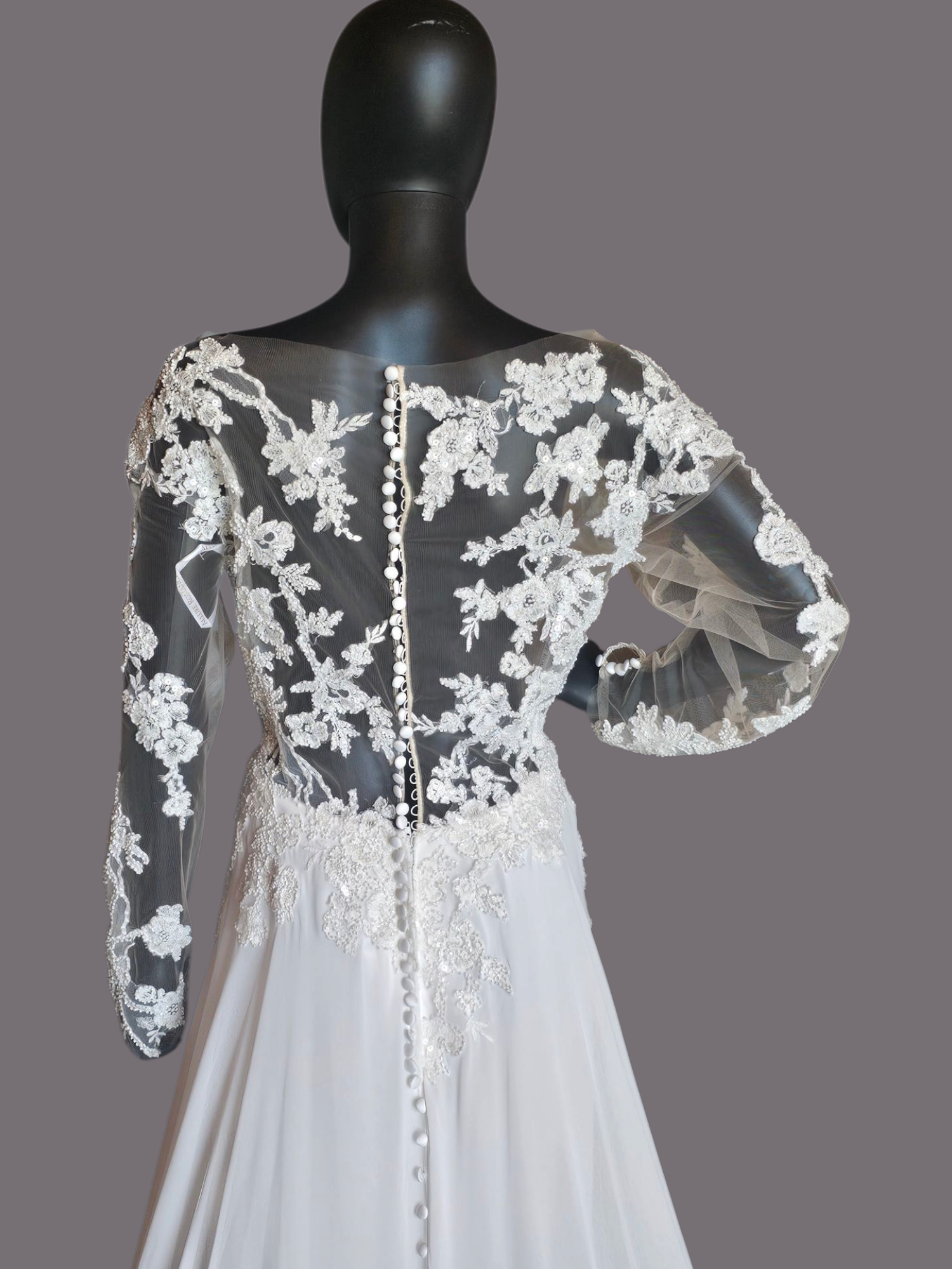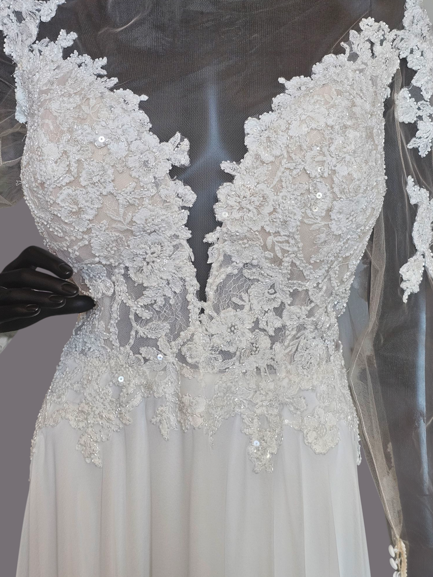 Feel romantic and daring on your wedding day with this stunning deep plunge gown! The full illusion bodice and sheer back with button closure will make heads turn. With long sleeves and floral appliques throughout, this chiffon overskirt will add a touch of softness to your look. Perfect for a dreamy outdoor ceremony.