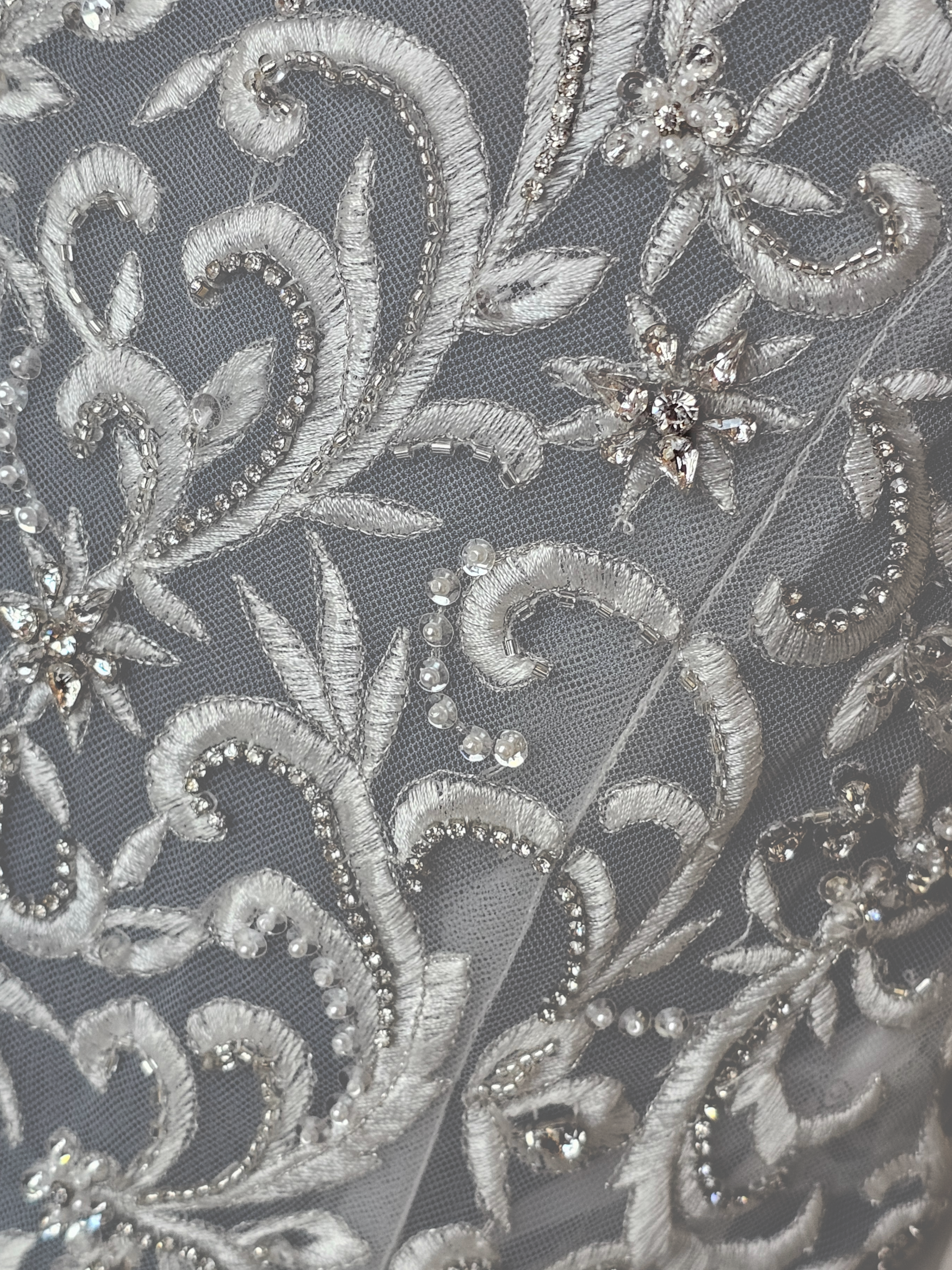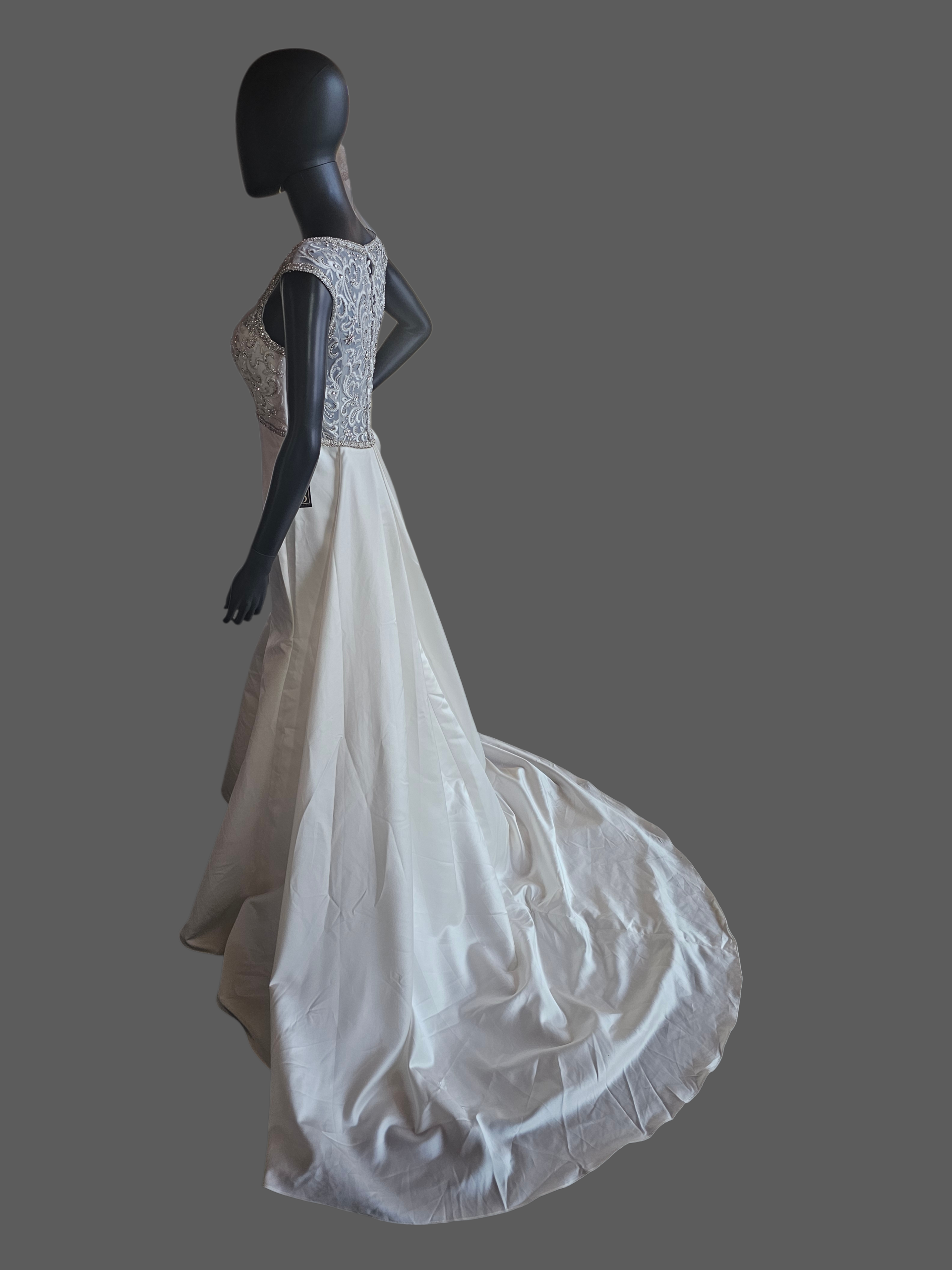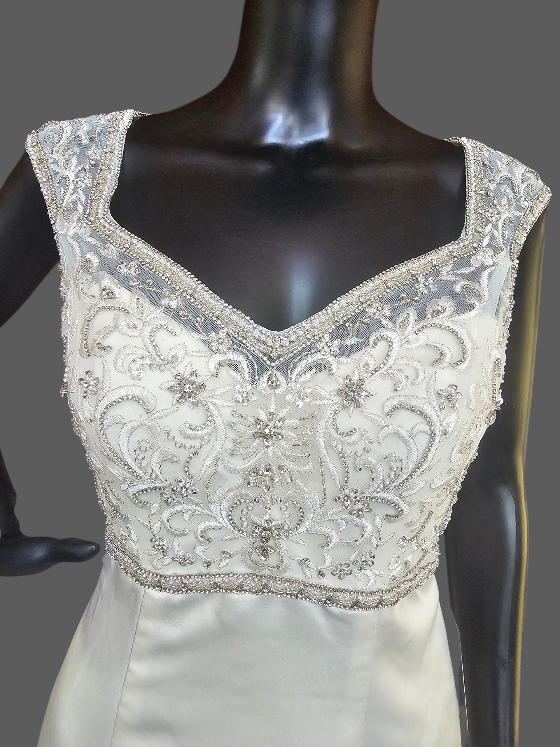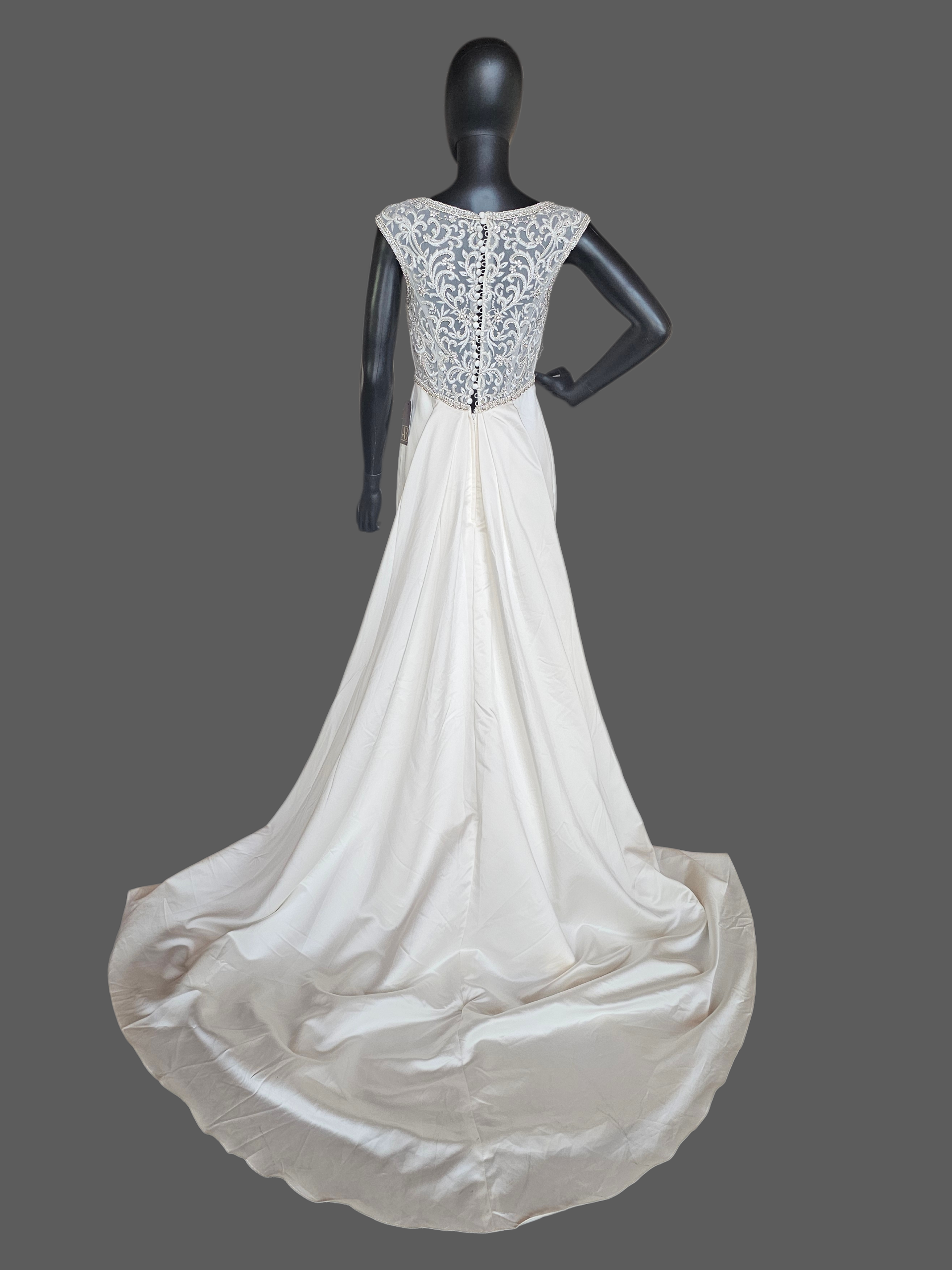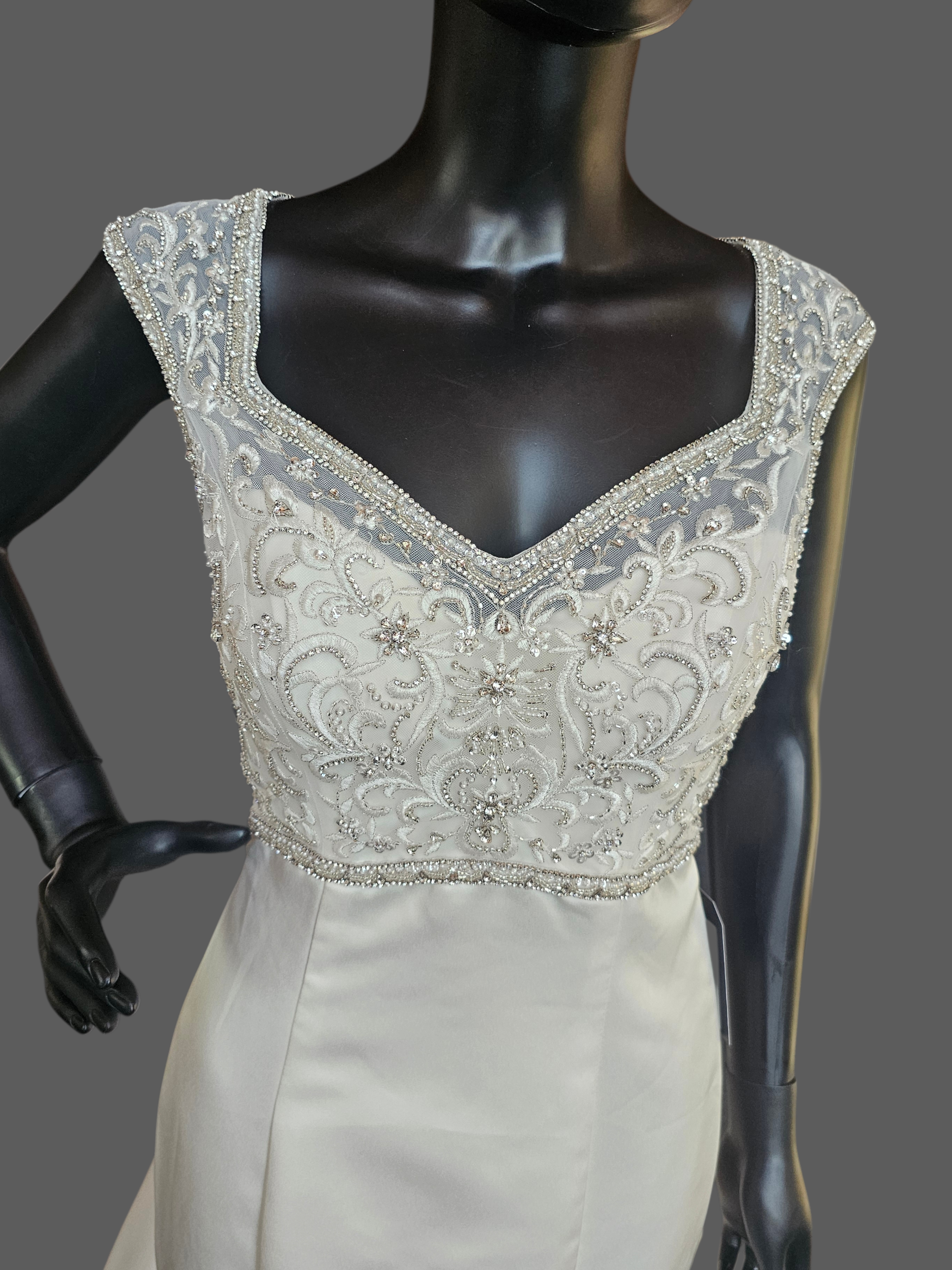 Ivory Satin Empire V-Neck Cap Sleeve Fit/Flare Wedding Gown - Da Vinci