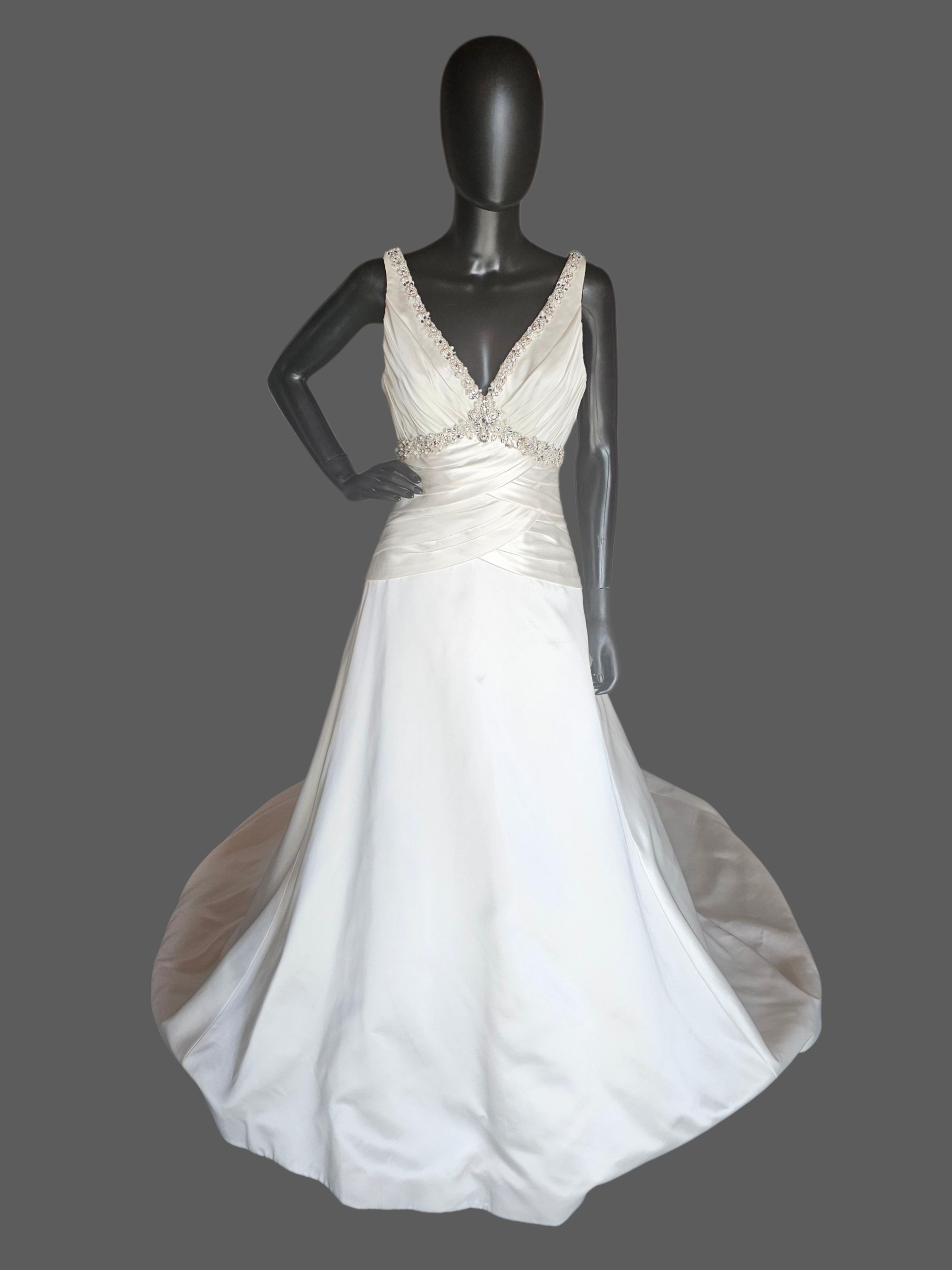 Ivory Satin V-Neck Jewel Detail A-Line Wedding Gown - Mori Lee