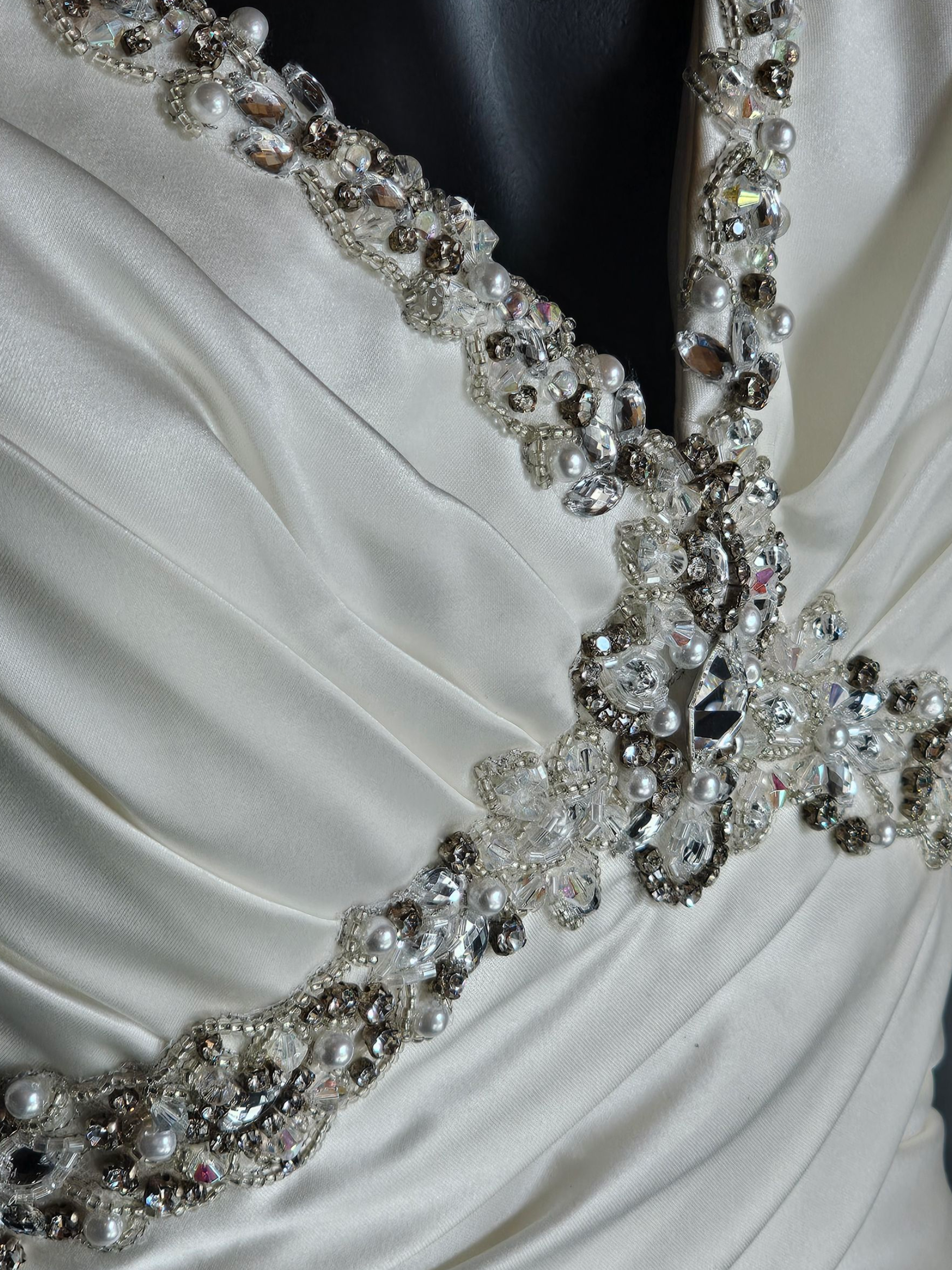 Ivory Satin V-Neck Jewel Detail A-Line - Mori Lee