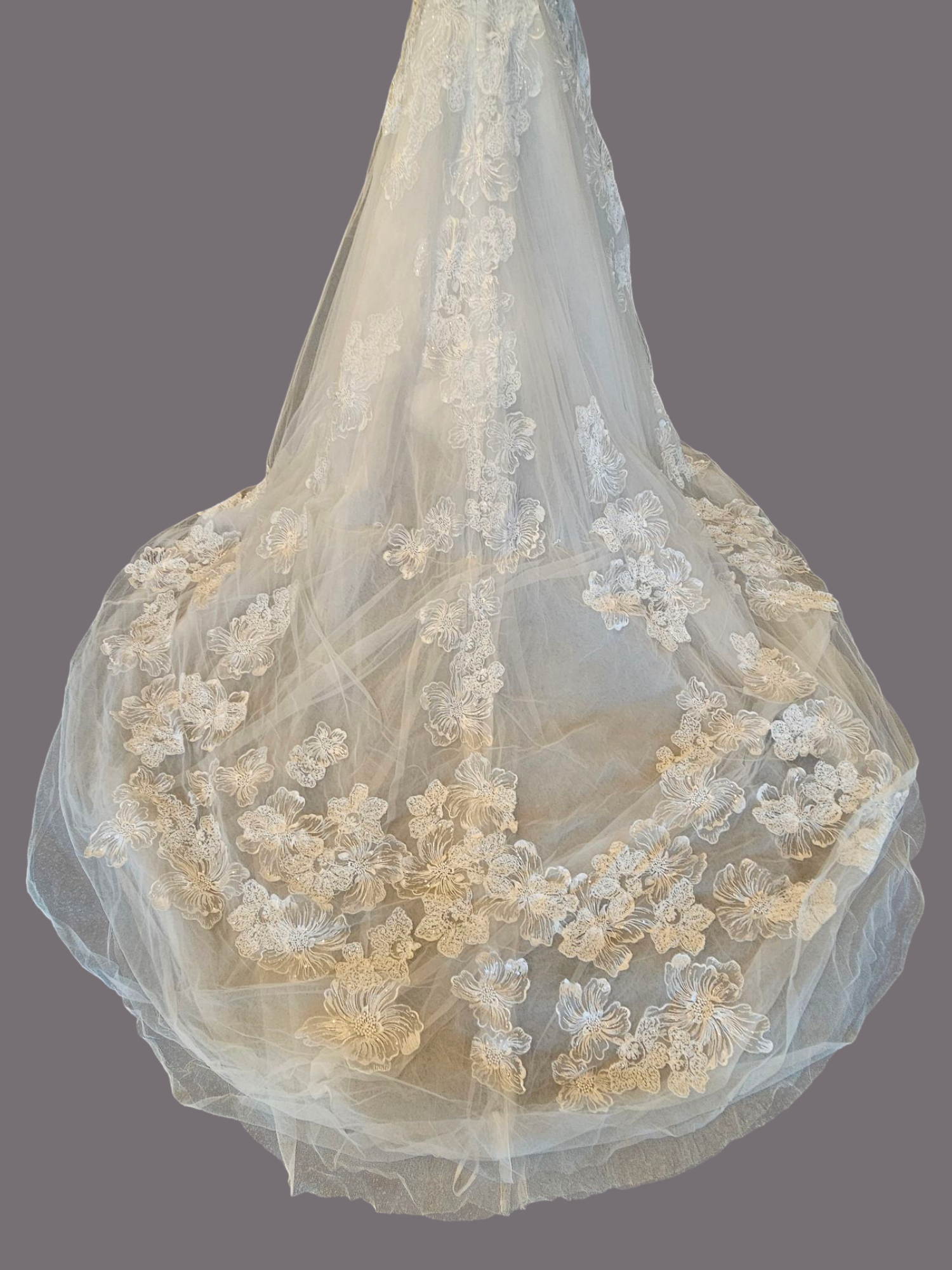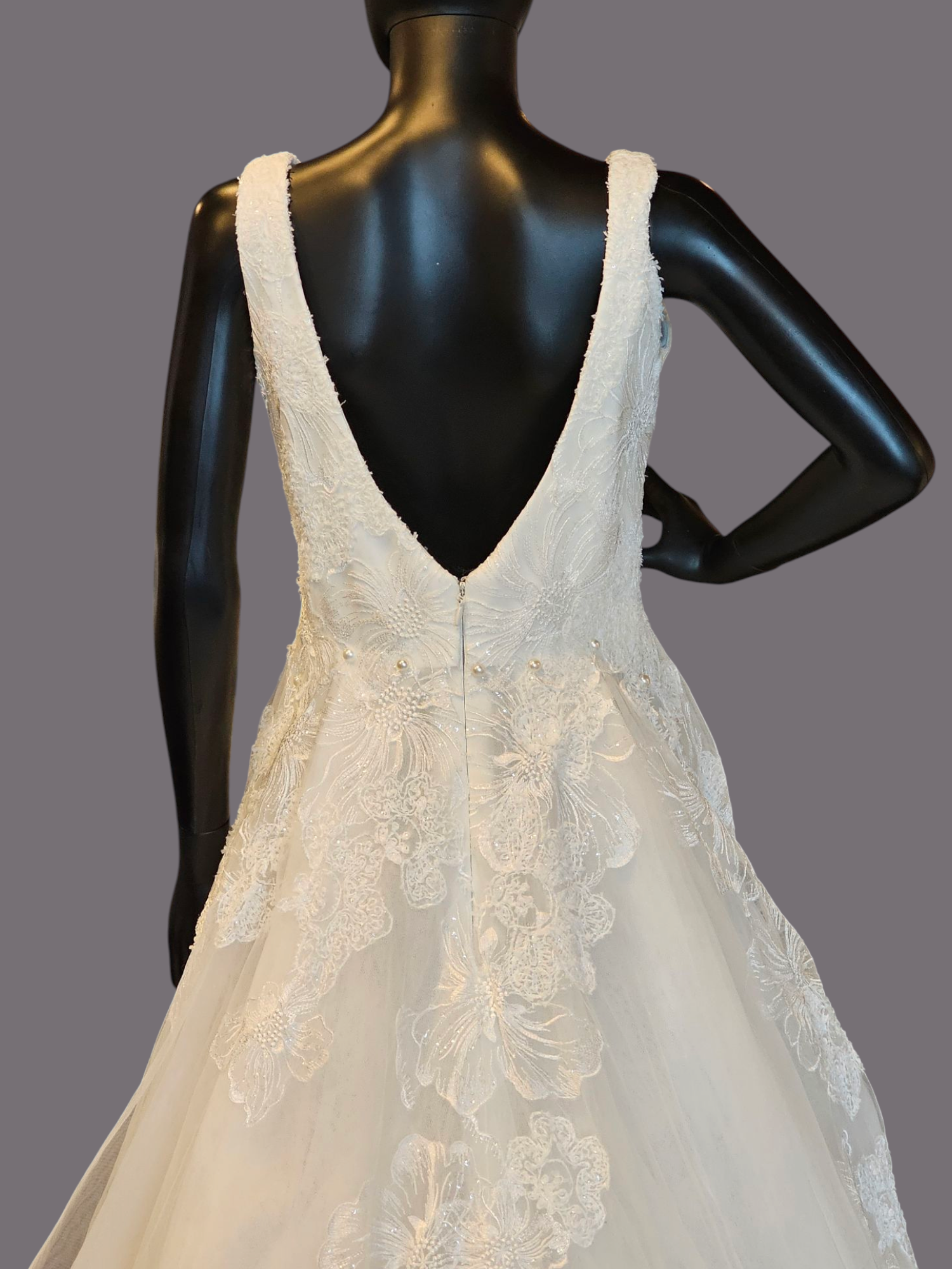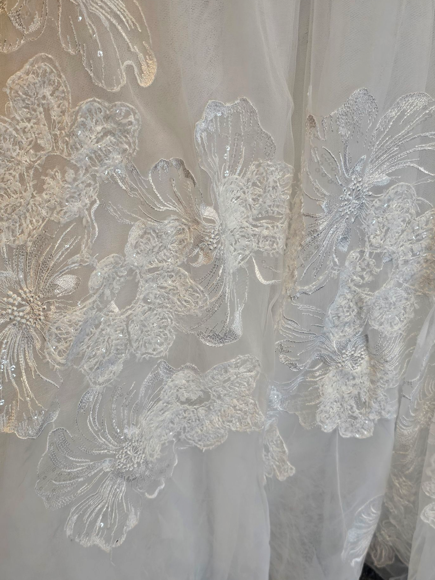 This exquisite wedding gown by Adrianna Papell features a breathtaking blend of stunning details, including a wide v-neckline and low open back. The a-line silhouette is enhanced by full tulle skirting, while the large scale floral embroidery with a touch of sparkle adds a touch of romance. Finished with an incredible cathedral train, this gown will make any bride feel like a princess on her special day.