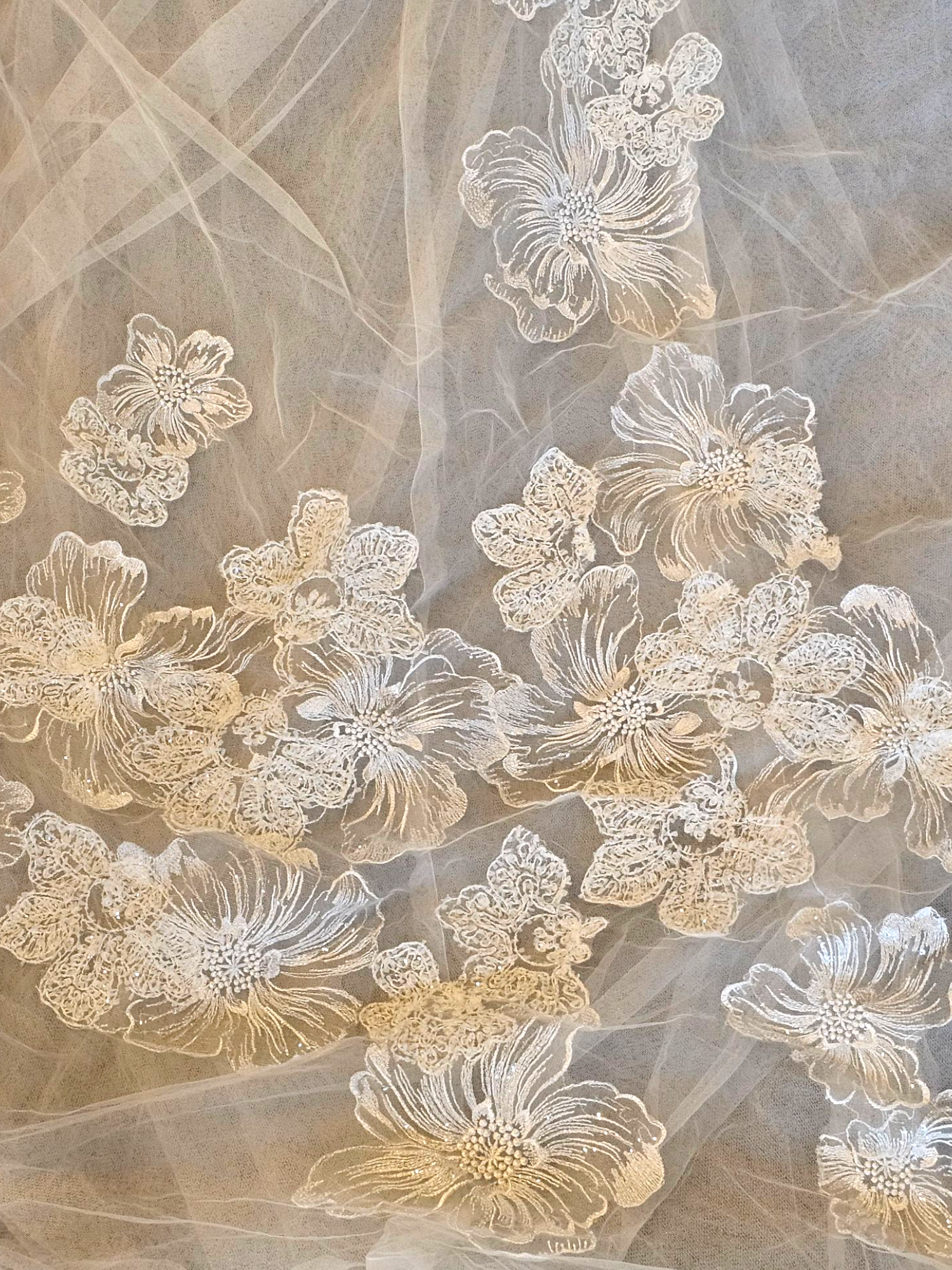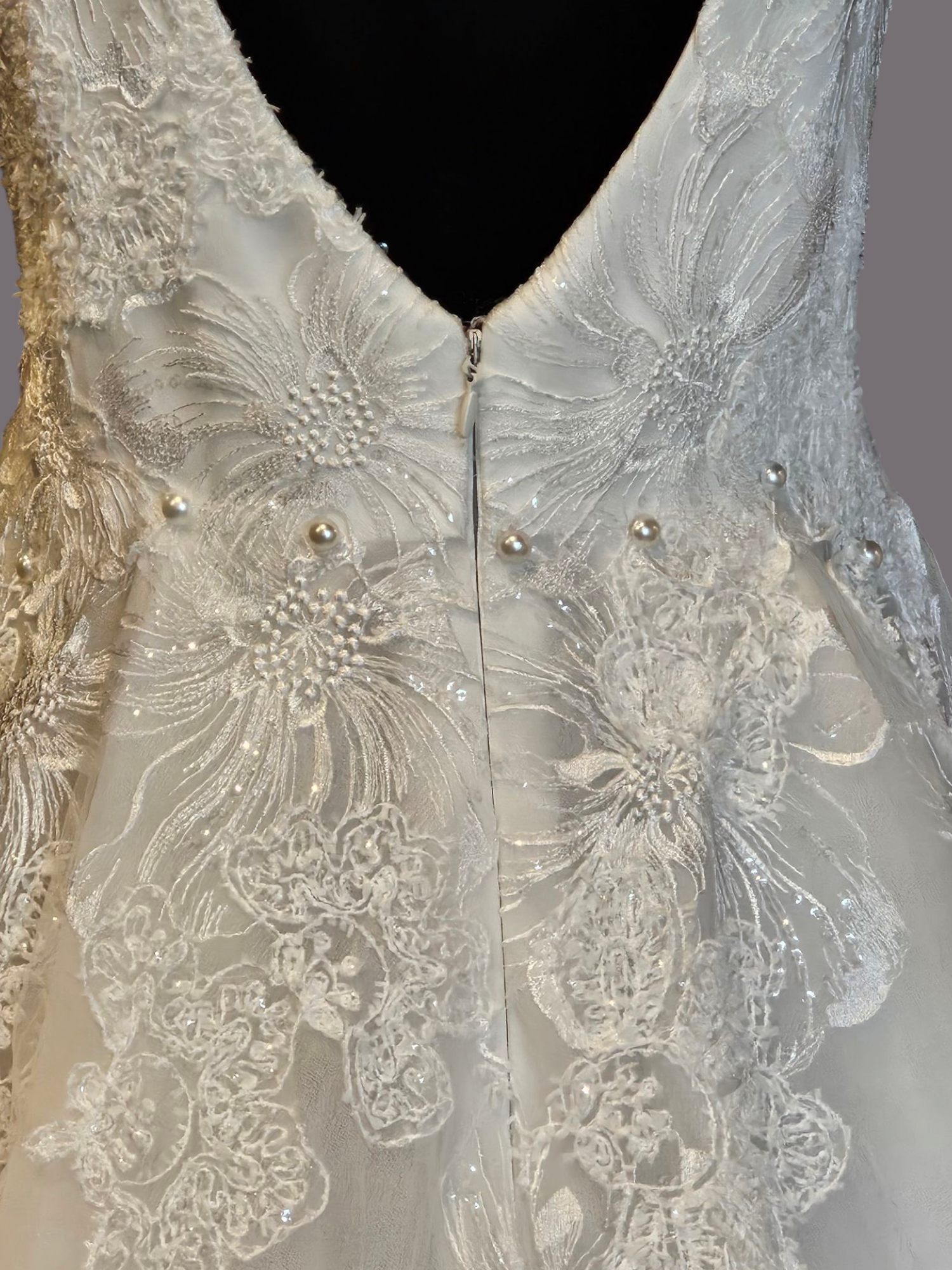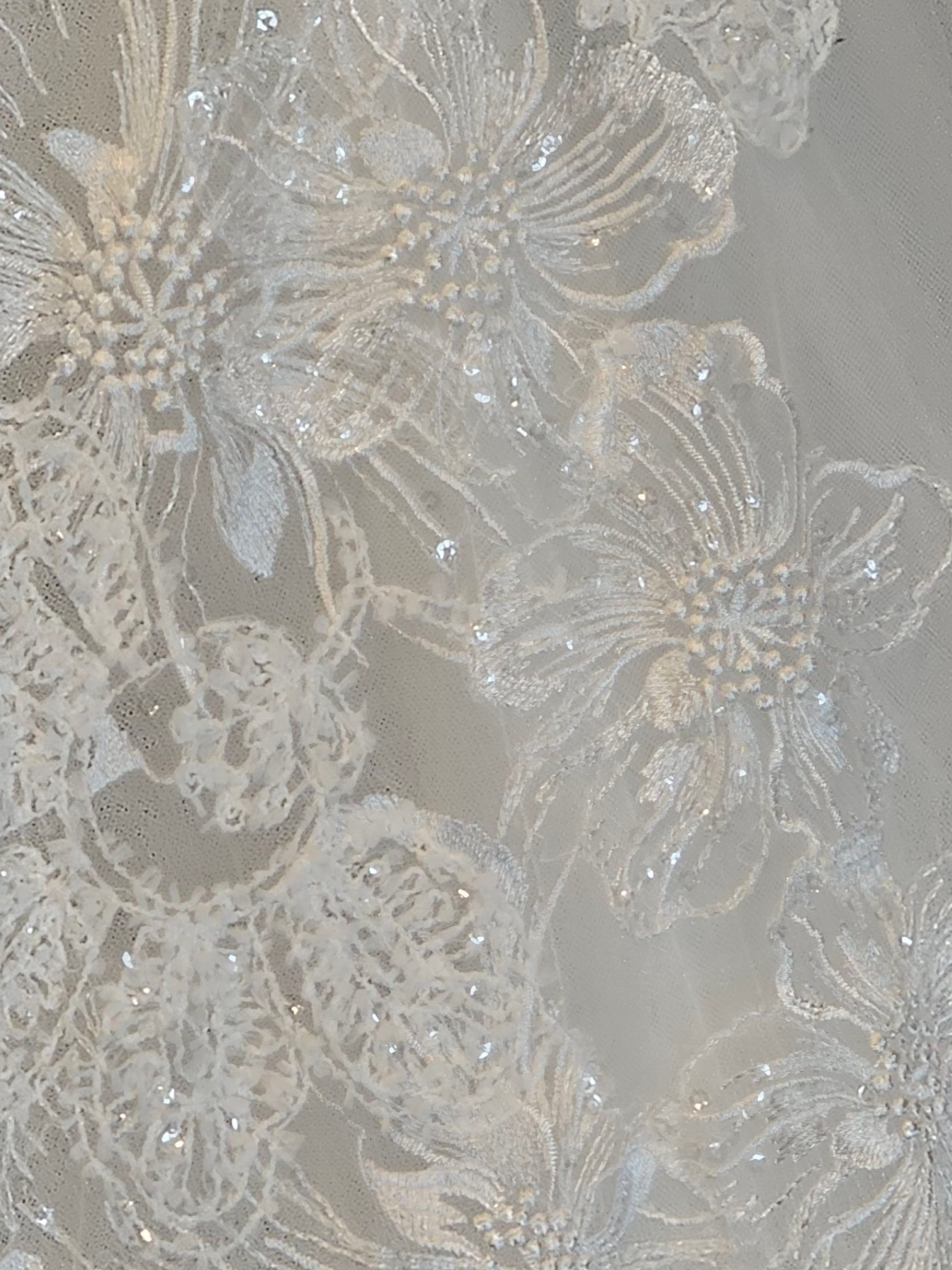 This exquisite wedding gown by Adrianna Papell features a breathtaking blend of stunning details, including a wide v-neckline and low open back. The a-line silhouette is enhanced by full tulle skirting, while the large scale floral embroidery with a touch of sparkle adds a touch of romance. Finished with an incredible cathedral train, this gown will make any bride feel like a princess on her special day.