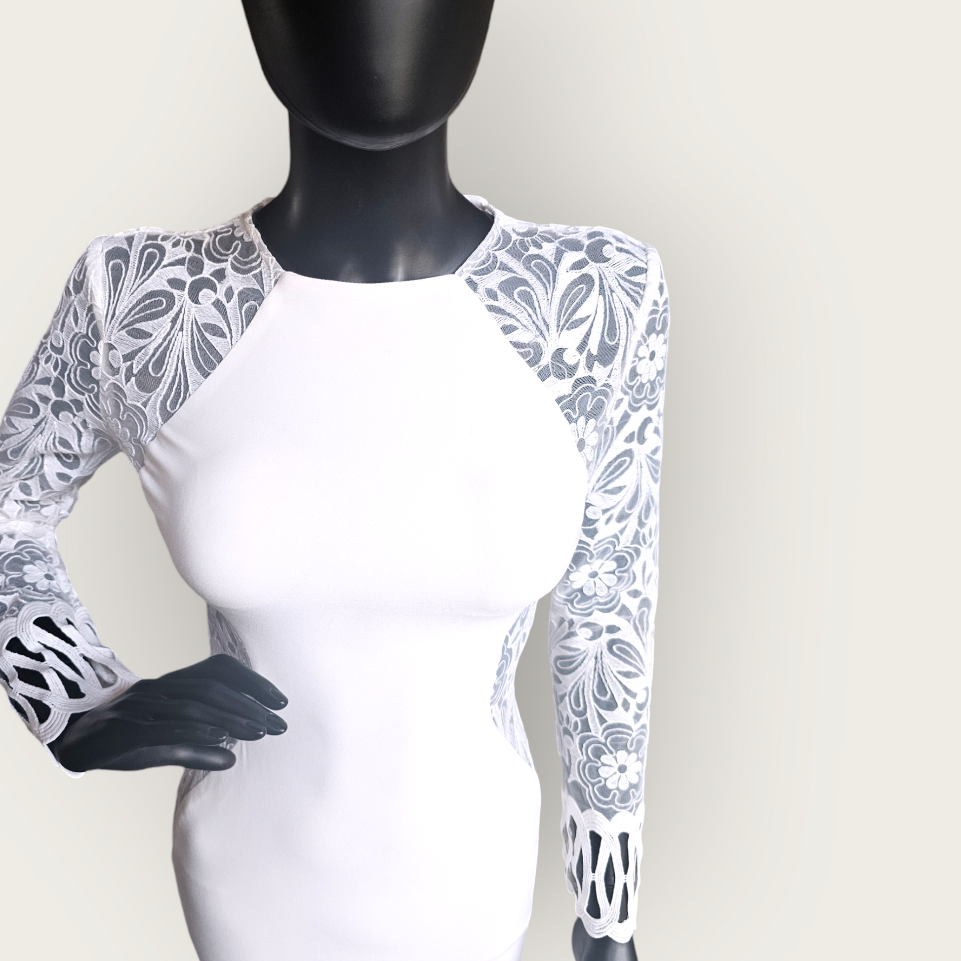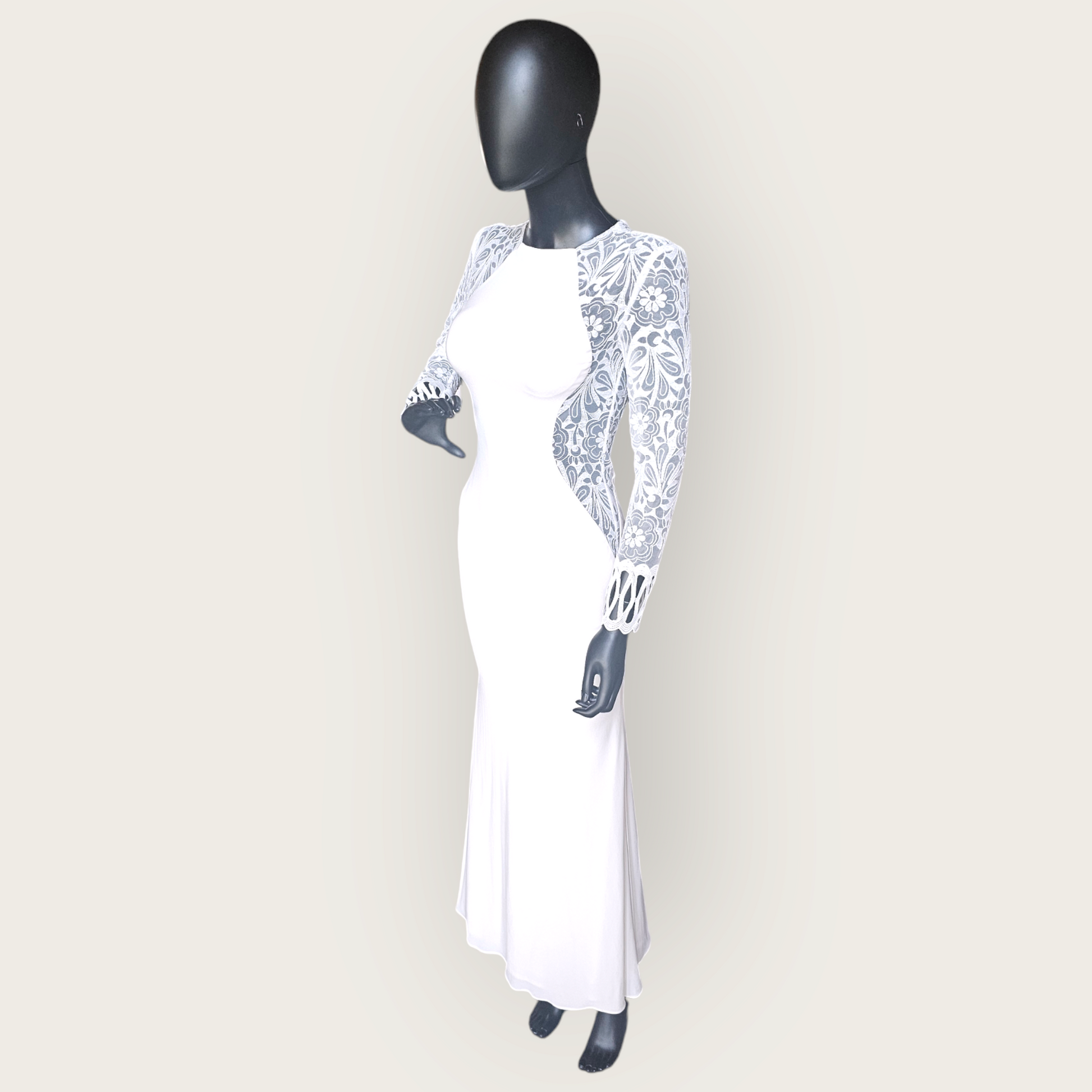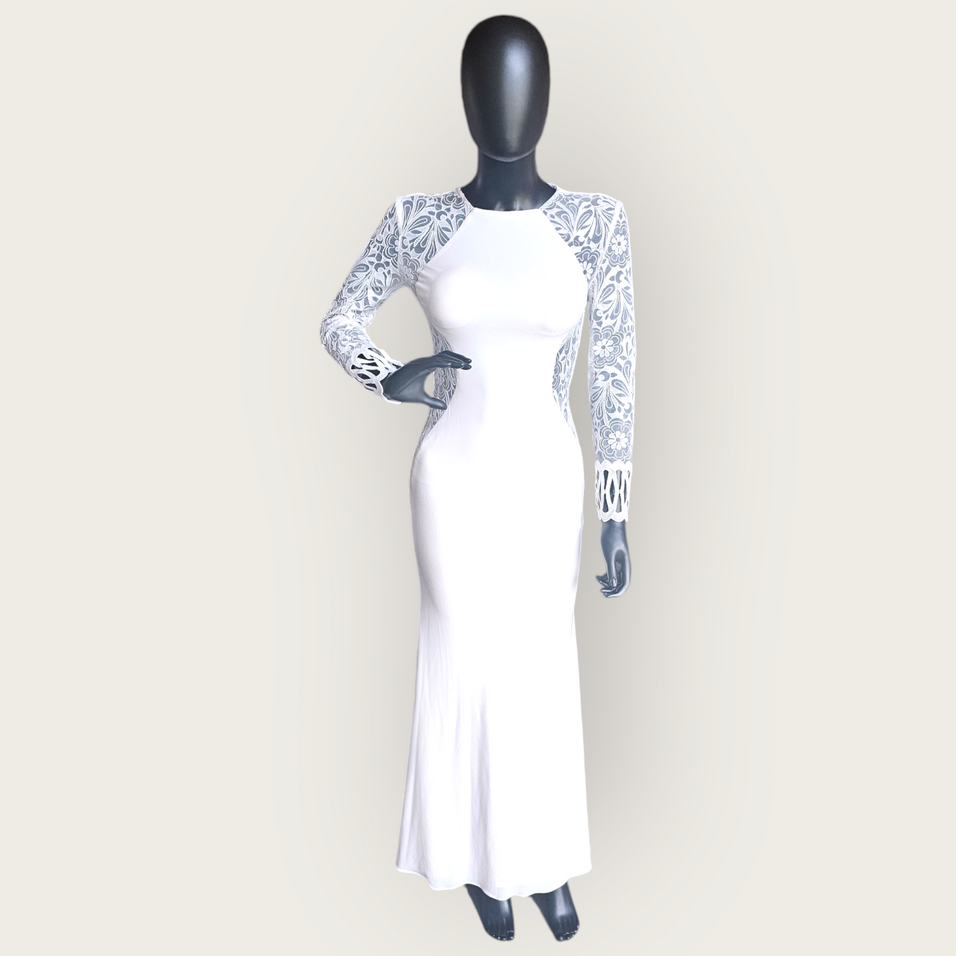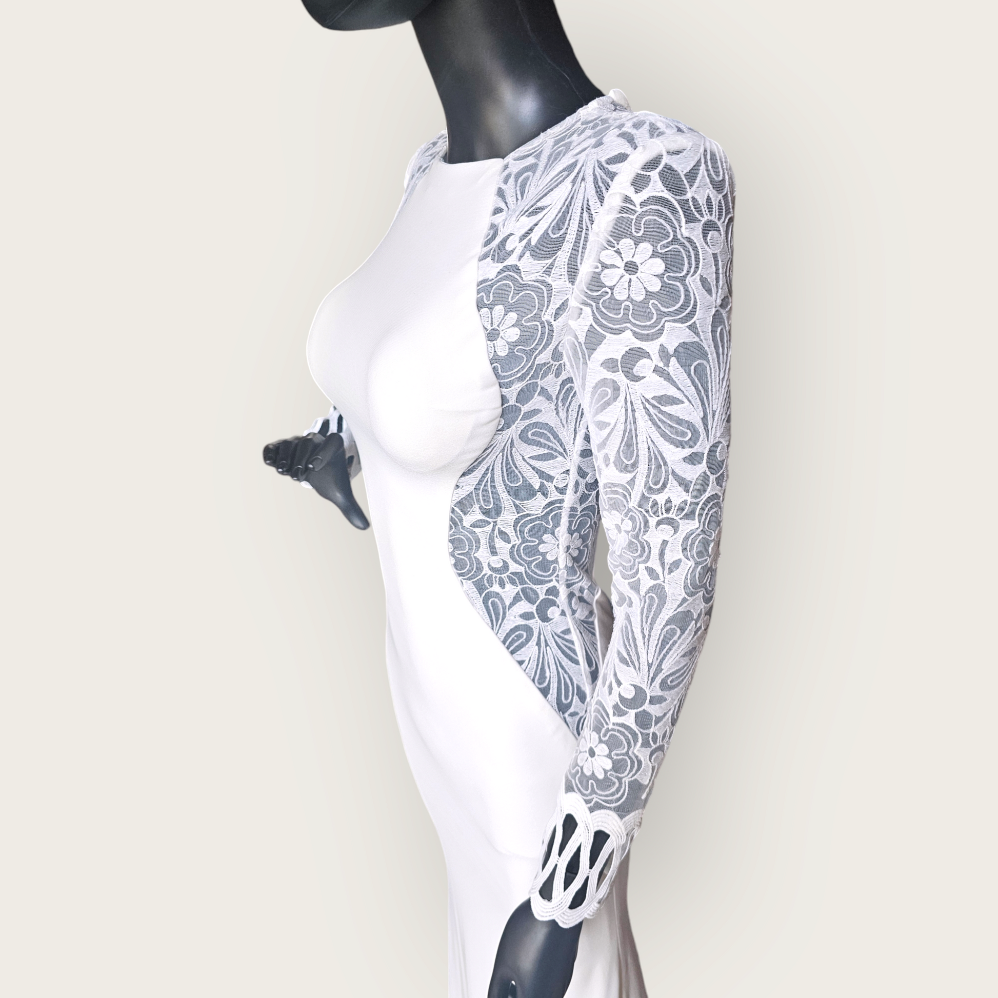 Indulge in luxury with our Lace Illusion Side Cutout Fitted Wedding Gown by Zoey Grey. The stretch jersey fabric offers exquisite comfort while the stunning details, including the jewel neckline and large floral embroidery, add a touch of elegance. The unique lace cut-out panels on the bodice and back complete the fitted silhouette, creating a one-of-a-kind wedding gown with no train. Make a statement on your special day with this exclusive piece.