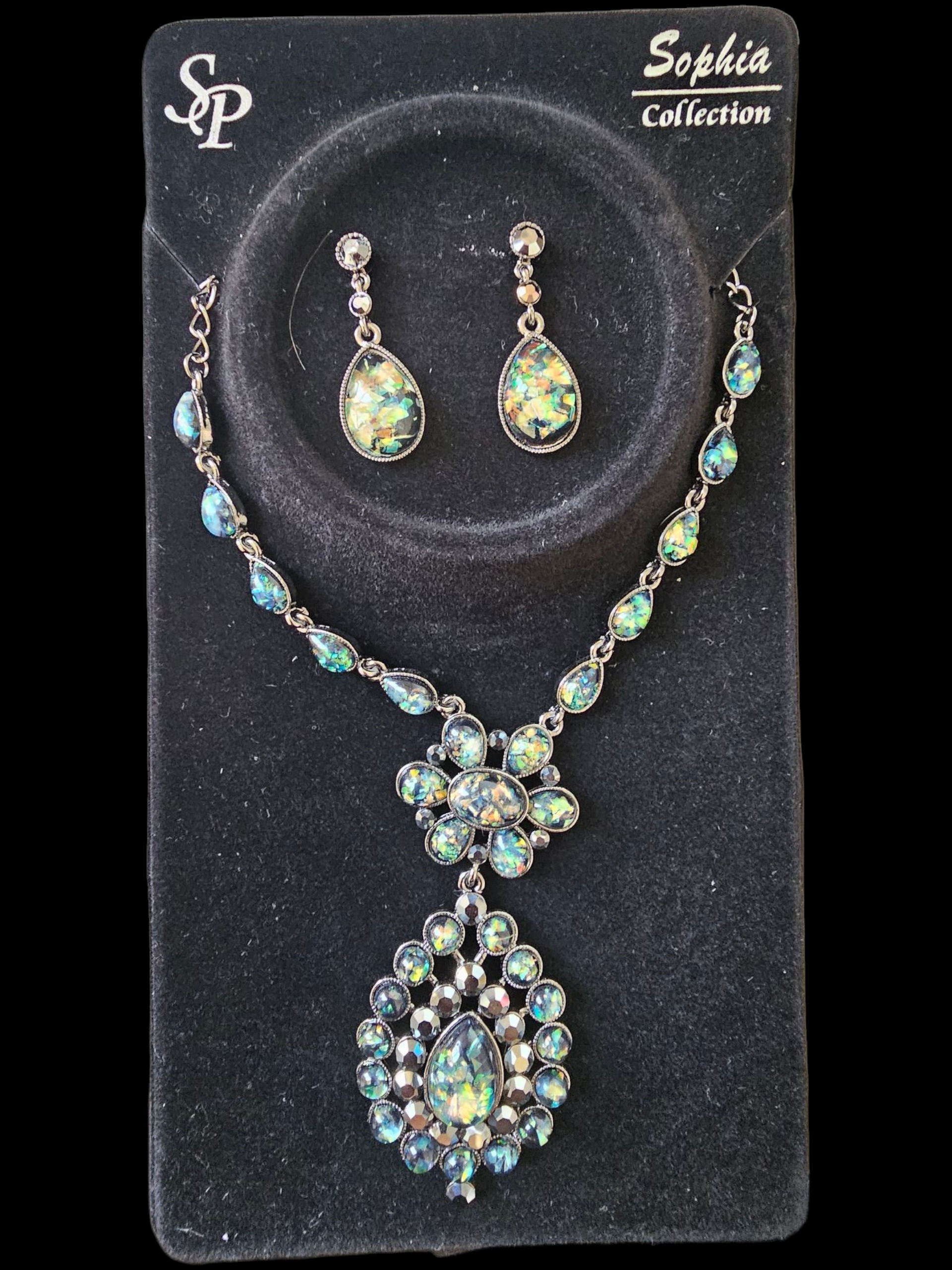 Burnished Silver Blue/Green Resin Necklace/Earring Set