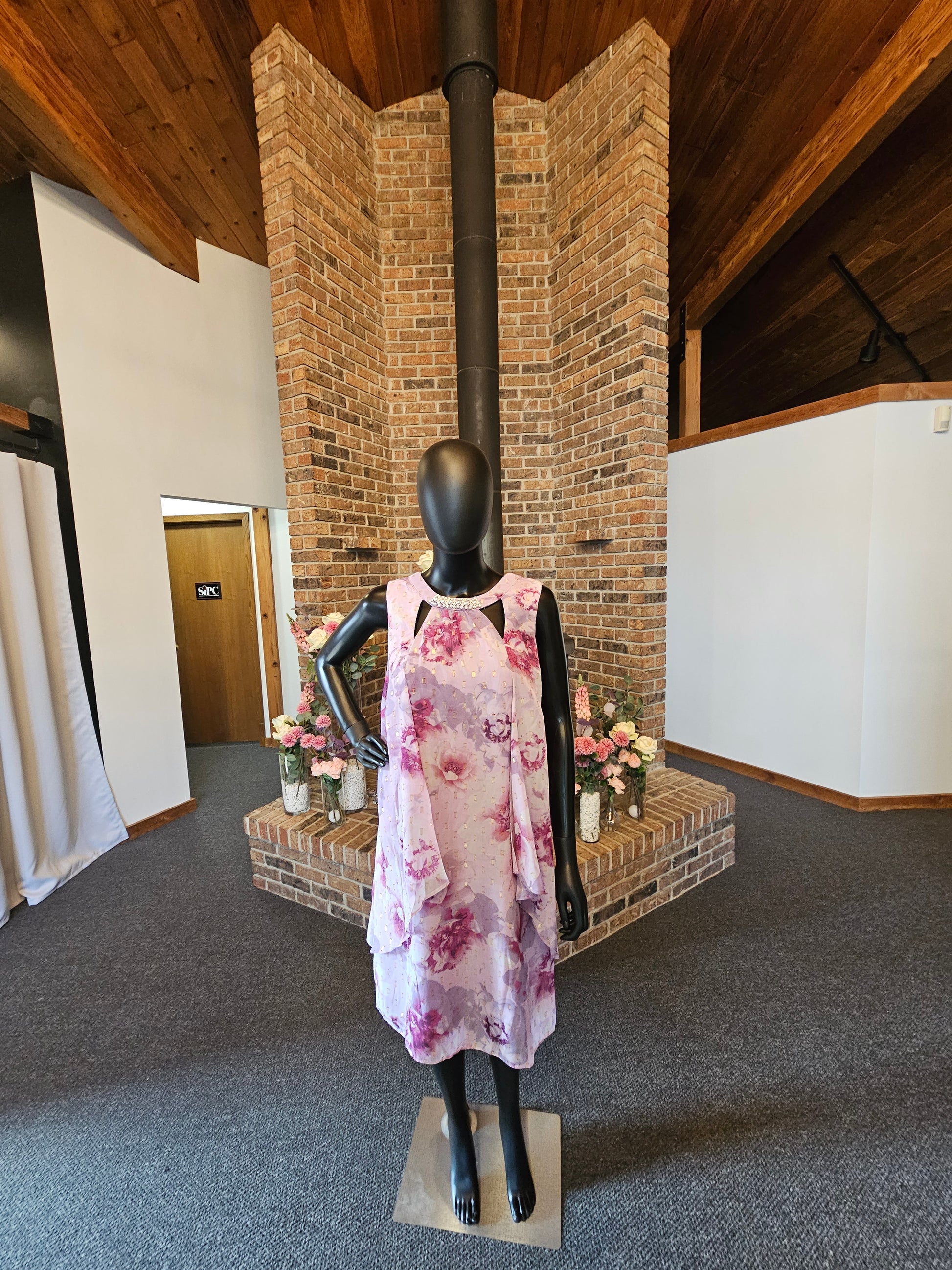 This stunning gown is traditional and chic. The light lavender base is covered with vibrant pink and magenta flowers. The neckline is supportive and decorated with crystals and geometric cutouts. This gown falls to the knees for a breathable and elegant look.