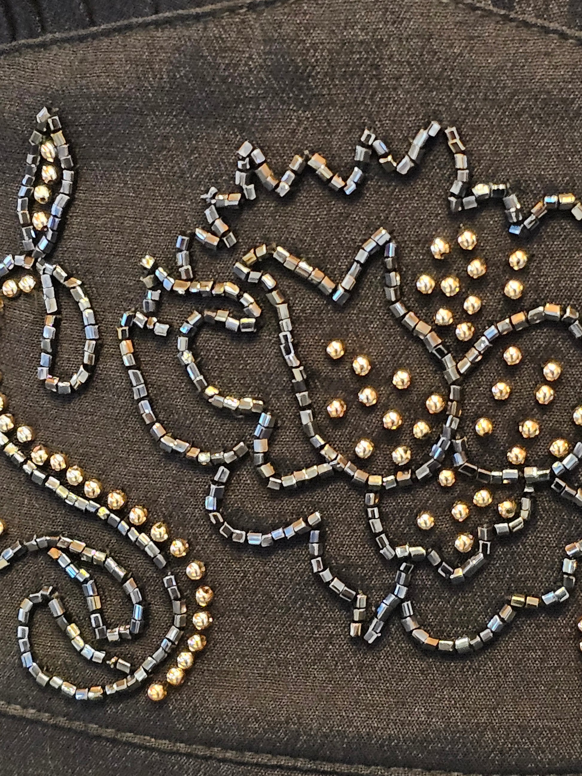 This lovely little dress features silky black fabric, a cinched waist seam decorated with beaded flowers and a flowing full skirt. Button details down the front of the skirt and along the back.