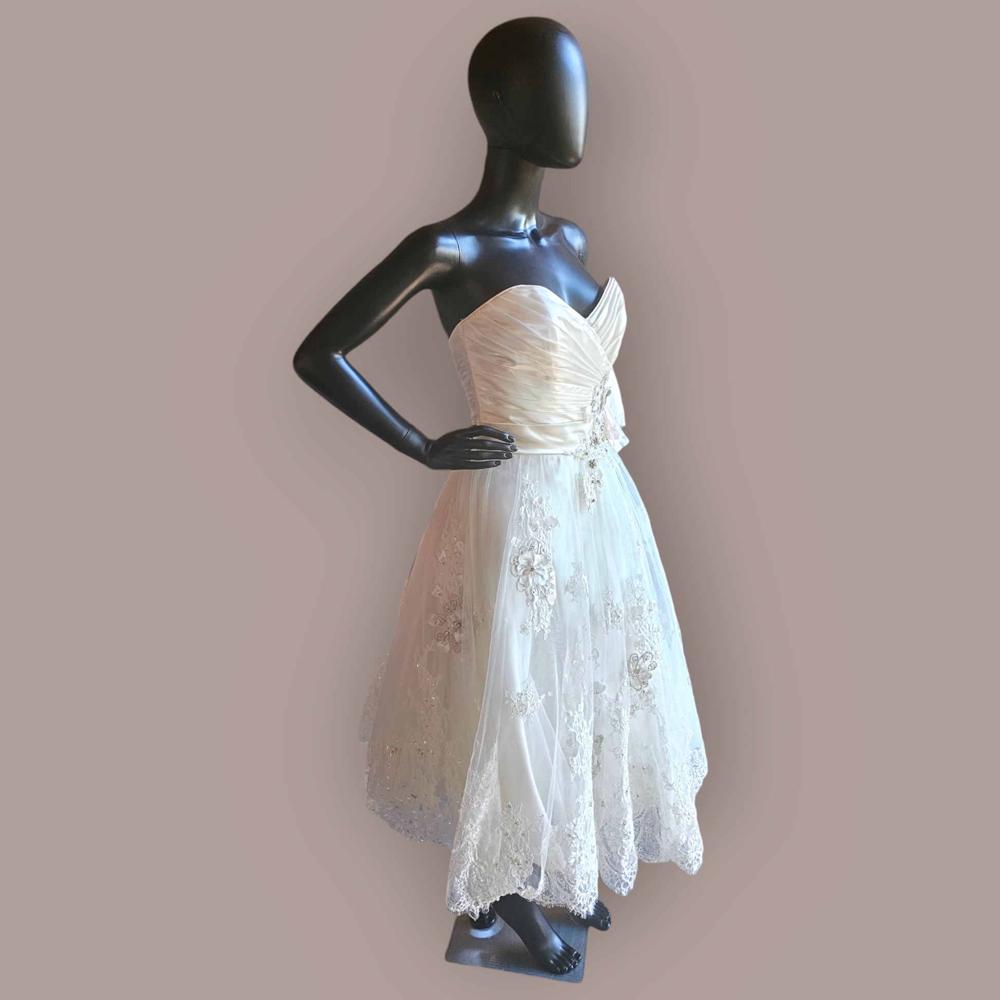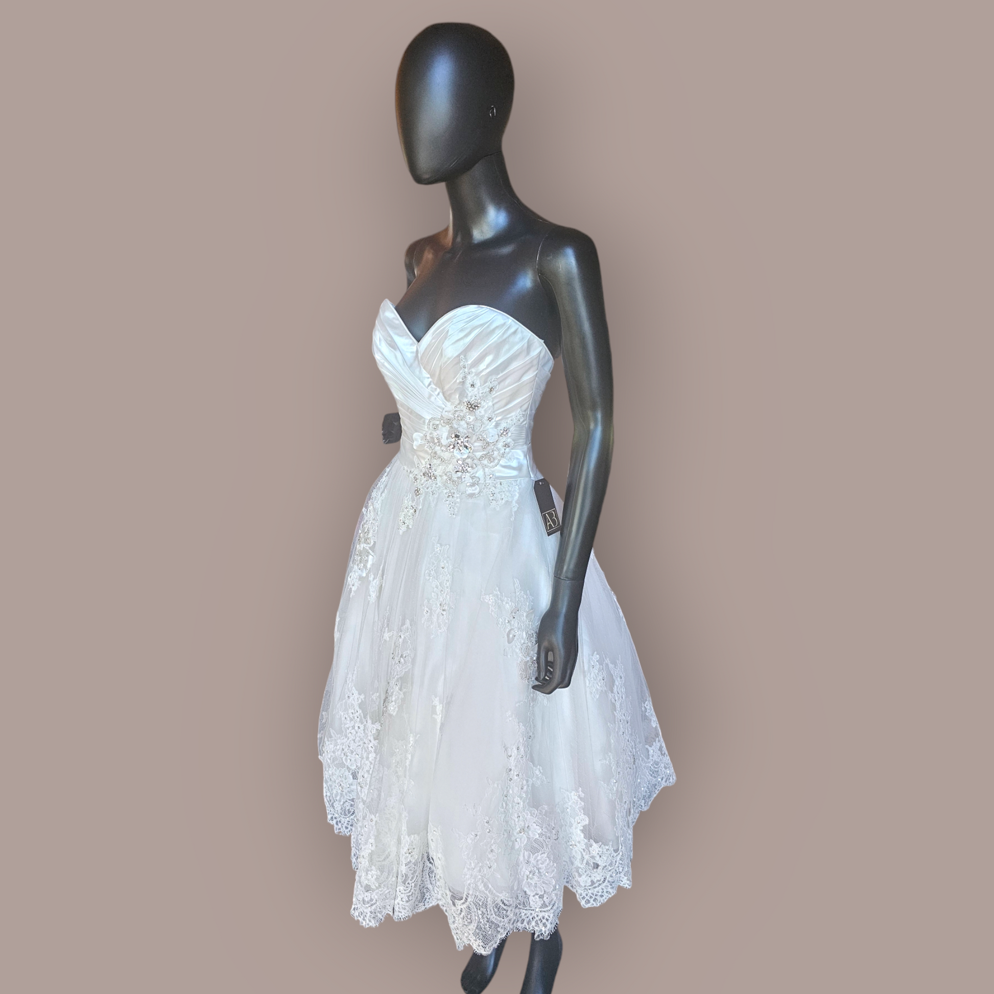 This Maggie Sottero mid-length wedding gown features a sweet and lovely design with a satin sweetheart neckline and side ruched bodice. The full skirt is adorned with a delicate lace overlay and accented with silk flowers, crystals, and beads. An elegant choice for any bride looking for a touch of romance on her special day. Maggie Sottero Mid-Length Wedding Gown
