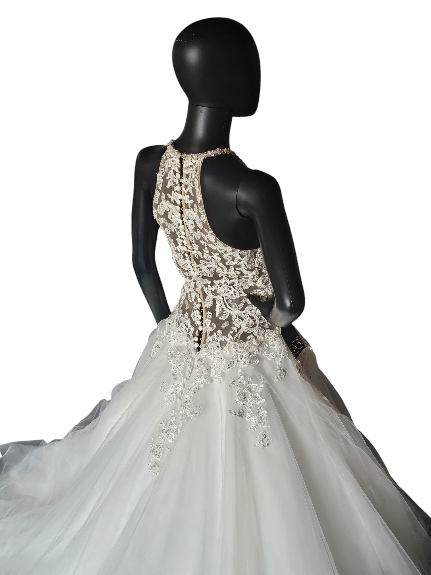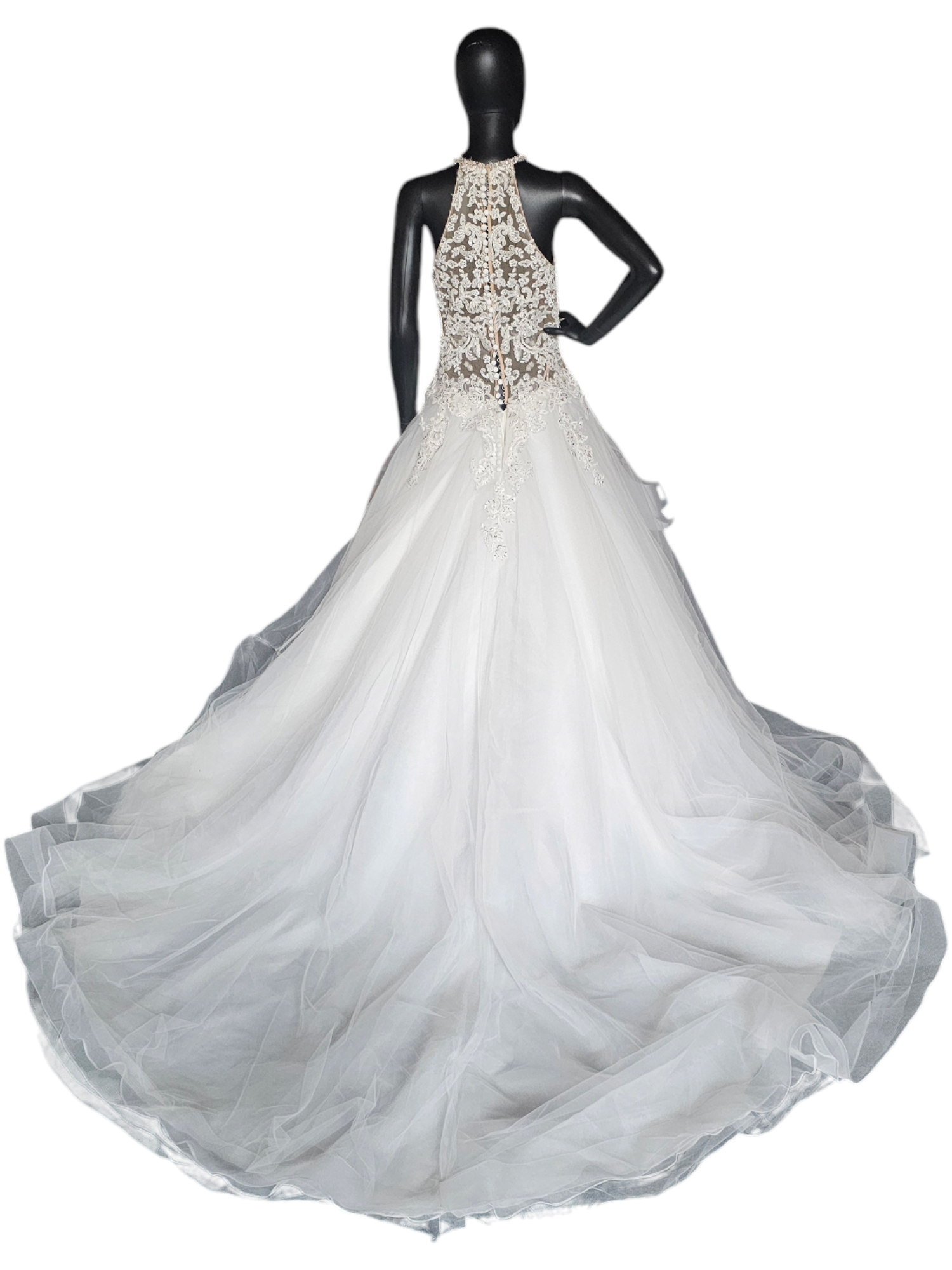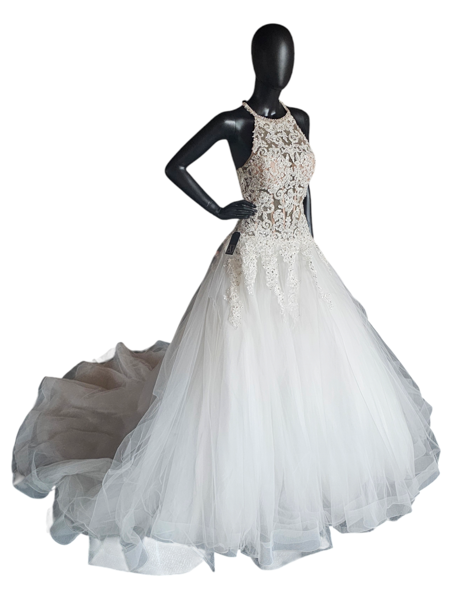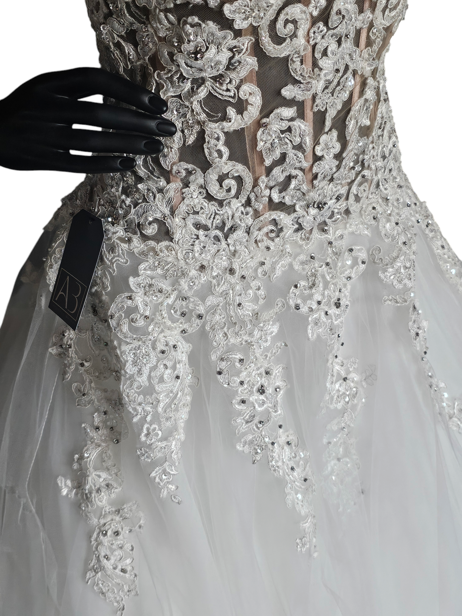 This gown has original sell tags on it but it does have damage to the outer layer of tulle. There are rips in a few different spots - they are difficult to photograph due to gauzy nature of the tulle. On the plus side, there is so much tulle they are actually difficult to see in person too! The price of this gown reflects the damage. There are lots of options to repair but this gown is being sold in AS-IS condition.