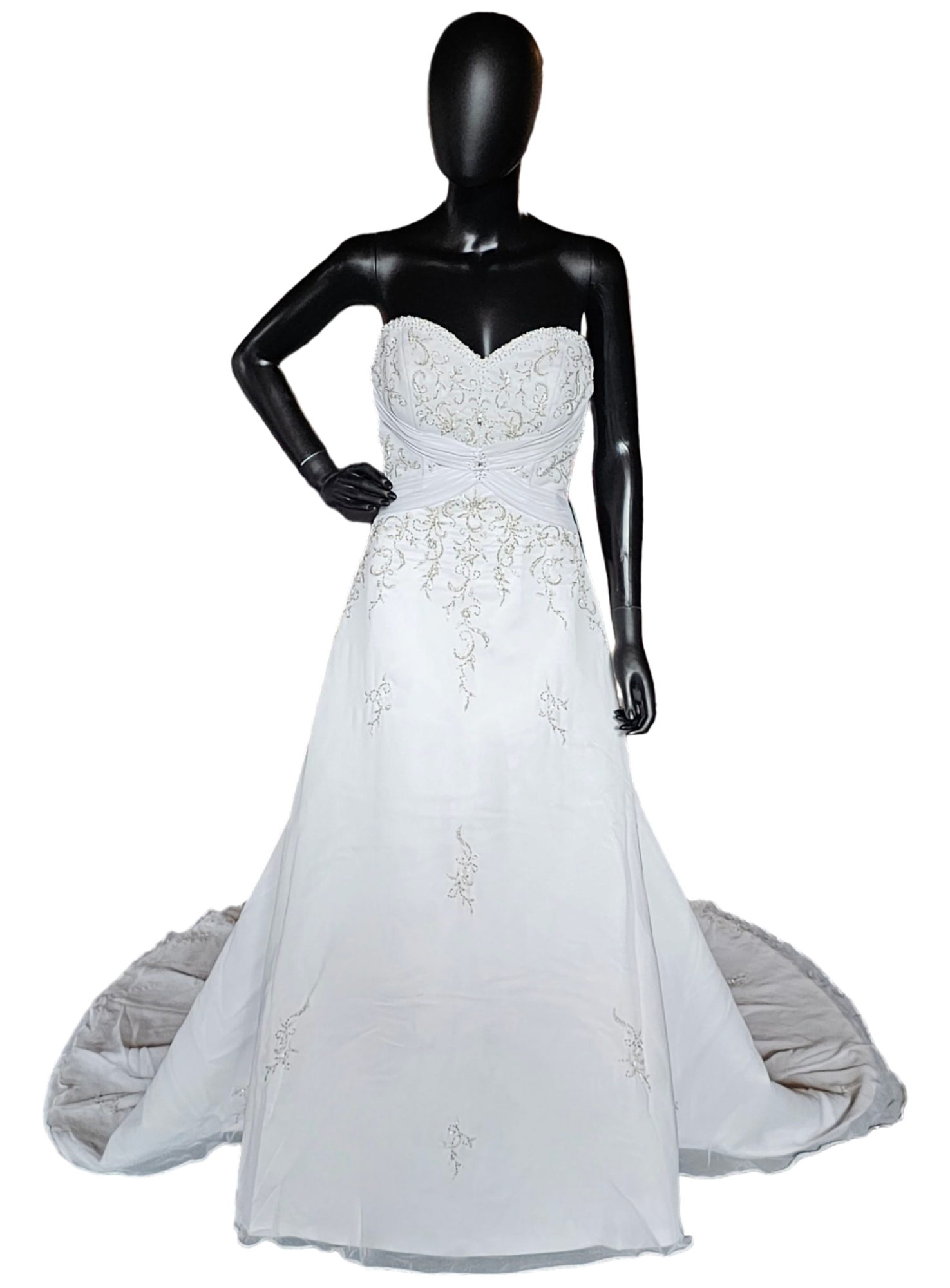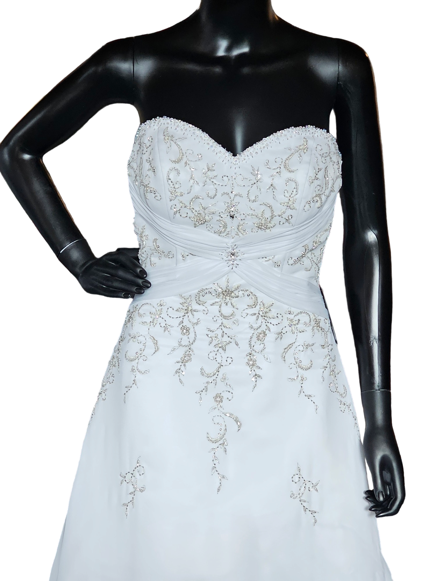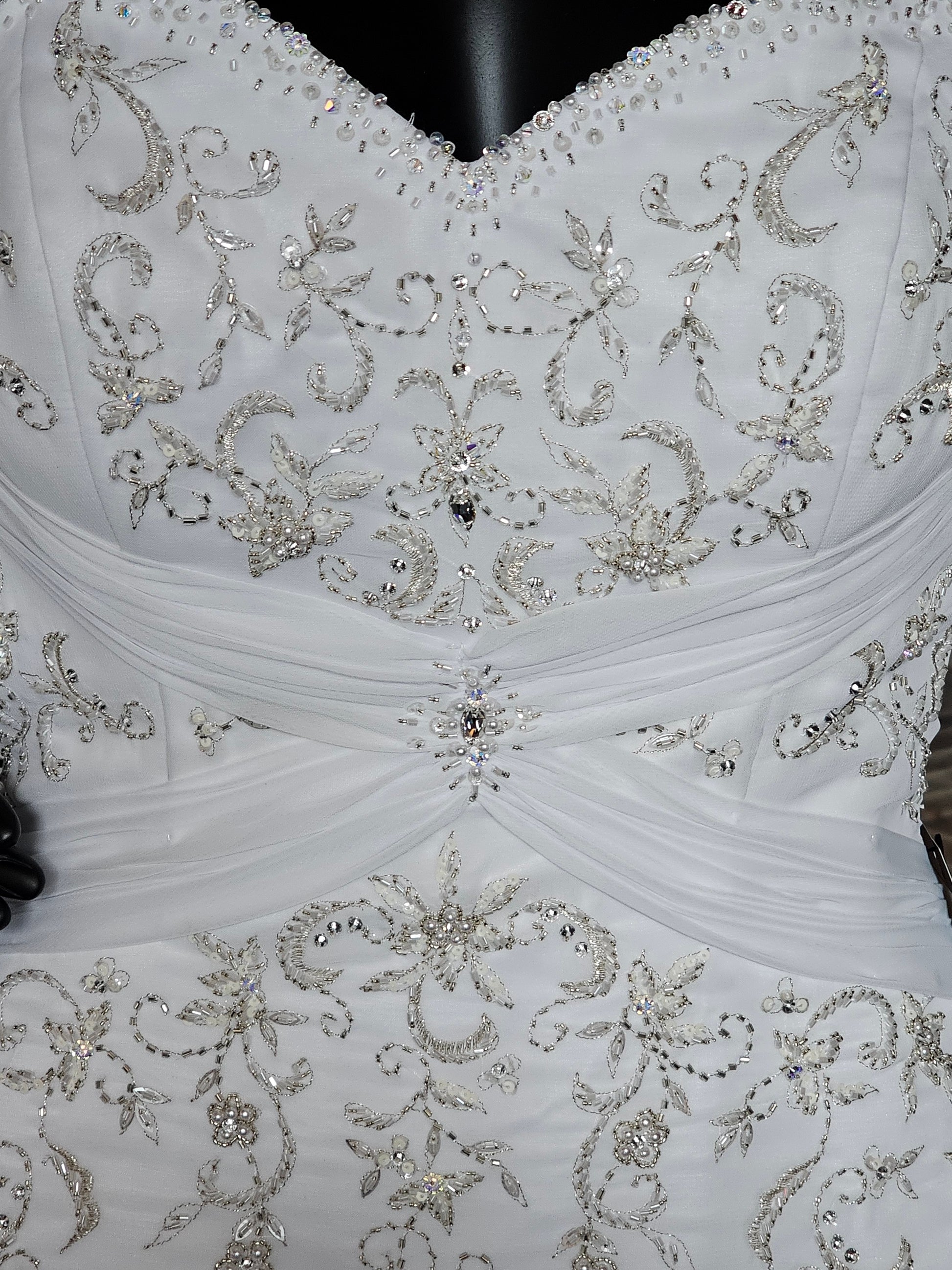 This classic and elegant wedding gown has just the right amount Sparkle- not too much, not too little. The bodice features a ruched X accentuating the curves and underscoring the sweetheart neckline and the metallic thread filigree embroidery along the bodice. The corset lace back gives every body type the perfect fit! The whole gown has a soft chiffon overlay which gives a hint of flowy movement. The cathedral train is a show stopper.