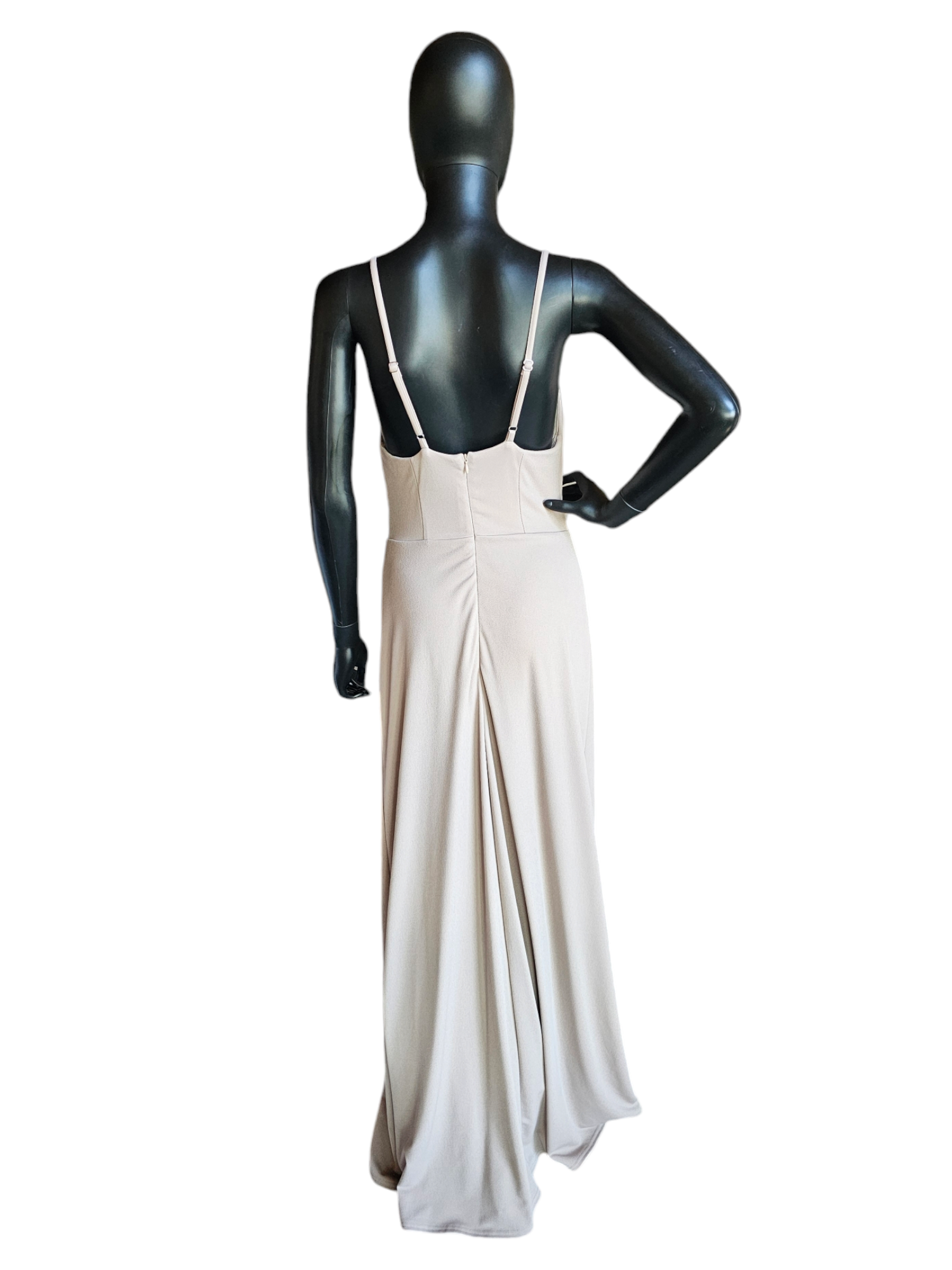 This elegant formal gown features a sleek, straight silhouette that flatters any figure. The stretch crepe is comfortable and the softly muted lavender color is beautifu. The cowl neckline adds a touch of sophistication, while the spaghetti straps provide comfort and support. With a side slit, this gown allows for easy movement and showcases a hint of leg. Perfect for any formal occasion, this muted lavender stretch crepe dress is sure to make a statement.Muted Lavender Stretch Crepe - Birdey Grey