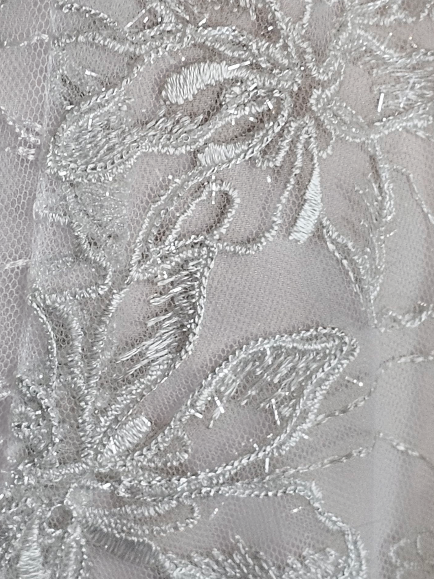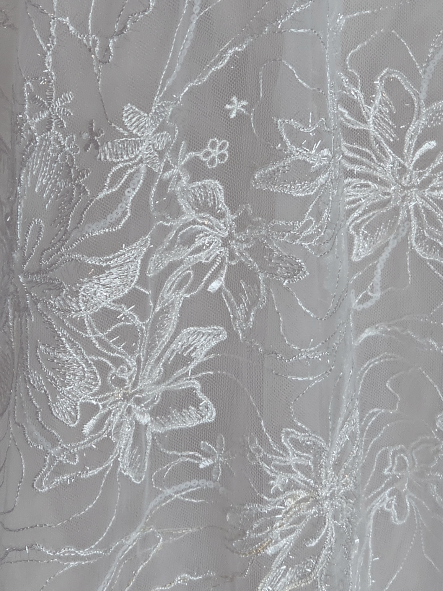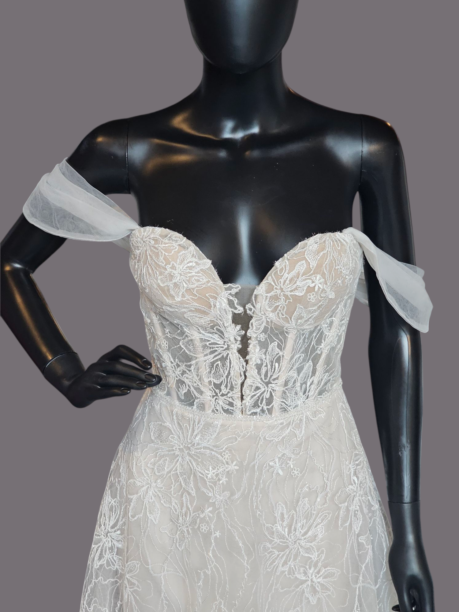 Elevate your wedding day look with our Natural Waist Off Shoulder Vintage Rose Embroidered Wedding Gown. This stunning dress features an illusion bodice with exposed corset boning, delicately embroidered floral details with subtle sequins, and a plunging sweetheart neckline for a touch of allure. The softly sweeping off shoulder removable straps add an elegant and customizable touch to the a-line silhouette. Make a statement on your special day with this one-of-a-kind gown.