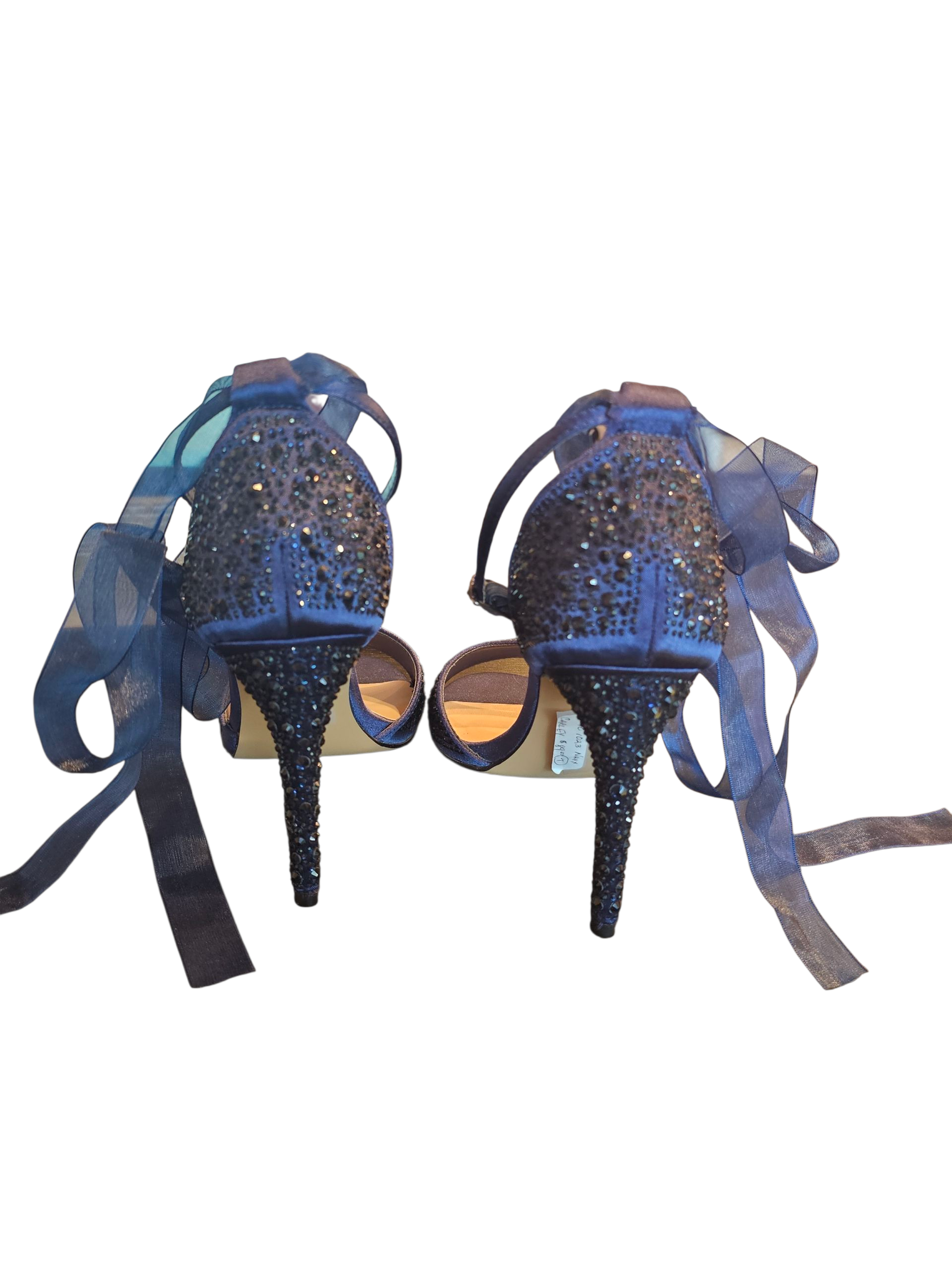 These stunning shoes are brand new in the box. Features crystals and an organza ankle ribbon tie for extra pizazz.