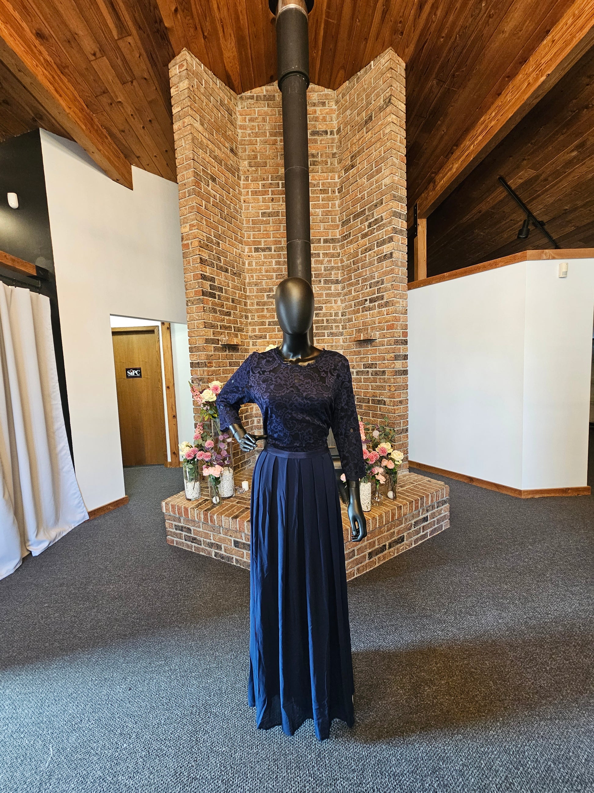 This elegant navy gown is a staple of mother's dresses and bridesmaids gowns. The regal lace top continues down the 3/4 sleeves and flairs naturally around the neckline. The skirt is simple pleated material for a comfortable and modest fit.