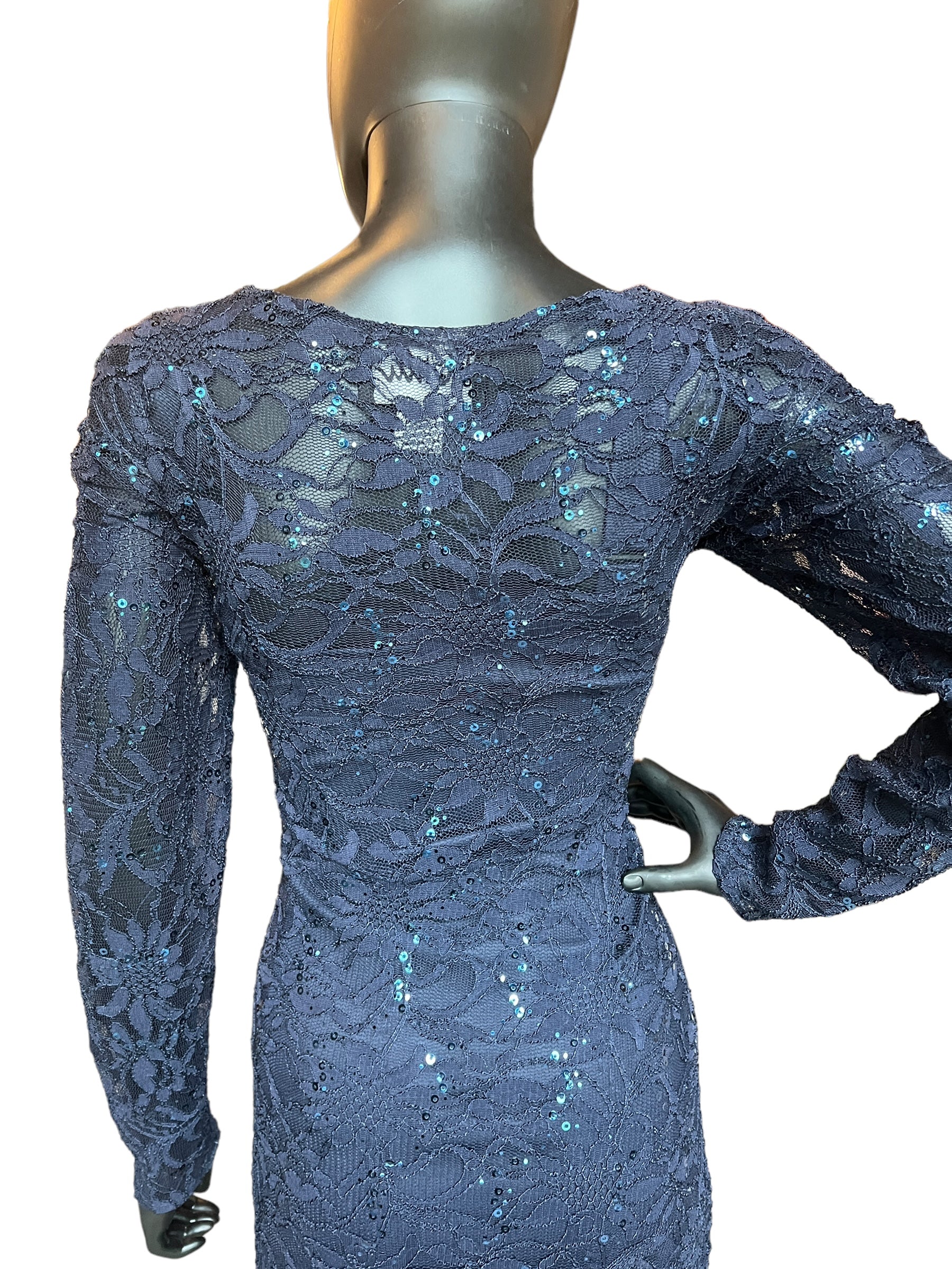 Indulge in luxury with our Navy Lace Cocktail Long Sleeve dress. The stunning lace overlay and shimmering blue sequins throughout will catch eyes as you dance the night away. The illusion bodice and full swing skirt add a touch of elegance to this mid length dress. Embrace your inner goddess in this exquisite piece!