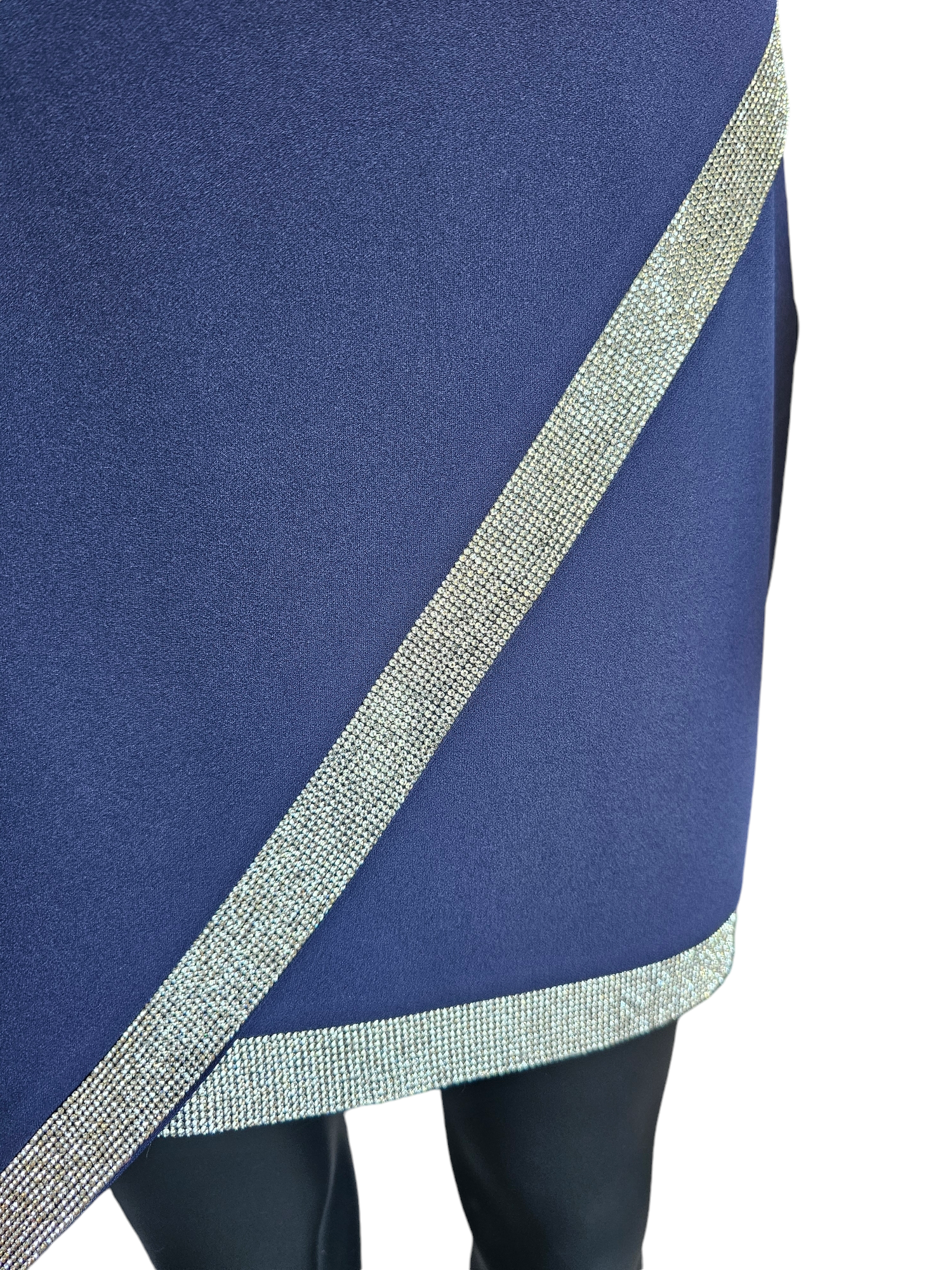 Expertly crafted with fitted stretch crepe, this Navy/Rhinestone Off Shoulder Cocktail dress will highlight your figure and elegantly drape off your shoulders. The asymmetrical rhinestone hem adds a touch of glamour, making it the perfect choice for any cocktail event. Make a statement with this stunning dress.Navy/Rhinestone Off Shoulder Cocktail