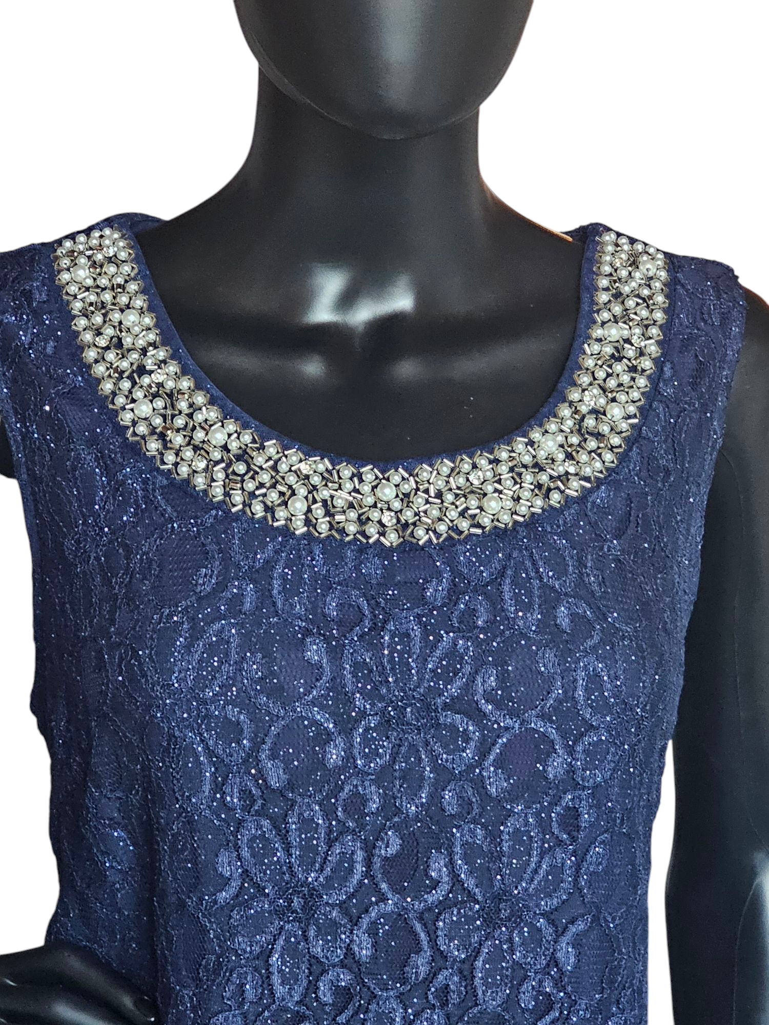 Elevate your cocktail attire with our Navy Sparkle Lace Cocktail/Jacket. Featuring a richly colored lace with a touch of sparkle and a beaded round collar, this dress exudes elegance. The cocktail length adds a touch of sophistication, while the matching chiffon 3/4 sleeve jacket provides versatility and coverage. Perfect for any special occasion.