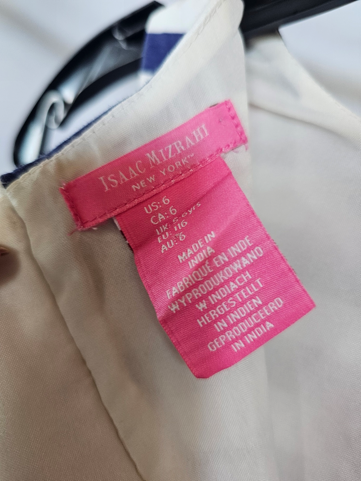 This child's dress features a classic navy and white horizontal stripe pattern, accented with vibrant hot pink peonies. With a comfortable crew neckline, it highlights a gathered waist and pink sash for a flattering fit. Perfect for any occasion, this mid-length dress is a stylish addition to any wardrobe.