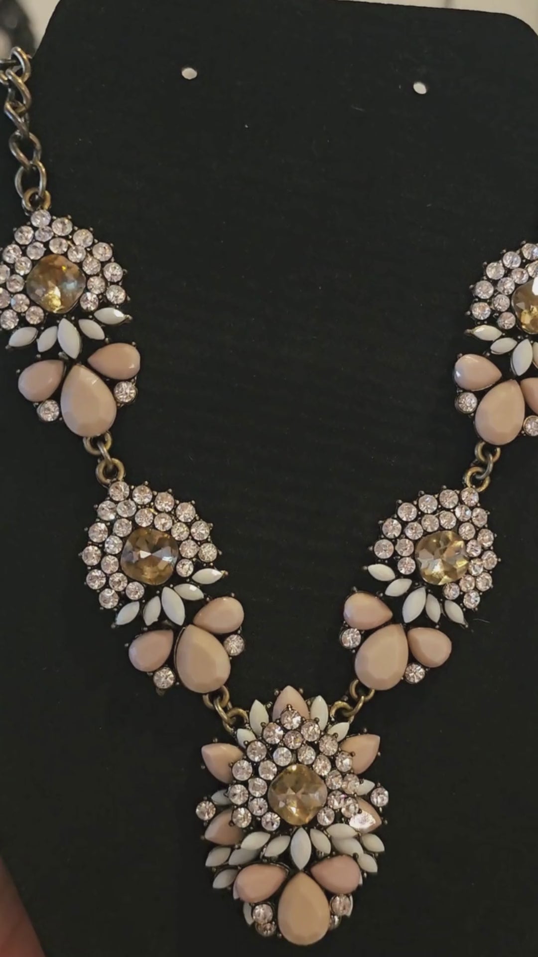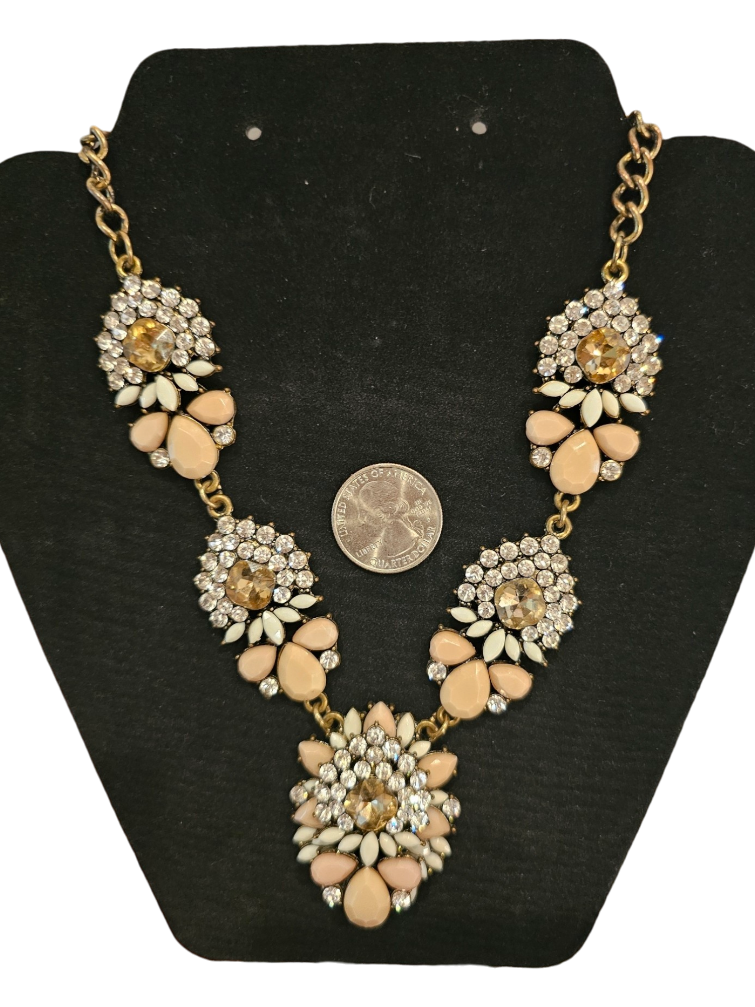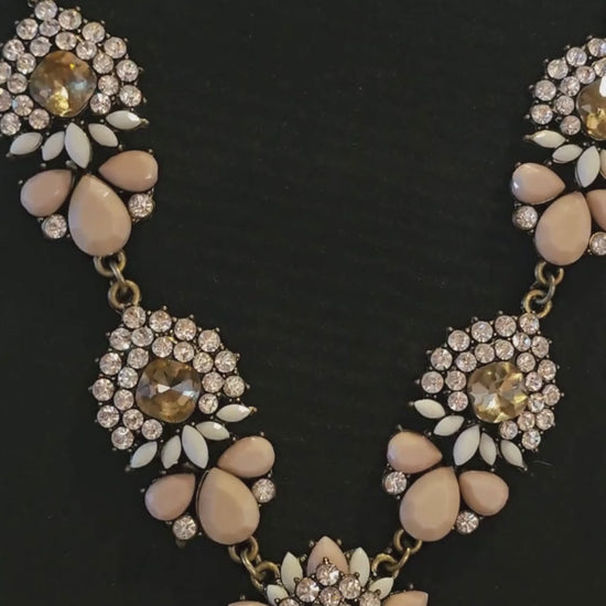 The fantastic Nude/White Crystal Art Deco Necklace wonderfully ties the natural structure of gemstones to the elegance of an organized pattern. The intricate centerpiece is structured around a copper gemstone forming a floral-like pattern. This necklace is a must for any special event, or to elevate an everyday look.