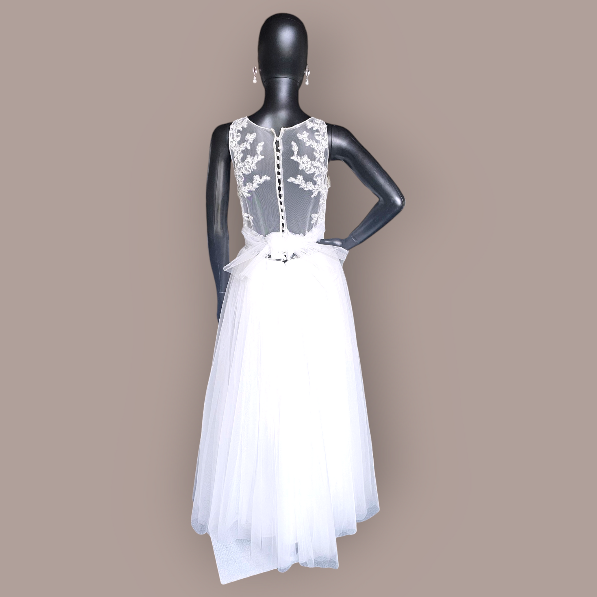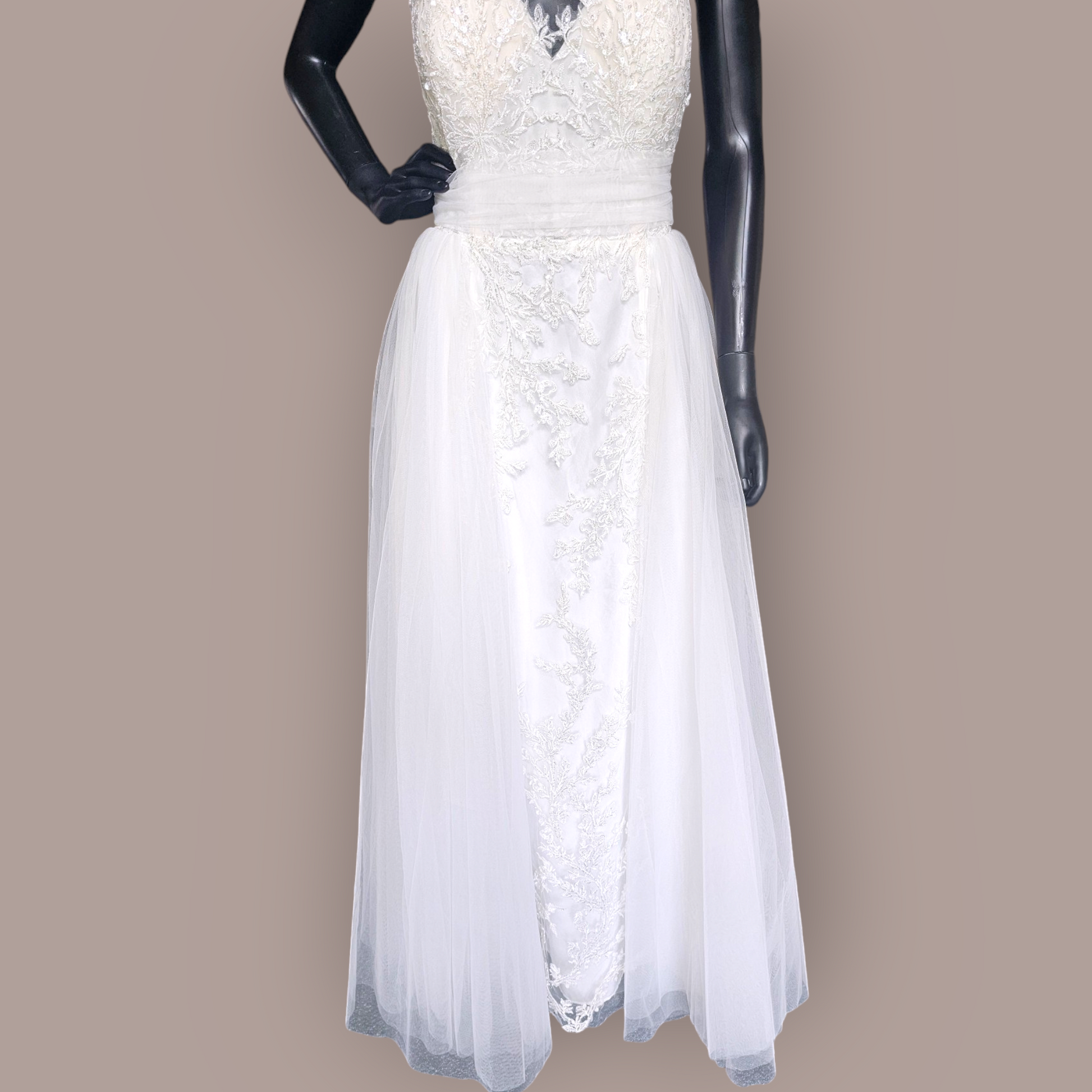 This fabulous Oleg Cassini gown has been redesigned and upcycled! The train was damaged and this beautiful wedding gown was destined for the landfill, but with a little imagination and time with our talented seamstress, we present this chic 50's inspired fitted gown. The original gown is a fitted silhouette with an illusion sweetheart neckline and open back. The sparkling beaded appliques add a touch of shimmer and drama. The full tulle overskirt is open at the front to show off the stunning fitted gown, but has a hip flounce that is flattering and stylish.