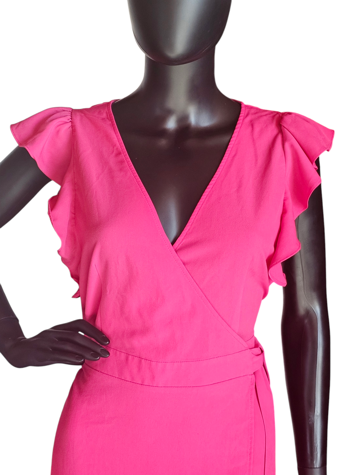 | Elevate your wardrobe with our Hot Pink Flutter Sleeve Wrap Mid-Calf Dress from Who What Wear. This fun and flirty dress features bright pink color and flattering flutter ruffle sleeves, while the wrap dress style with securing interior button and sophisticated mid-calf length adds elegance. Perfect for any occasion.Pink Flutter Sleeve Wrap Dress |