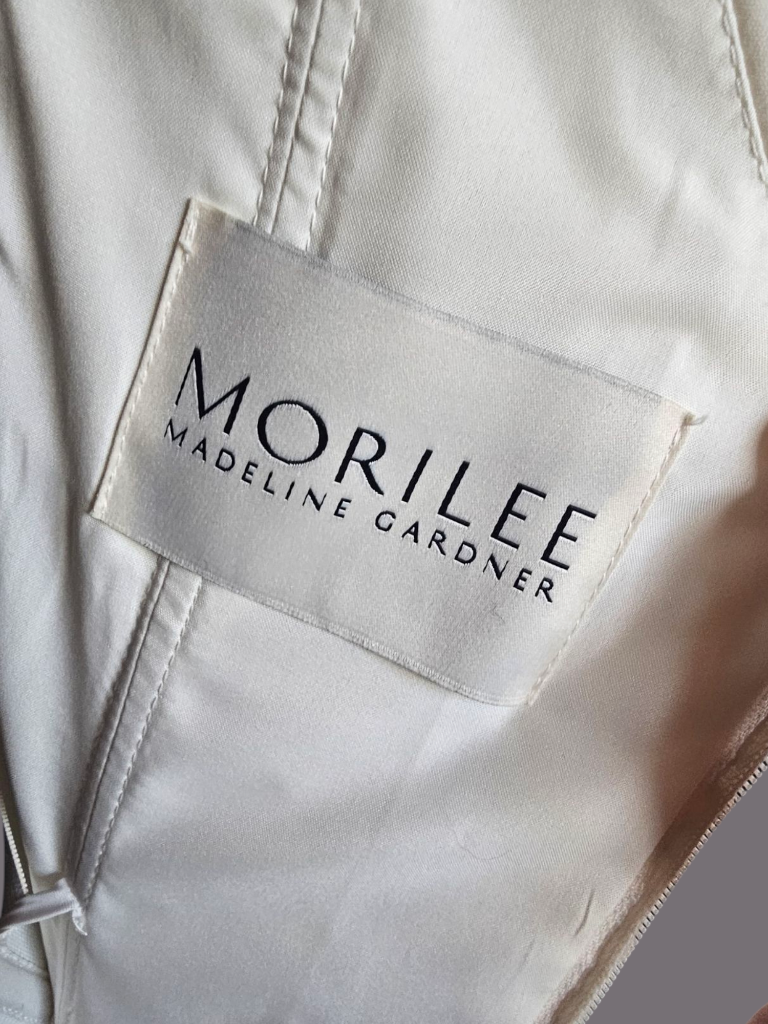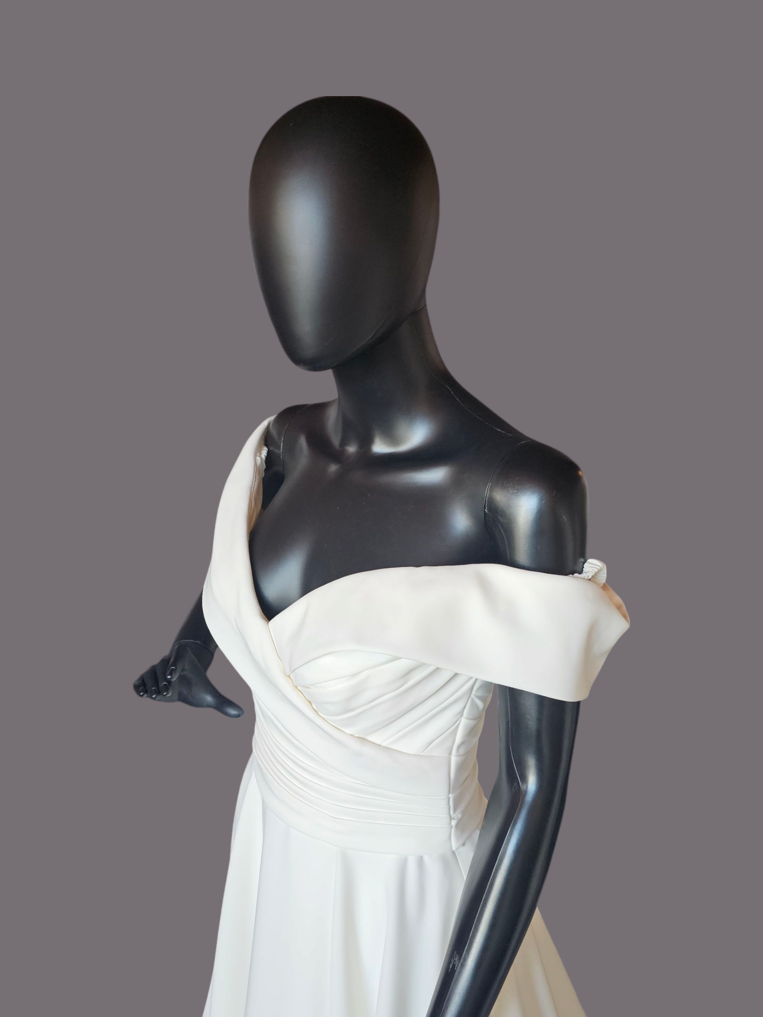 The Mori Lee Off Shoulder Ivory Crepe Wedding Gown exudes classic chic with its portrait neckline and delicate pleating at the natural waist. Its ruched bodice cinches the waist for a flattering silhouette, while the ivory crepe fabric drapes beautifully. The chapel train and bustle add a touch of elegance to this sophisticated and exclusive piece.