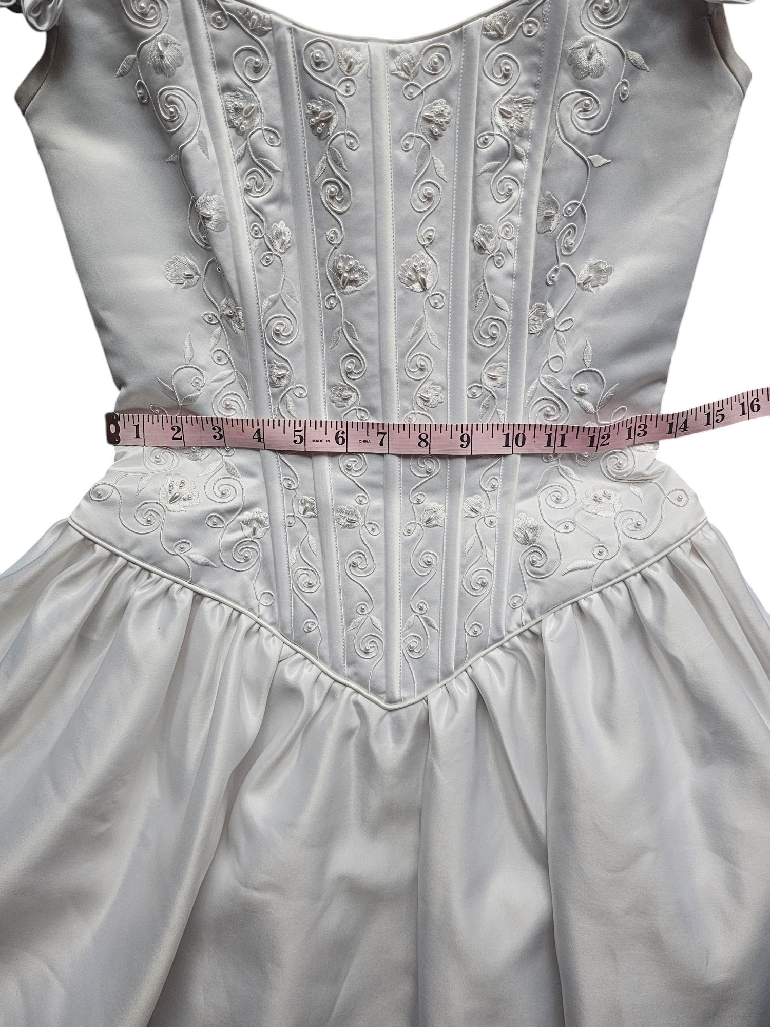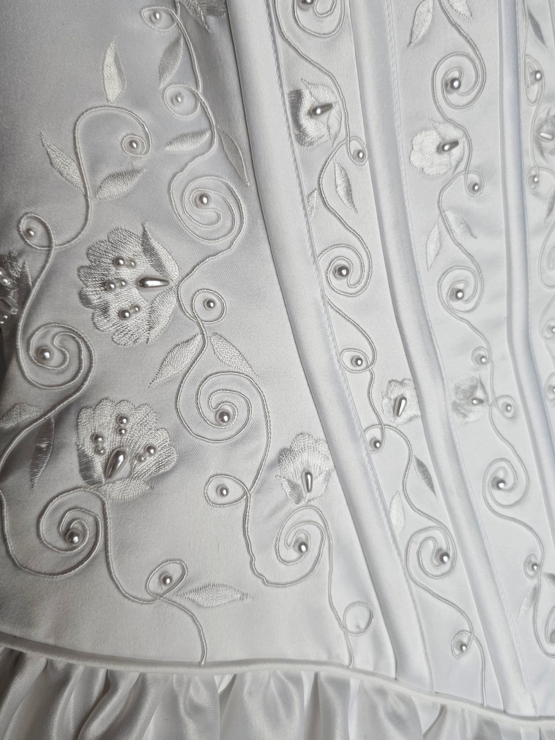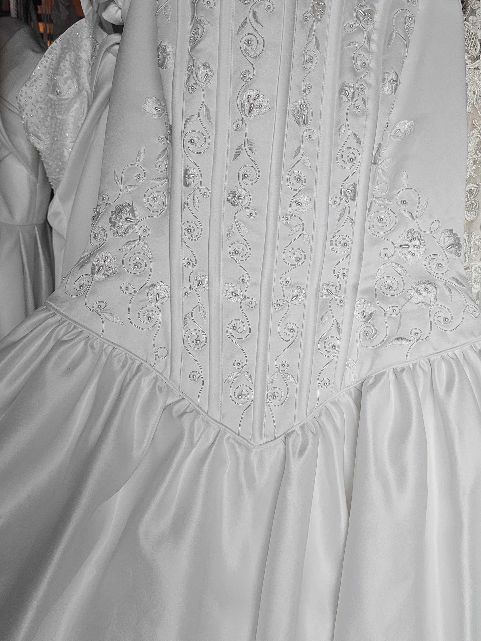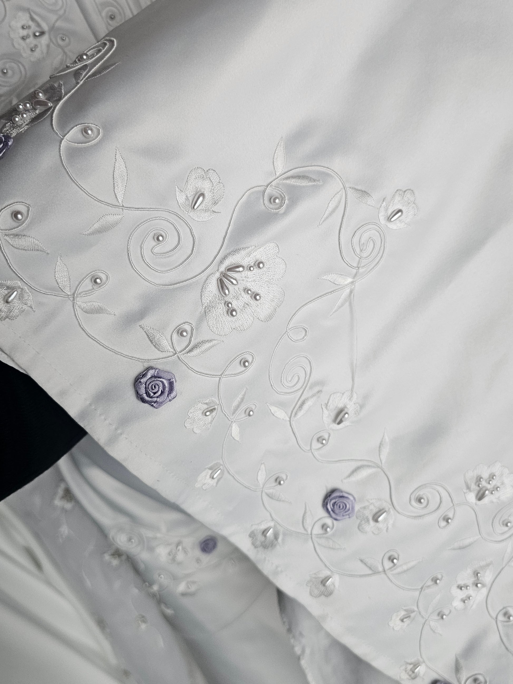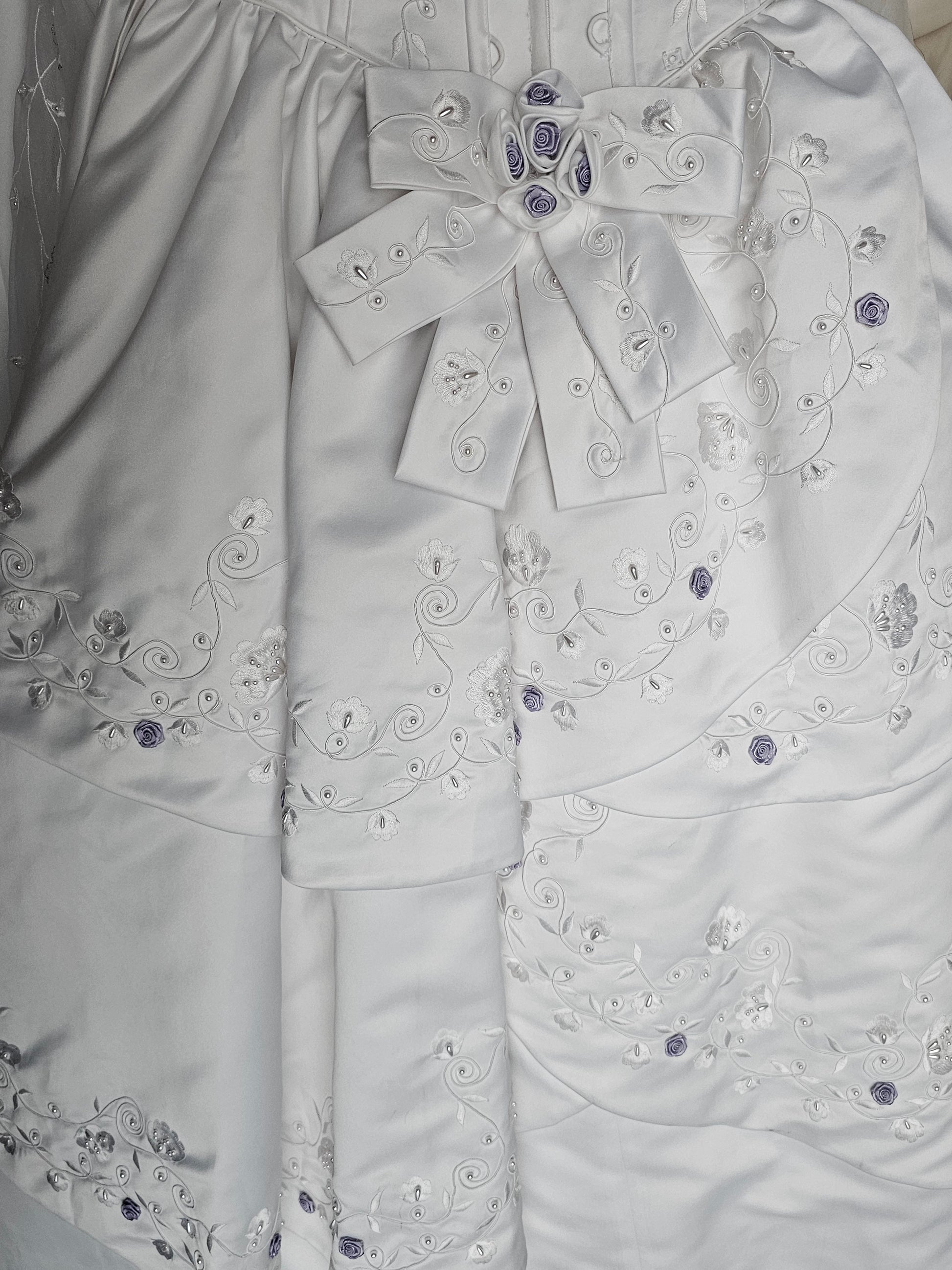 So unique and fun! This white satin wedding gown is full of beautiful detailing and surprising accents. The soft scoop neckline features off the shoulder straps with delicate purple rosettes. The fitted antebellum bodice has boning in it to keep the waistline in a perfect silhouette and is accented with embroidery and pearls. The gathered a-line skirt is full and in the back is layered to provide more fullness and interest with additional accents of the soft purple color. There is no train so it's perfect for a destination location or backyard event.