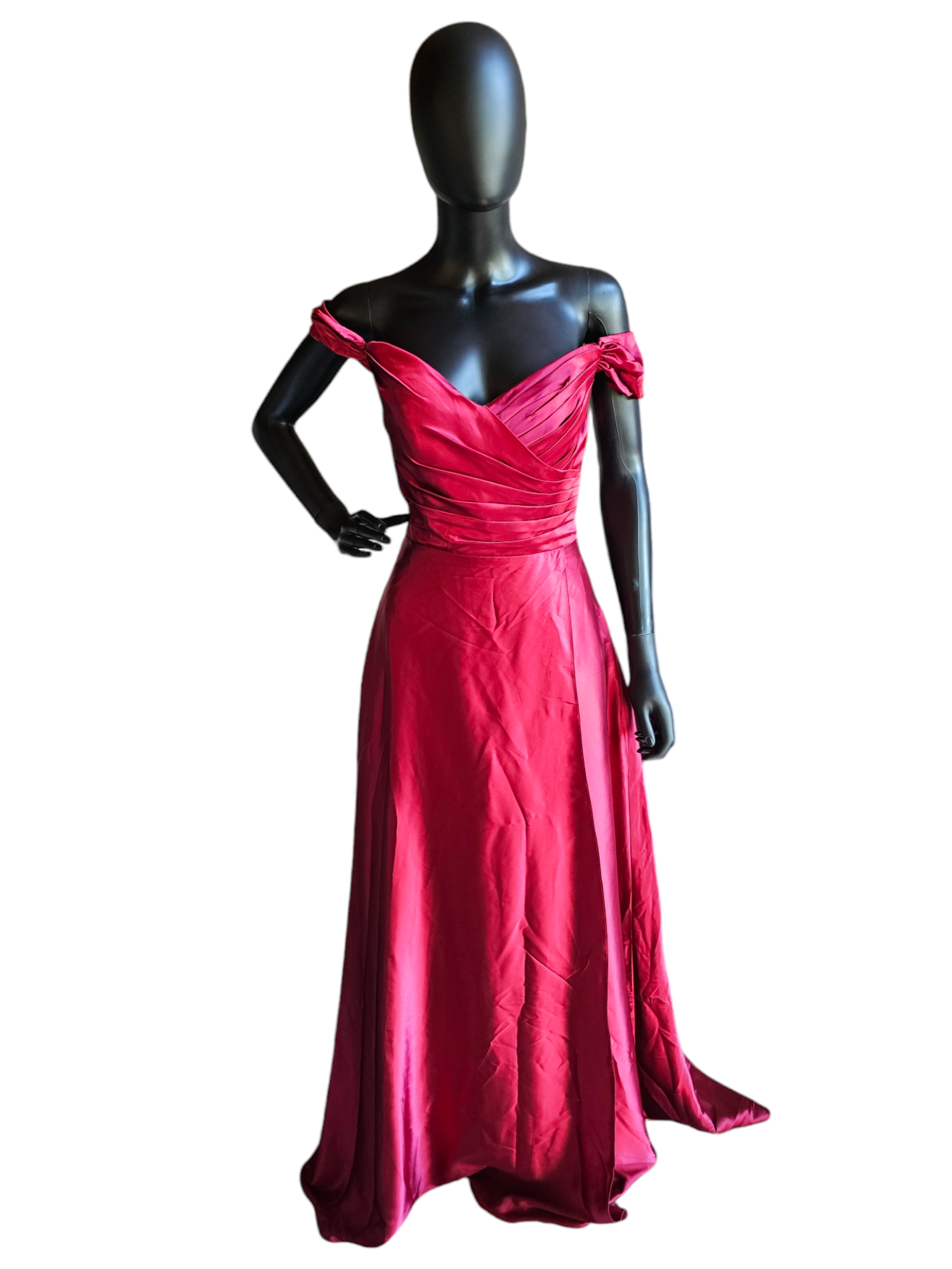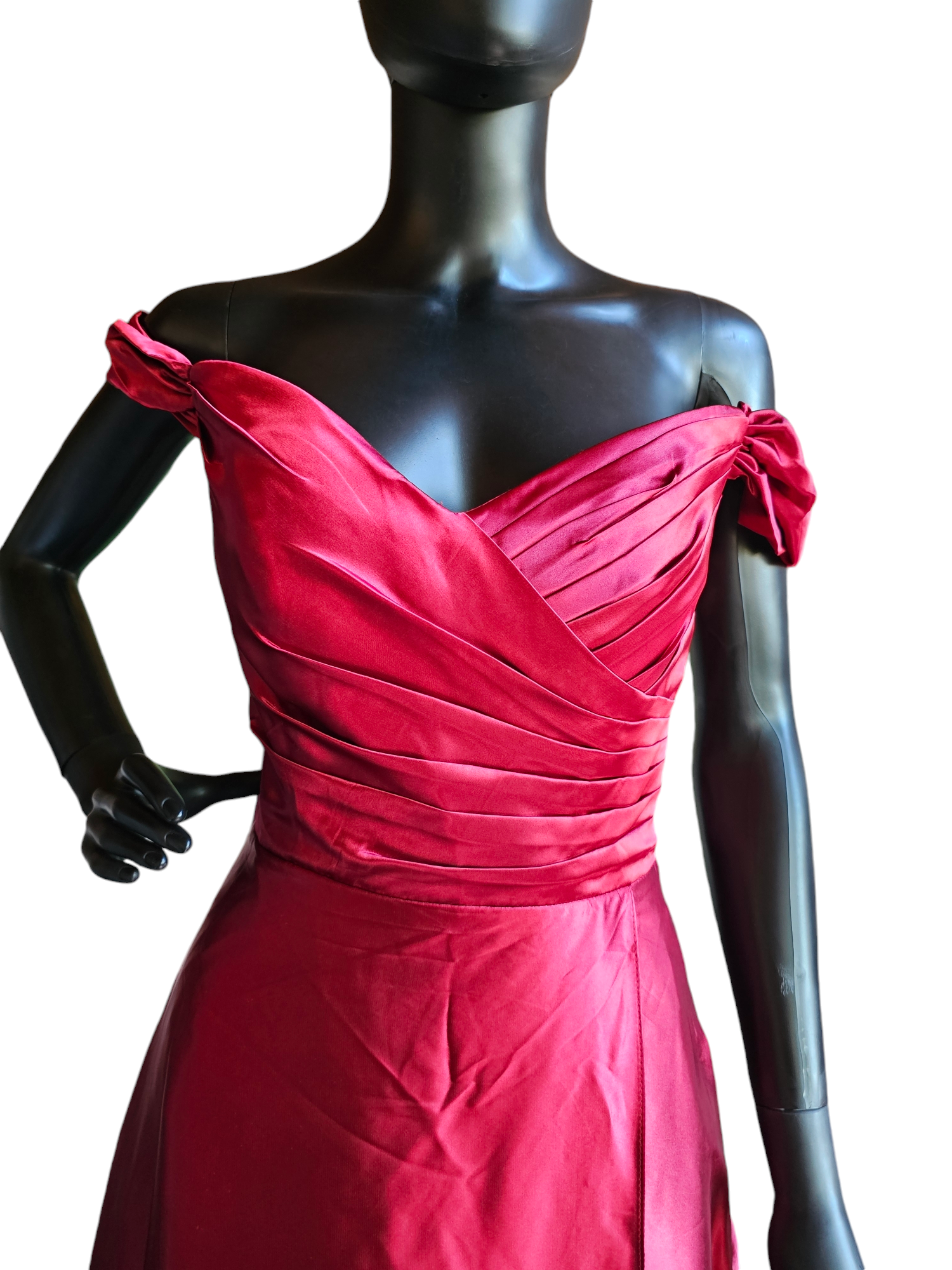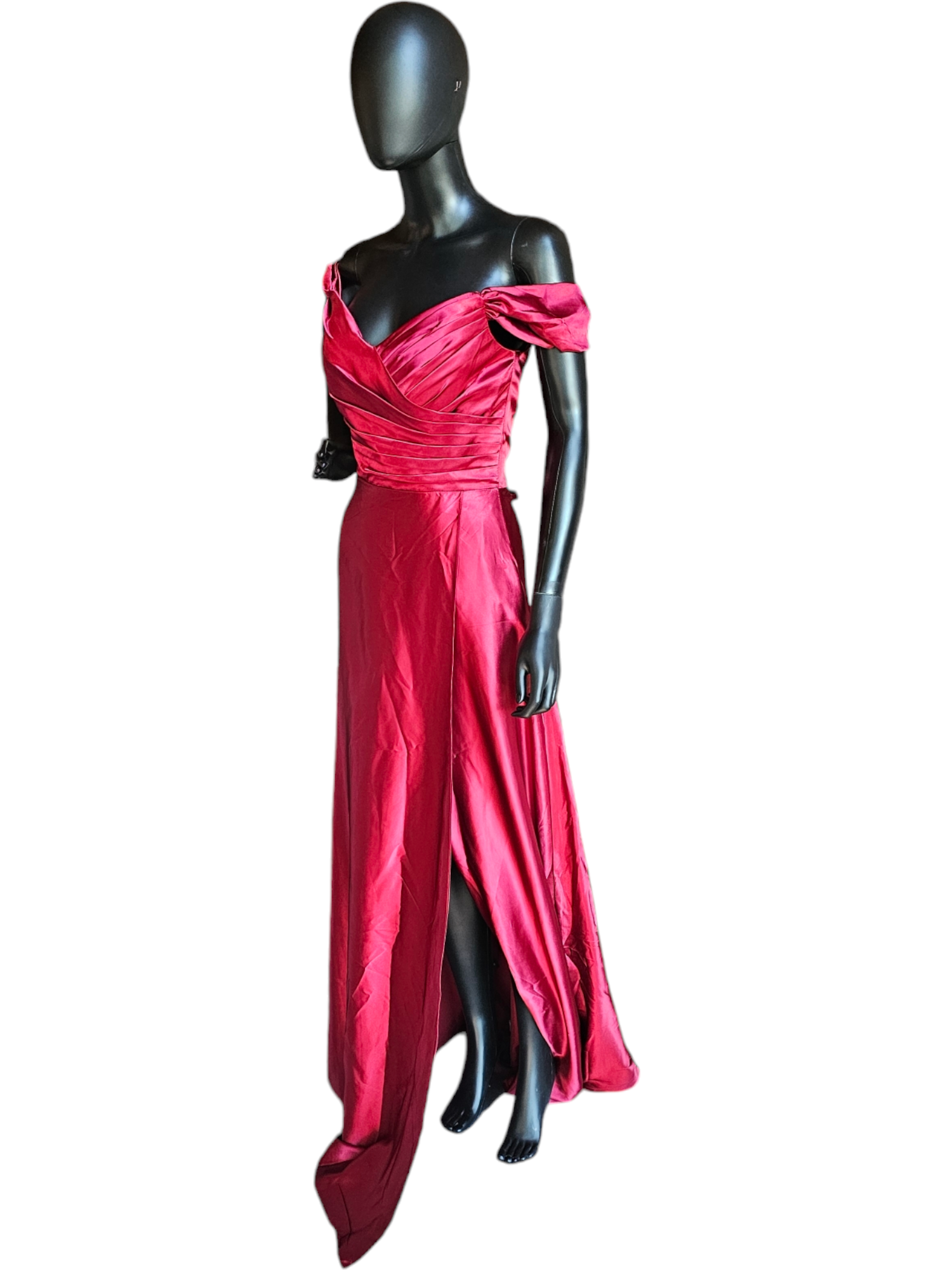 Elevate your style with our Red Charmeuse Off Shoulder NWT dress. Made from luxurious silky fabric, this dress features a rich red color and a ruched bodice for a flattering fit. The off shoulder straps add a touch of elegance, while the full skirt with open slit and a-line silhouette create a stunning look. Perfect for any special occasion.Red Charmeause Off Shoulder NWT