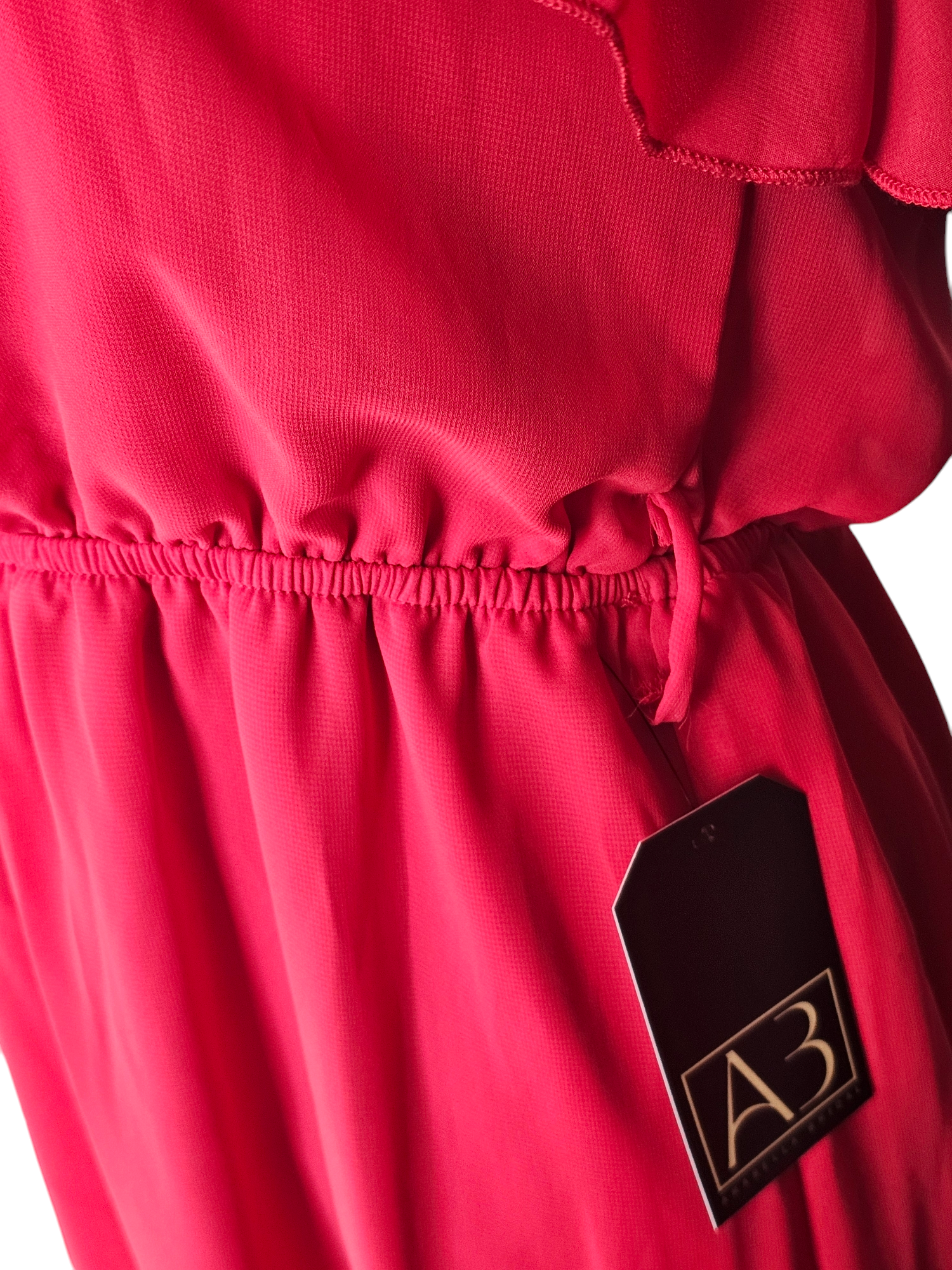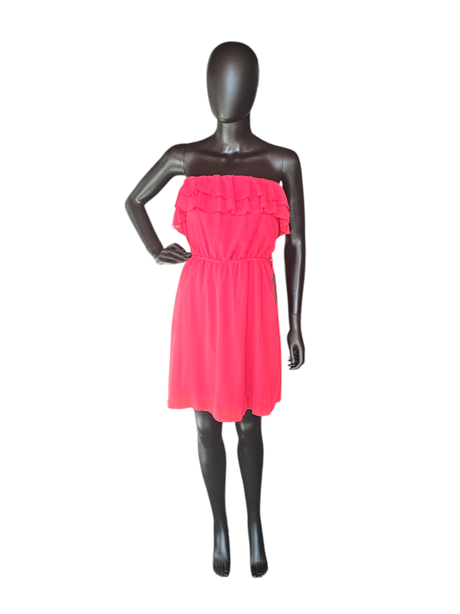 Unleash your inner romantic with this red chiffon dress. The flutter detail adds a touch of playful charm to the strapless neckline, while the gathered elastic waist ensures a flattering fit. Perfect for a flirty date night look.