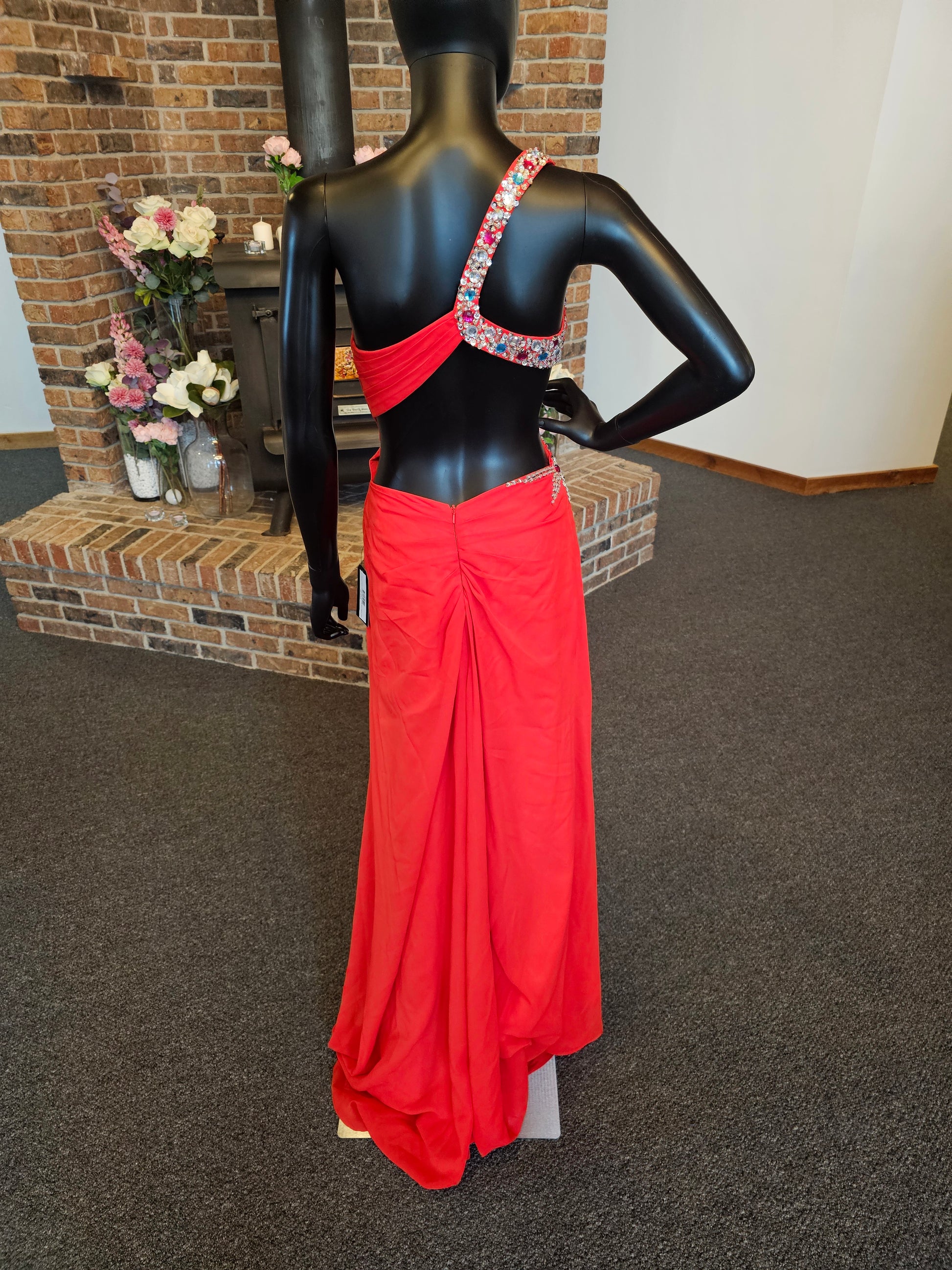This red one shoulder dress is the statement you need for a special occasion or prom. The gorgeous crystal beading follows the shoulder strap and ties into the open back and side cutout. The dress is complete with a romantic sweetheart neckline and side slit. Be the star and wear this dress to your next formal event!