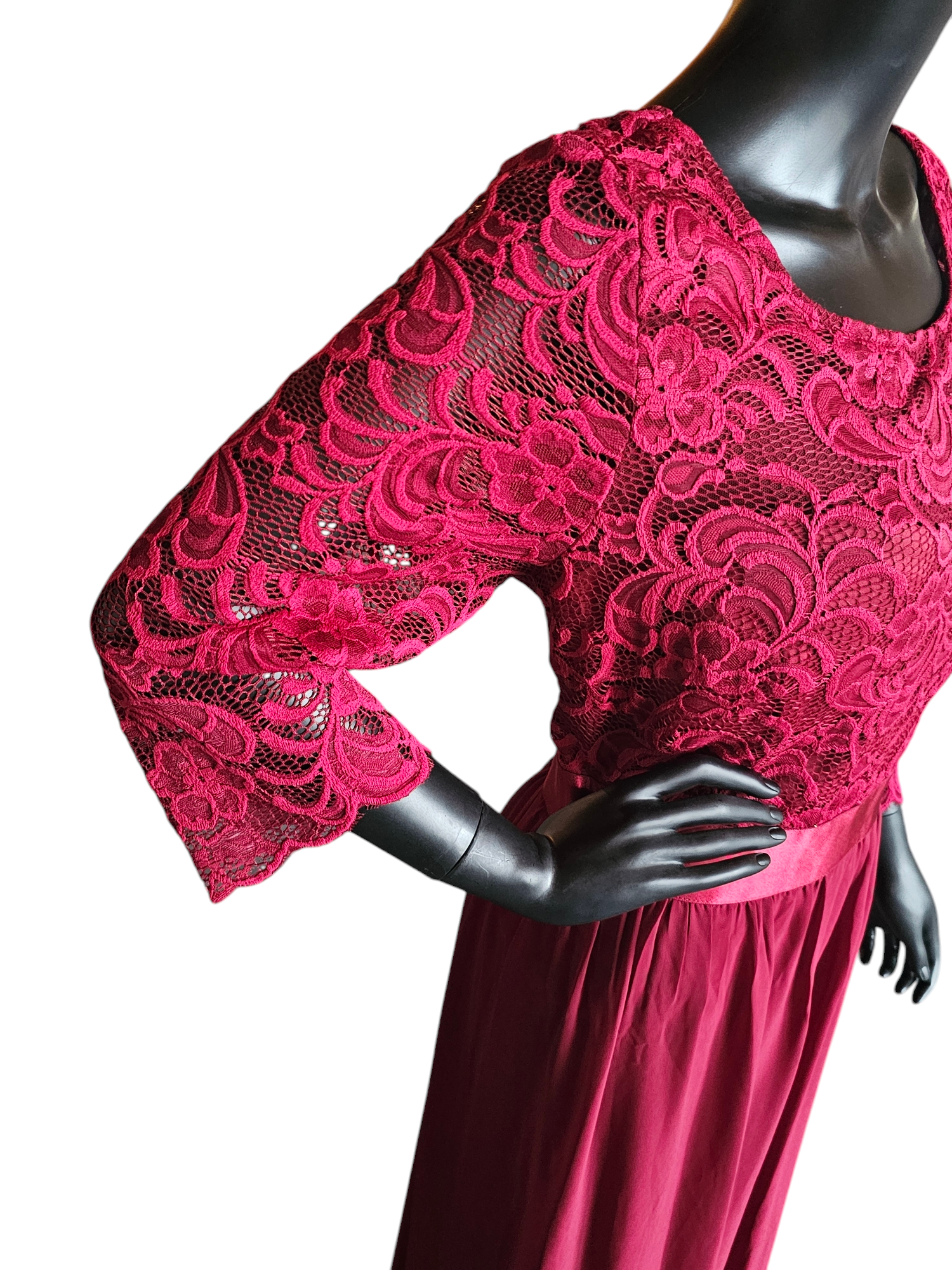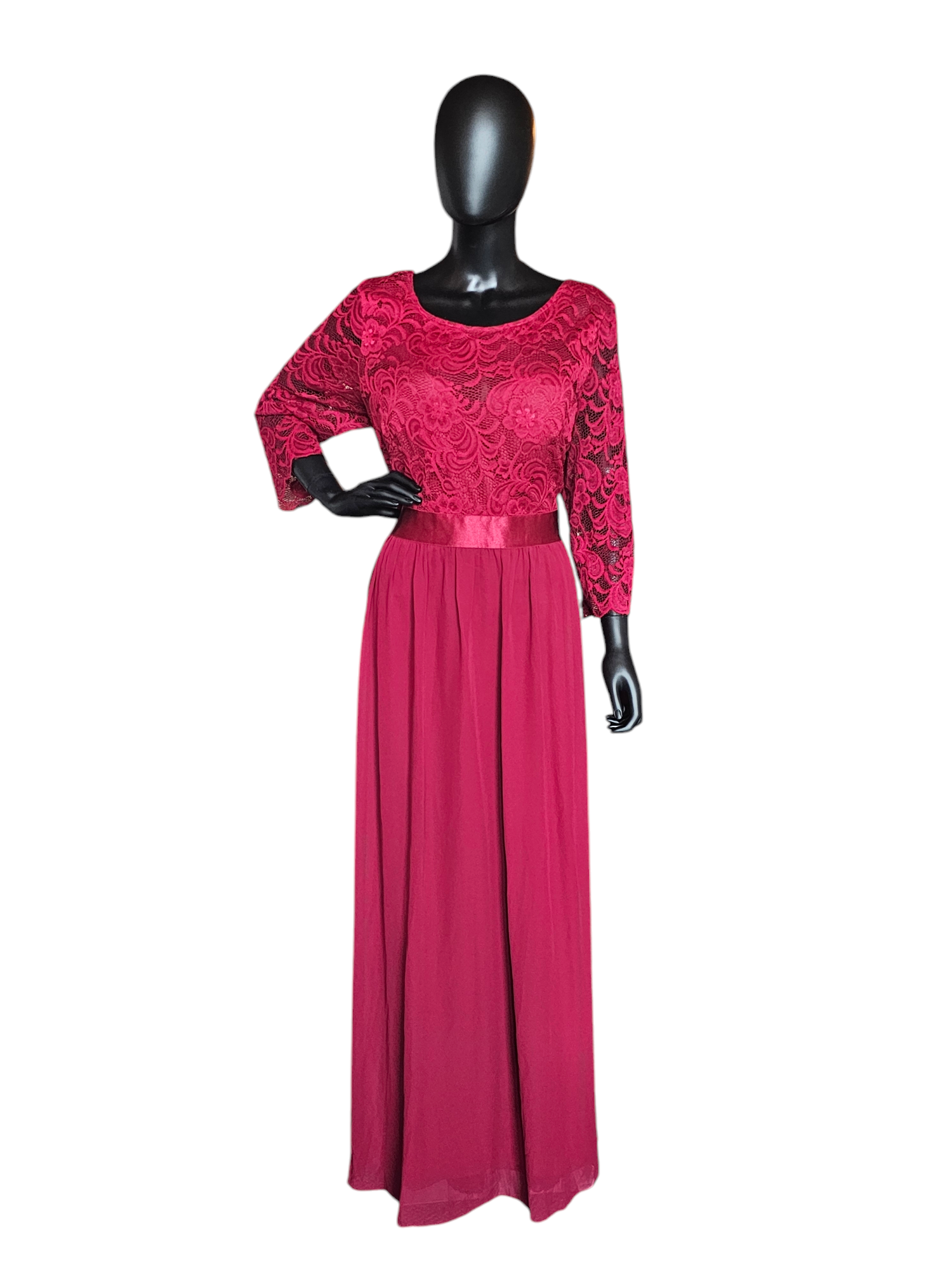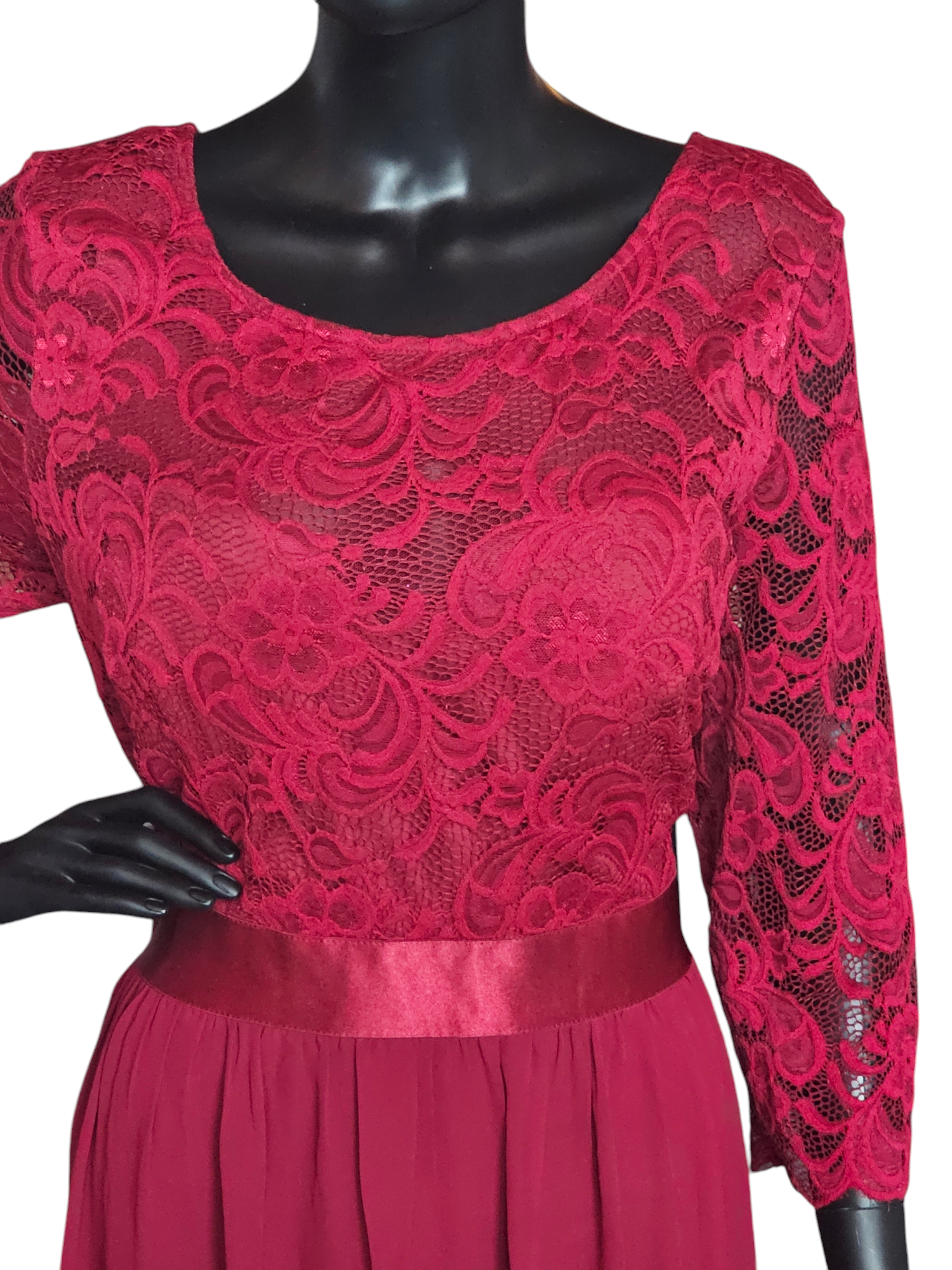 This Red Illusion Lace Top Chiffon Maxi Dress by Ever Pretty features a dark red lace design and illusion sweetheart neckline for a sophisticated look. The 3/4 sleeve provides coverage while the satin sash at the natural waist accentuates your figure. The full length chiffon skirt adds an elegant touch to this dress.