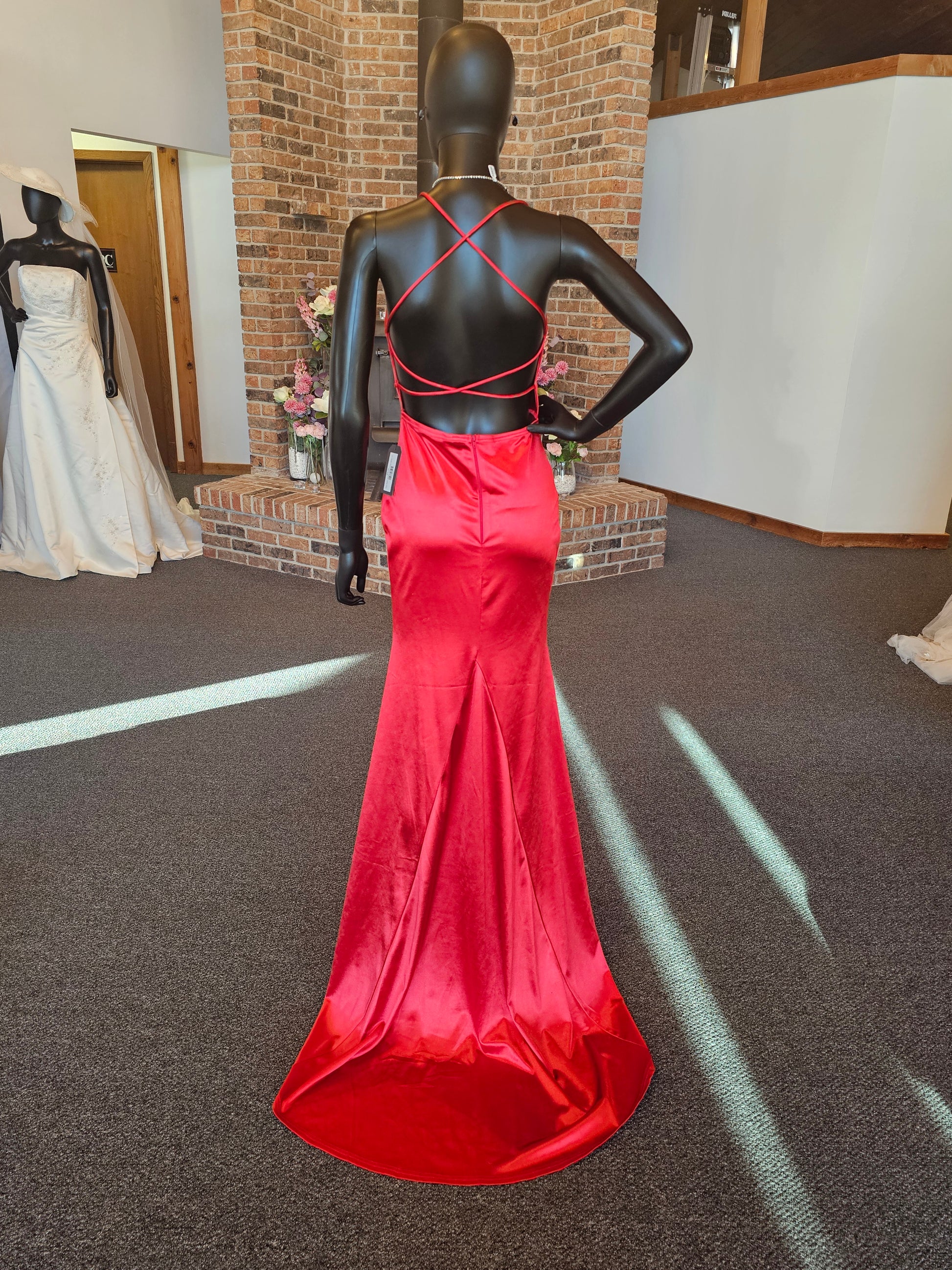 This stunning satin dress is the epitome of femme fatal. The bright red compliments the sexy v-neck and spaghetti strap style that crosses in the back for a fitted look. The small circle train elevates this look further and makes it perfect for prom or a special occasion.