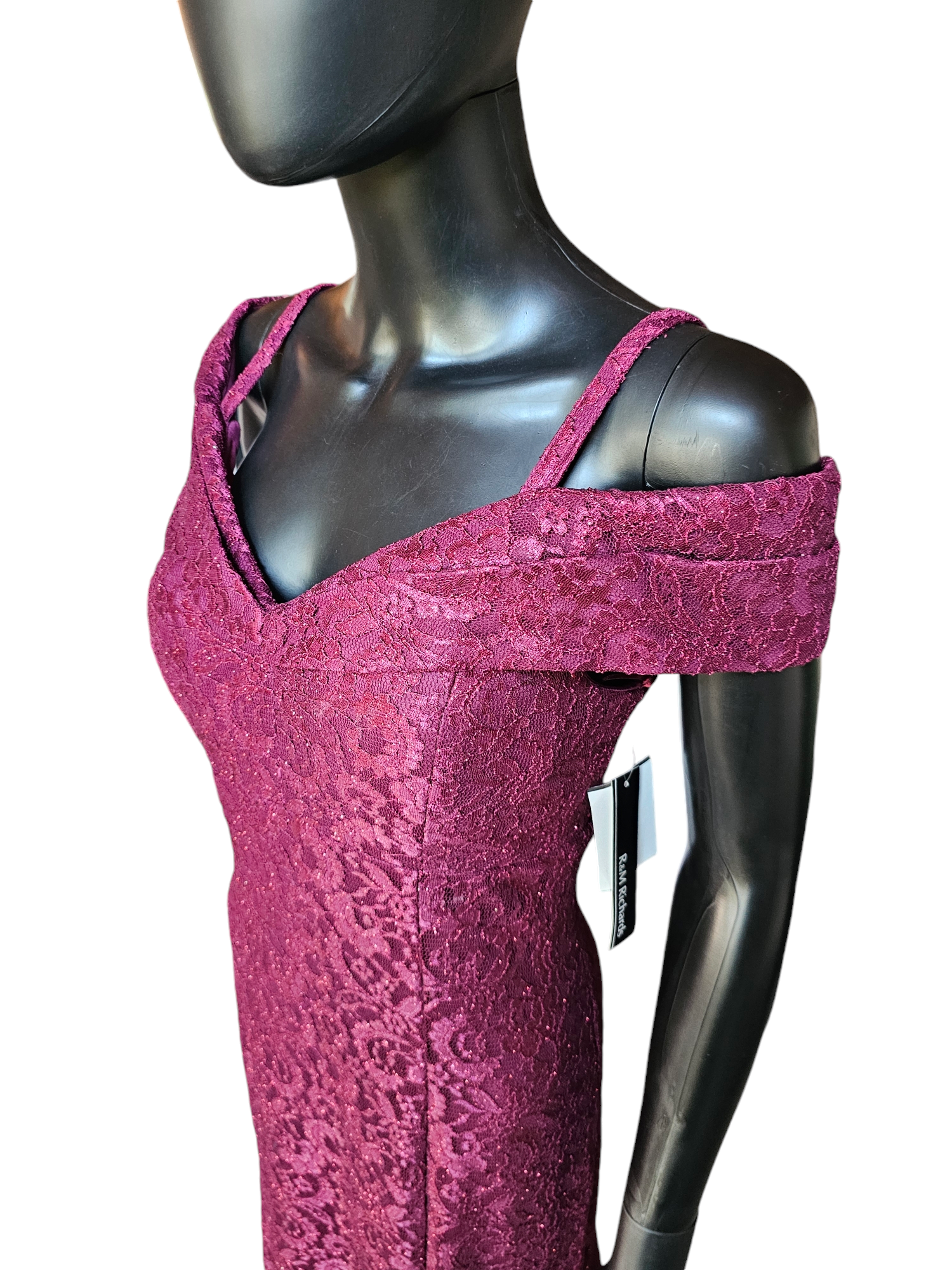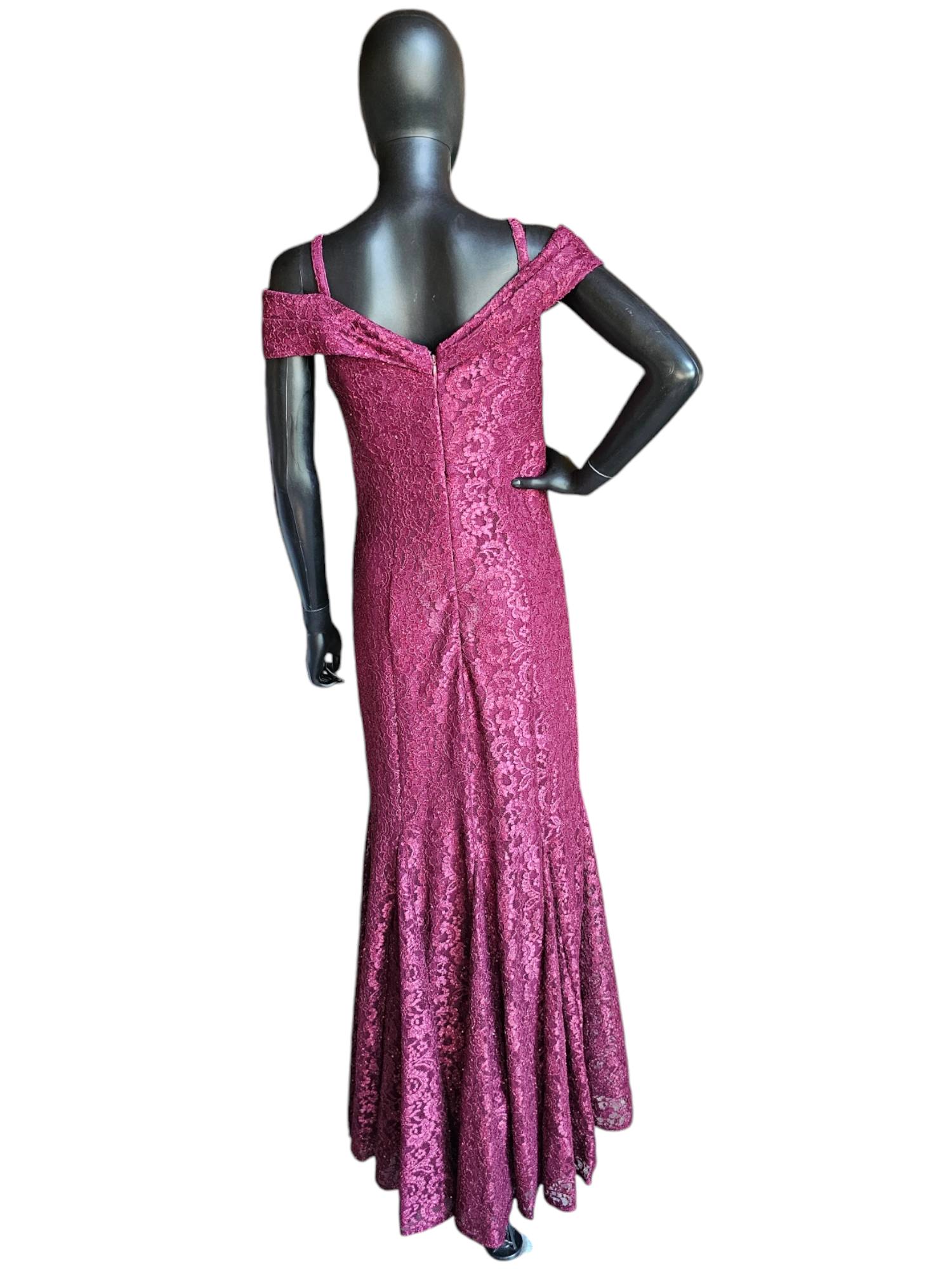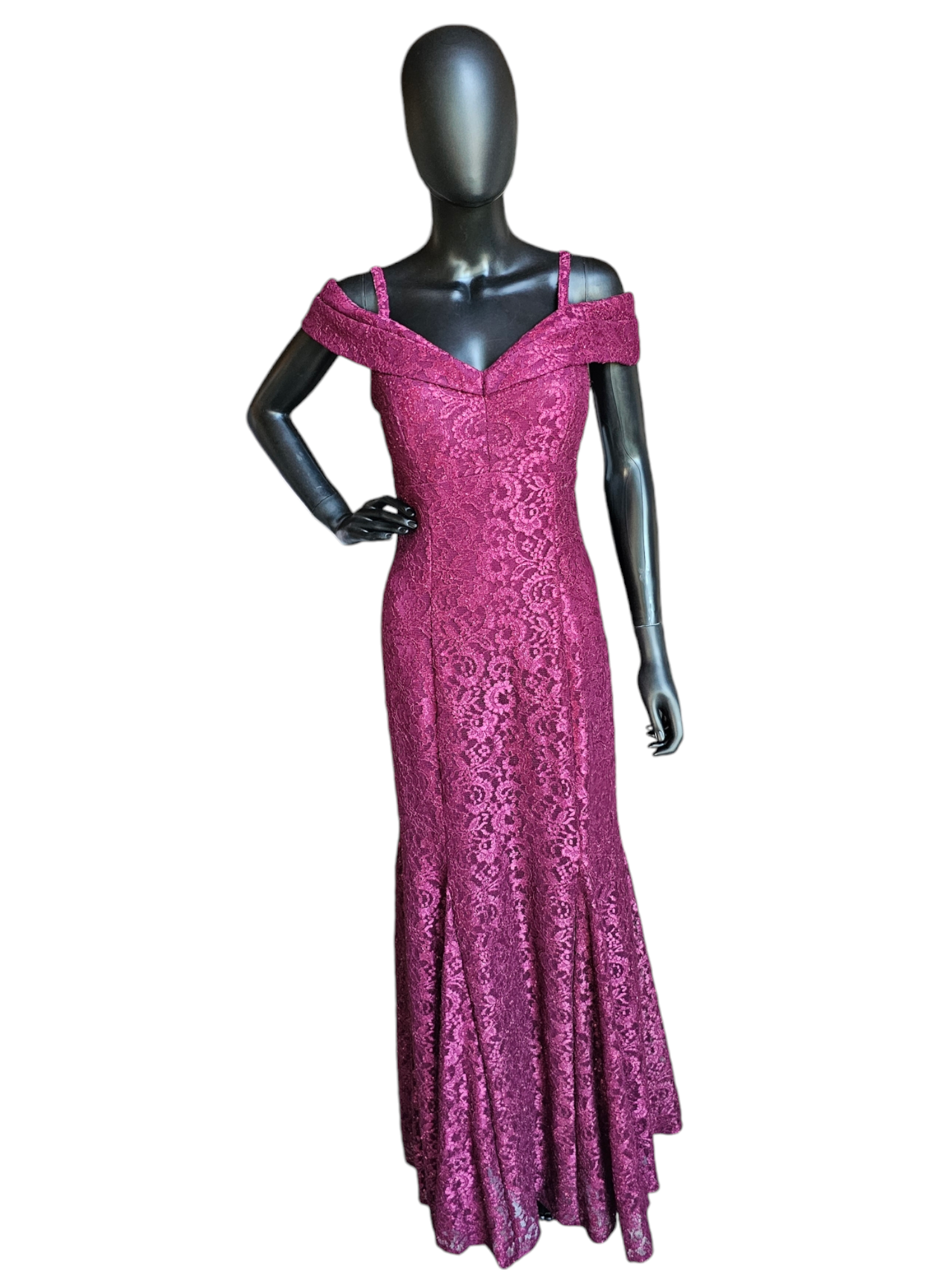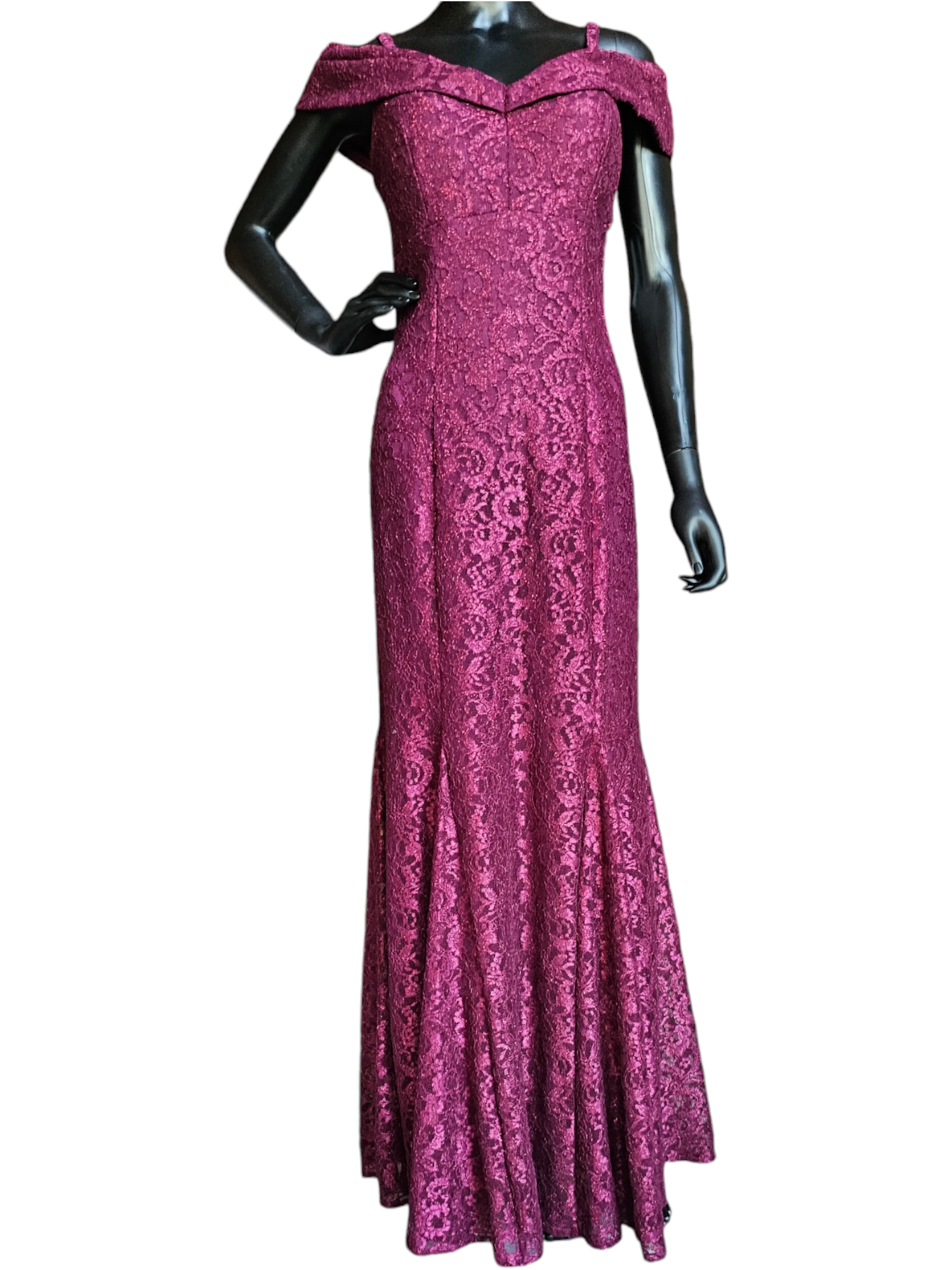 Stay stylish and elegant in this Red Sparkle Off Shoulder Davids Bridal - NWT. Its fit and flare silhouette offers a flattering shape while the burgundy red lace adds a touch of glamour. The off shoulder design with spaghetti straps is versatile and comfortable, while the panel inserts provide extra movement to the skirt. Perfect for any special occasion.Red Sparkle Off Shoulder Davids Bridal - NWT