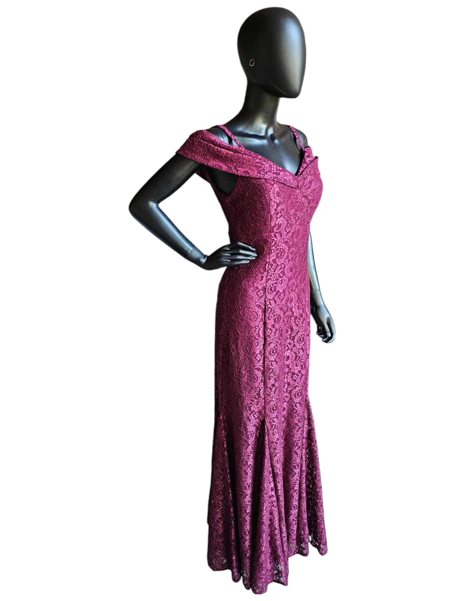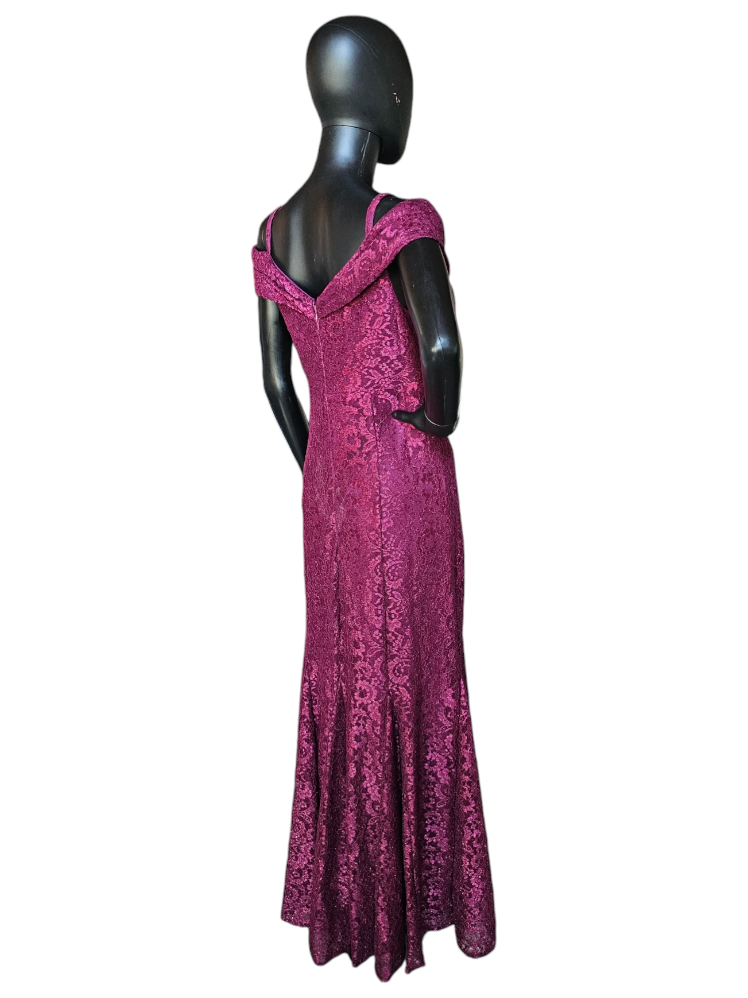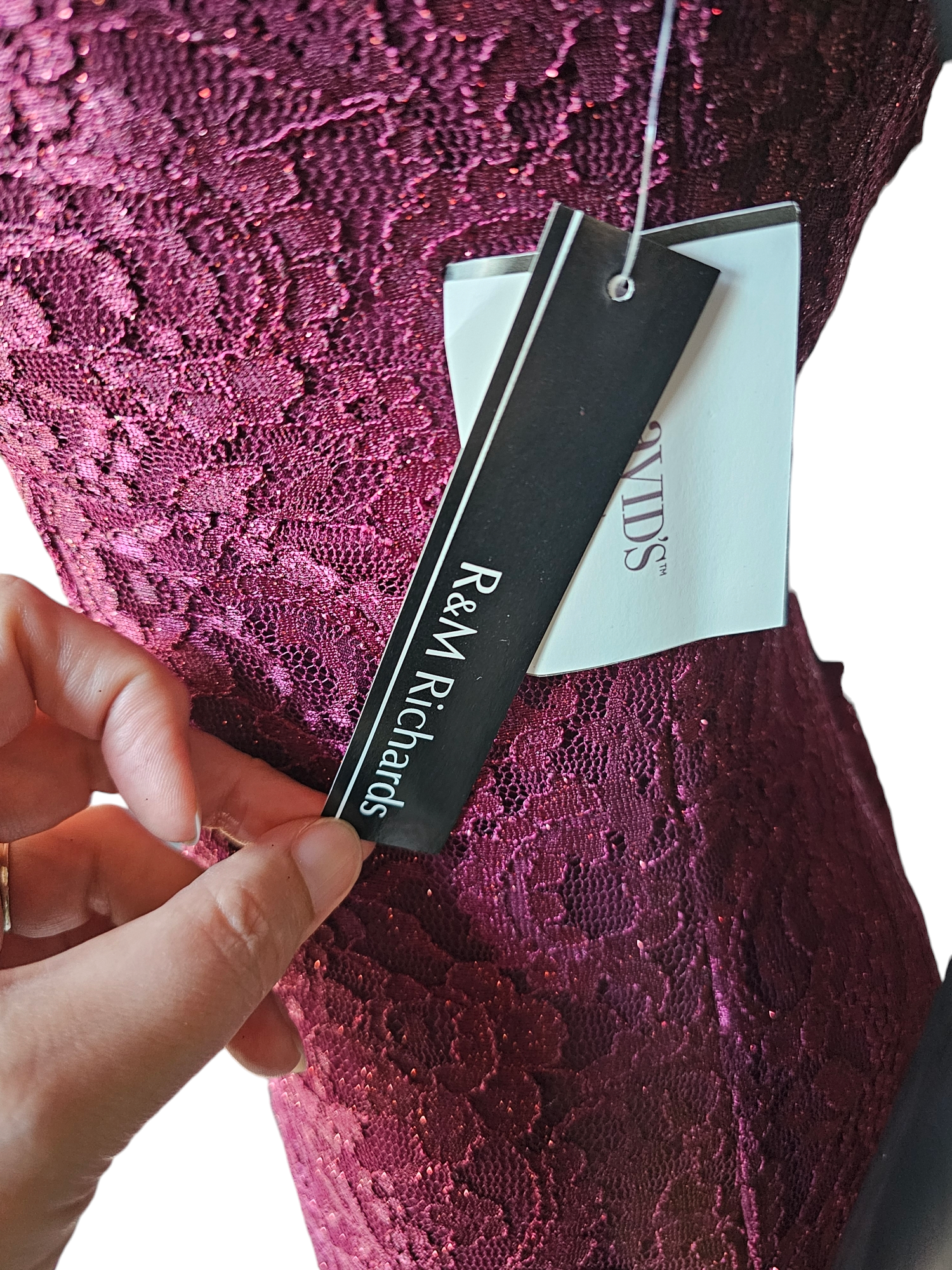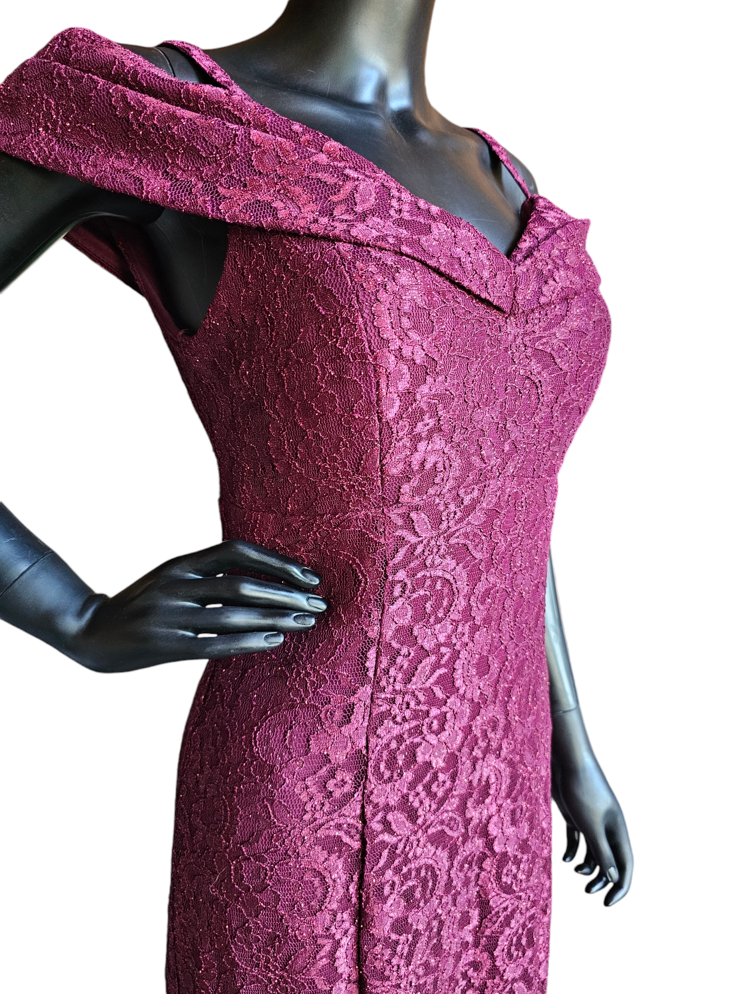 Stay stylish and elegant in this Red Sparkle Off Shoulder Davids Bridal - NWT. Its fit and flare silhouette offers a flattering shape while the burgundy red lace adds a touch of glamour. The off shoulder design with spaghetti straps is versatile and comfortable, while the panel inserts provide extra movement to the skirt. Perfect for any special occasion.Red Sparkle Off Shoulder Davids Bridal - NWT