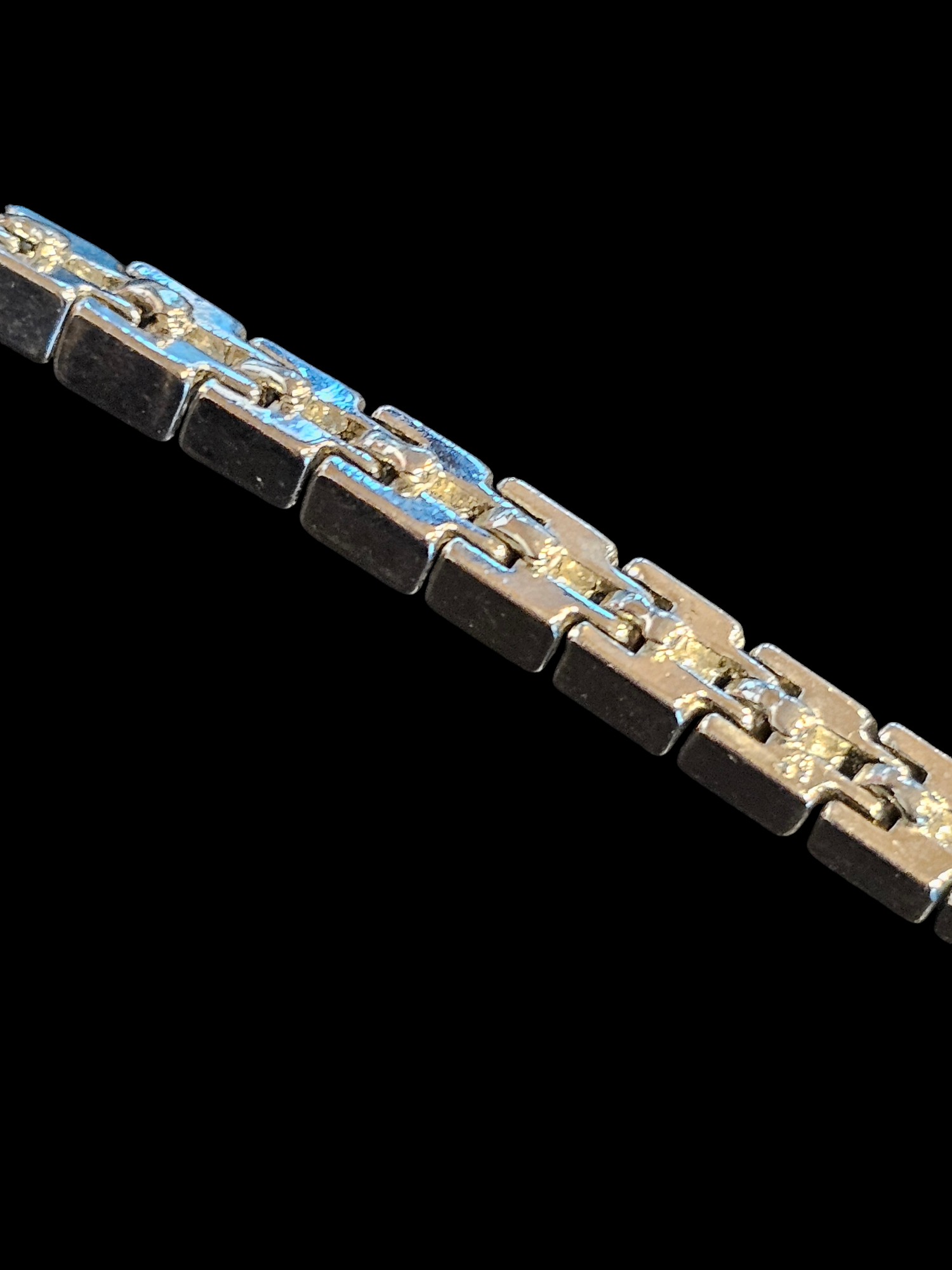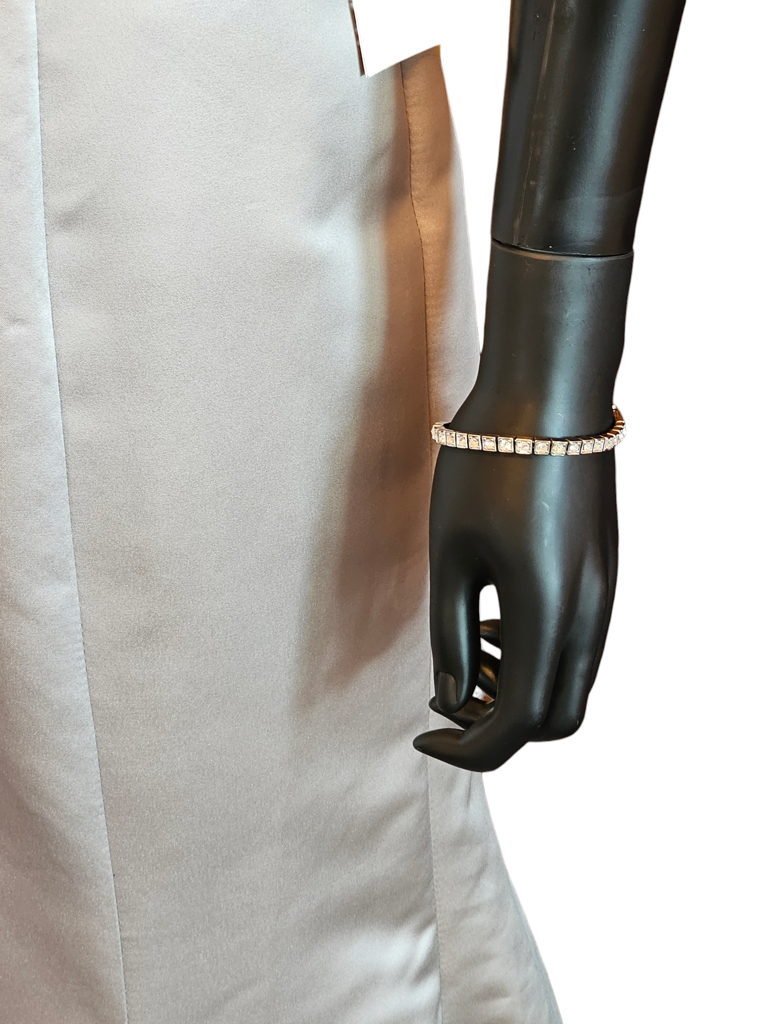 This Rhinestone/Silver Tennis Bracelet features a round white crystal rhinestone in a silver square setting, providing a classic and elegant look. The extra extender and clasp closure ensure a secure and comfortable fit. Perfect for adding a touch of sparkle to any outfit.