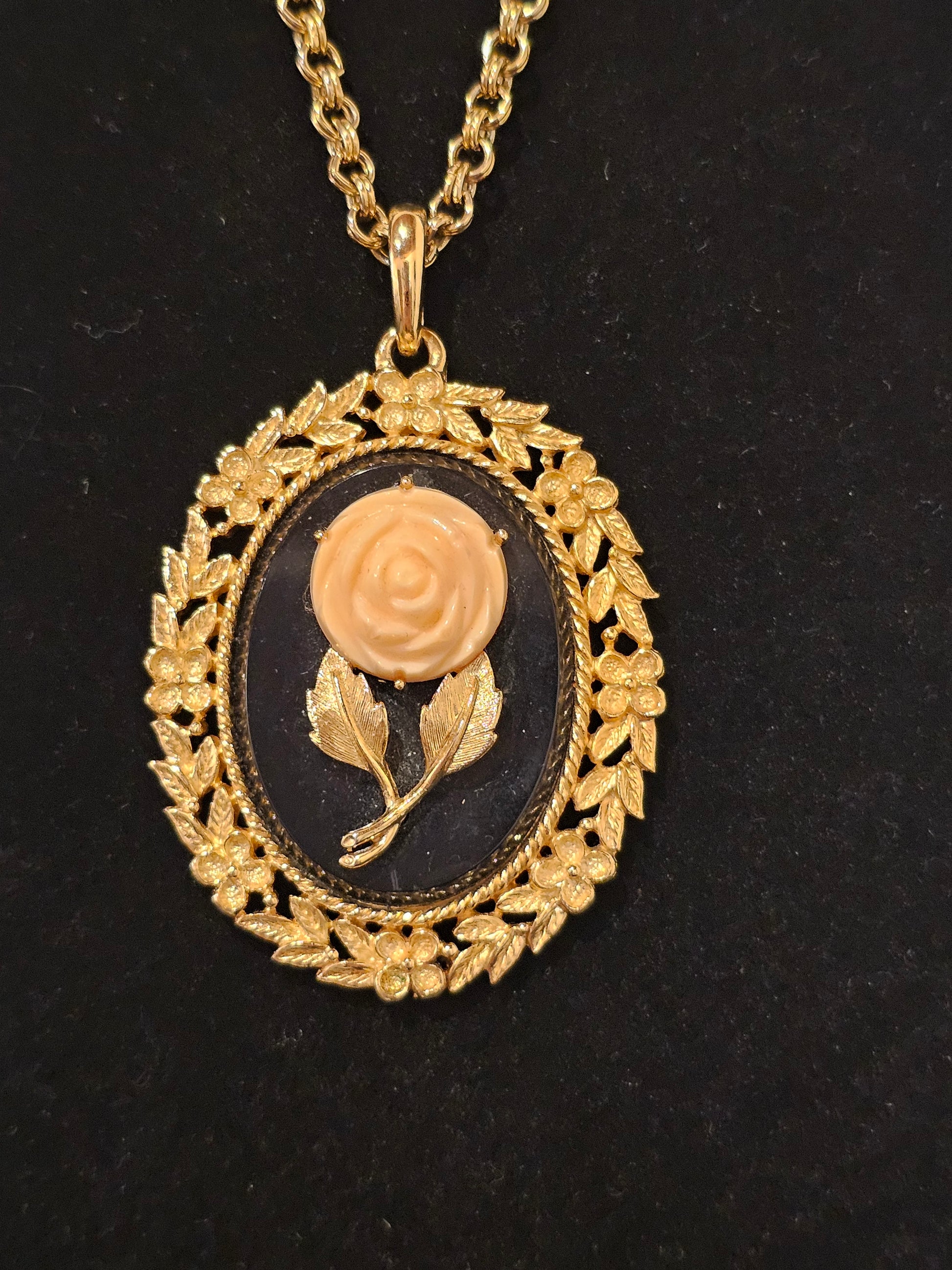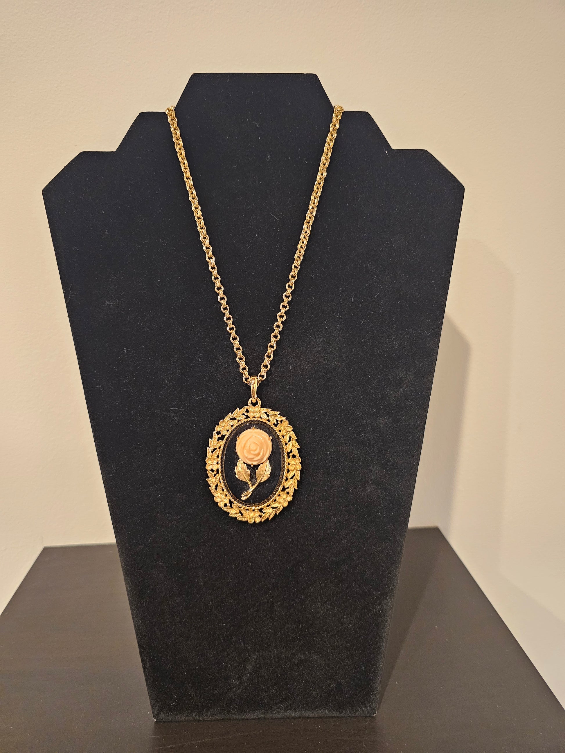 This timeless Rose Cameo Necklace mimics the cameo style of historical necklaces, but provides a modern twist with the addition of the rose centerpiece. The gold ties the to the rose as compared to the stark black background to create an ethereal looking accessory. To elevate your wardrobe, add this majestic piece.