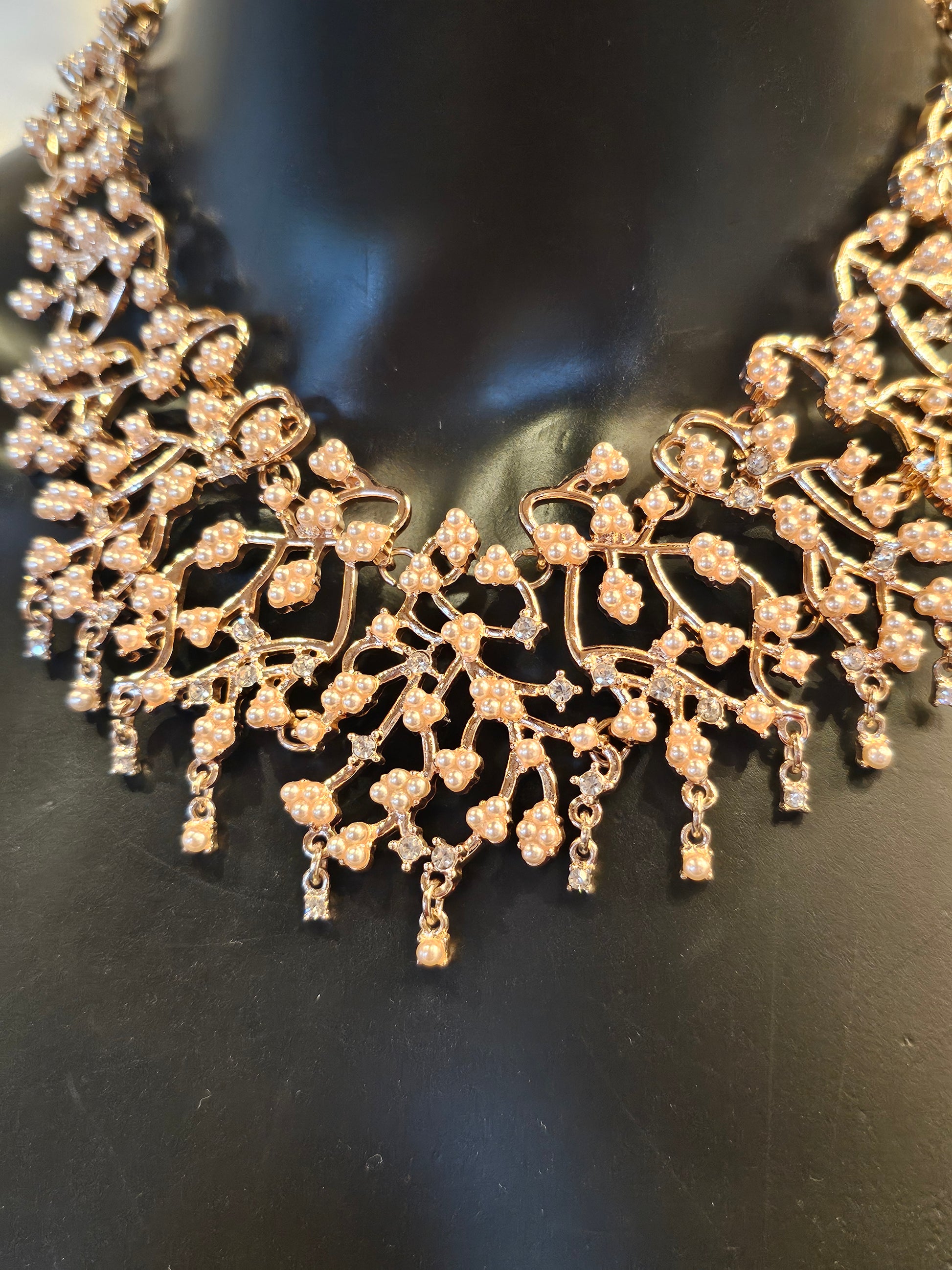 This Rose Gold Pearl Vine Collar Necklace is intricately designed to form winding vines of pearls and wire. By incorporating natural materials, this necklace offers a soft, yet elegant look for any outfit. It rests comfortably on the collarbone and is a great addition to any wardrobe.