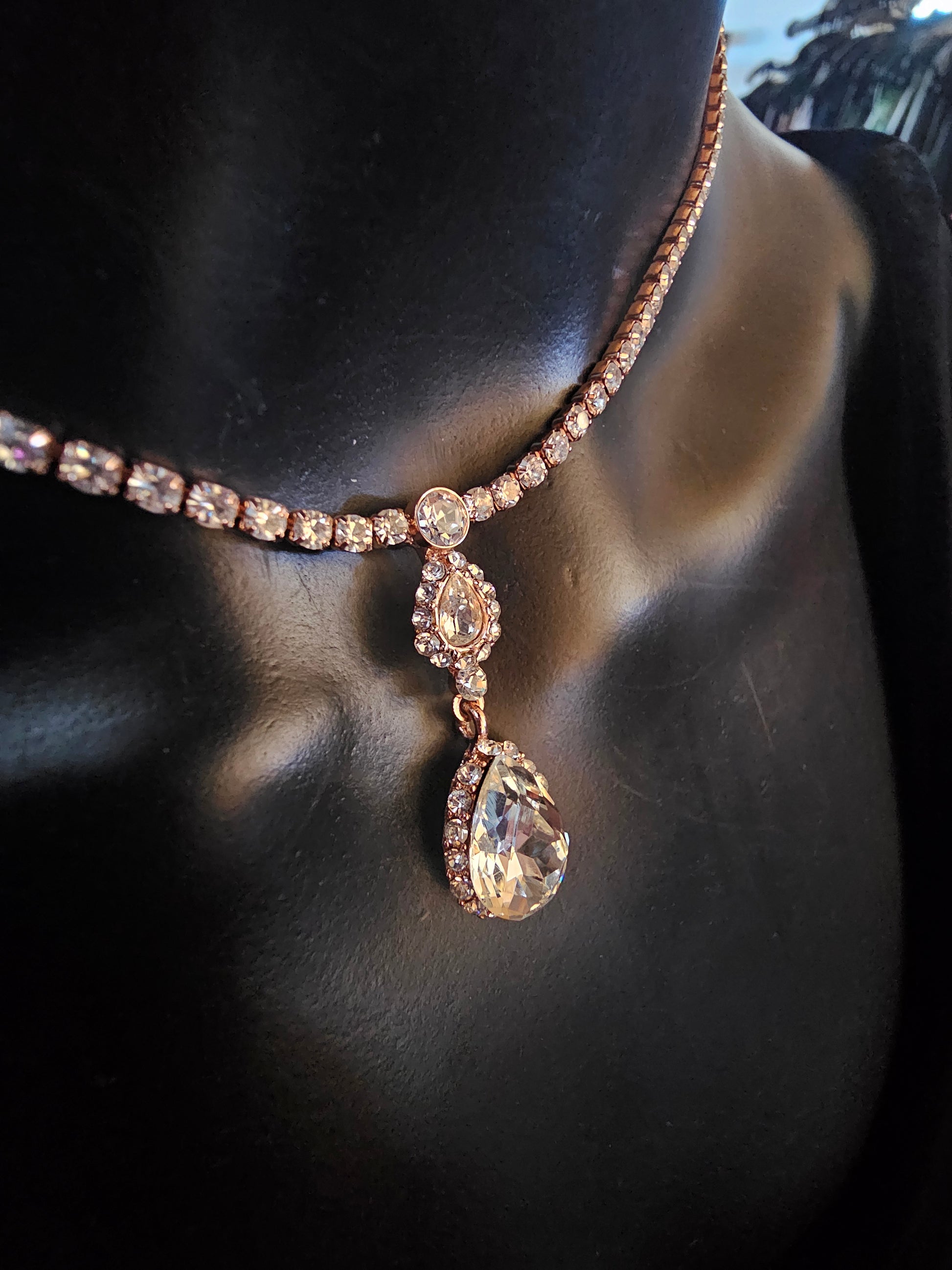 Indulge in luxury with our Rose Gold Rhinestone Teardrop Necklace. The exquisite rose/pink metal setting and dazzling rhinestone/crystal chain will add a touch of elegance to any outfit. Featuring a large teardrop hanging pendant, this necklace is the perfect accessory for any occasion. Elevate your style and make a statement with this exclusive piece.
