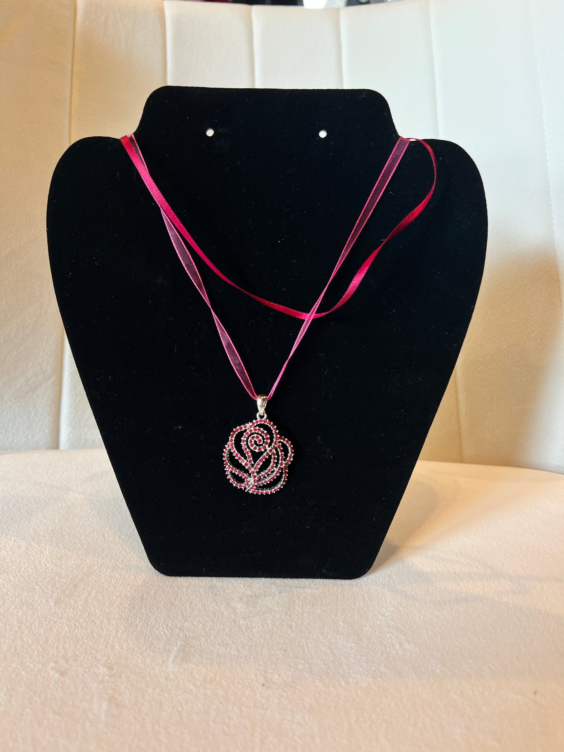 Delicate dark pink organza ribbon and silver rose with crystals.