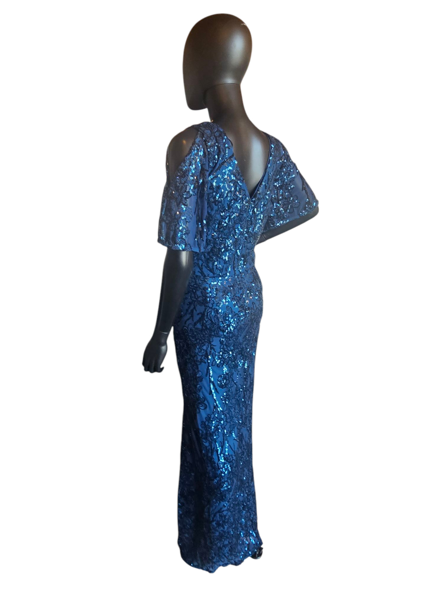 Royal Blue Beaded Cold Shoulder Flutter Sleeve Formal Gown - Alex Evenings