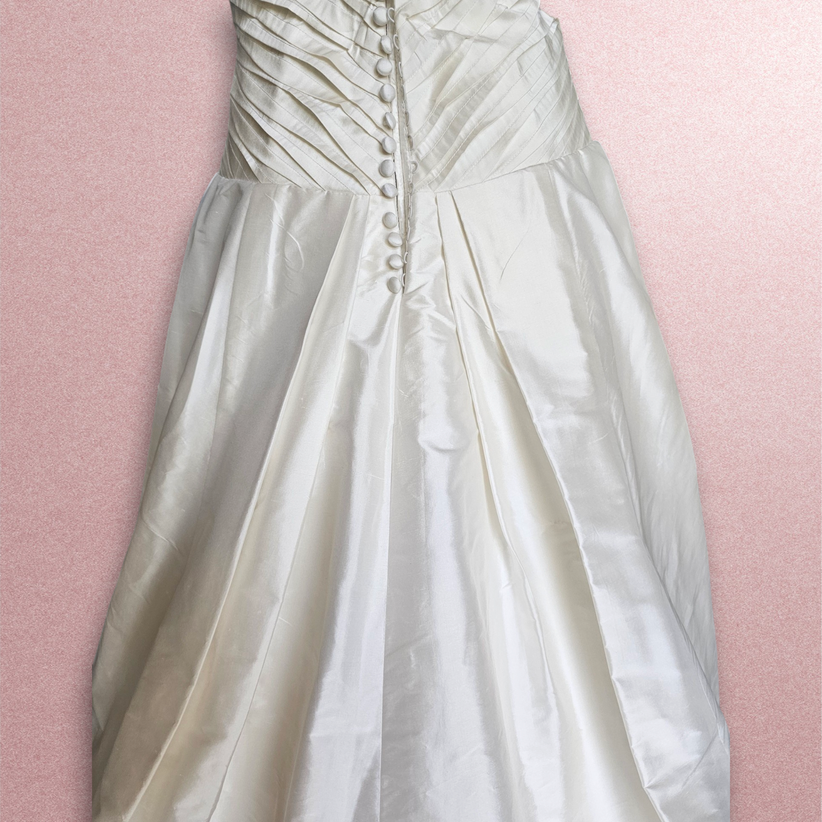 This gown is part of our pre-loved collection and has been worn before. There is an under bustle in place already. It has been professionally cleaned and stored. Excellent condition with one teeny tiny spot near the left hem of the skirt.