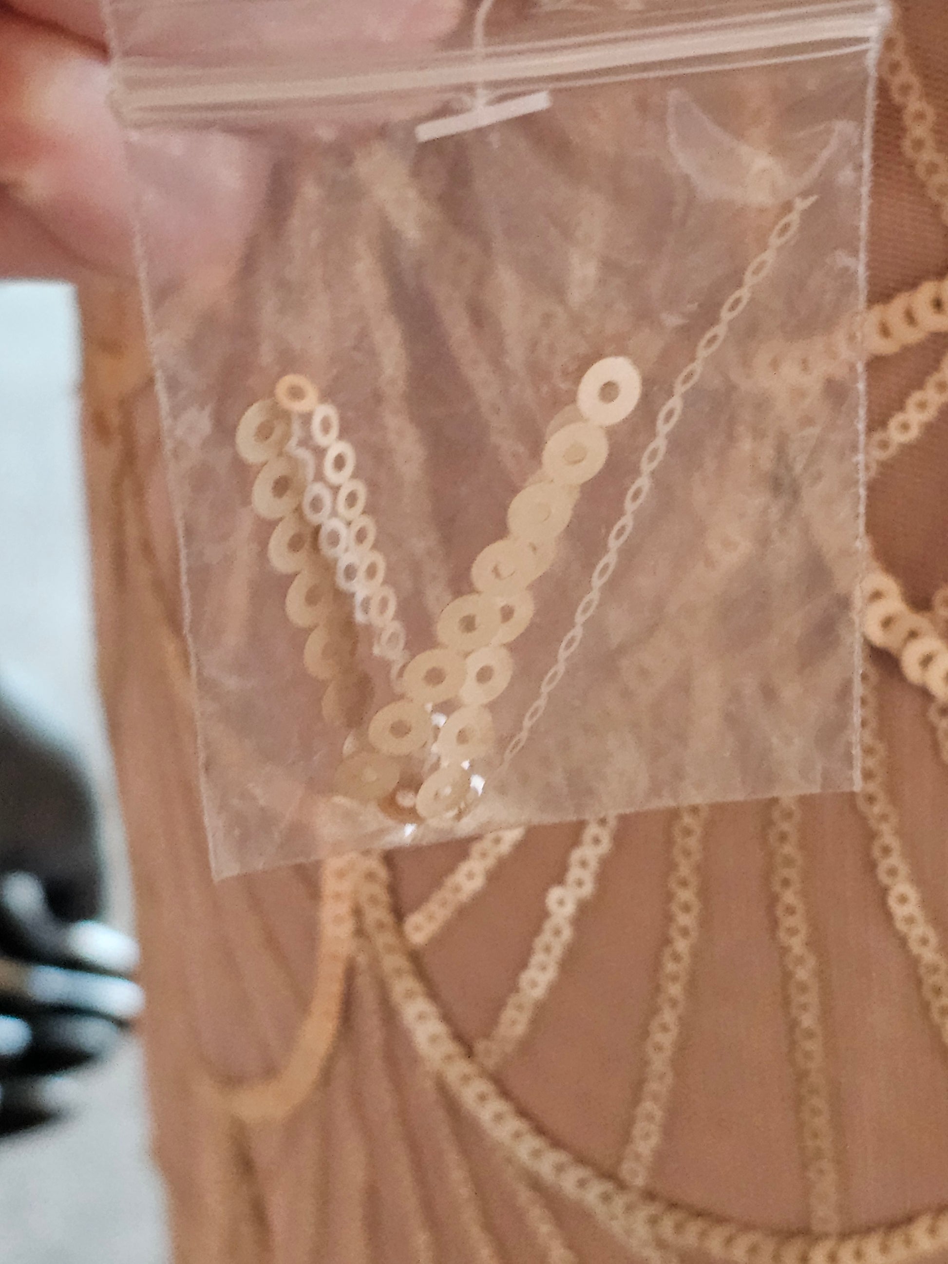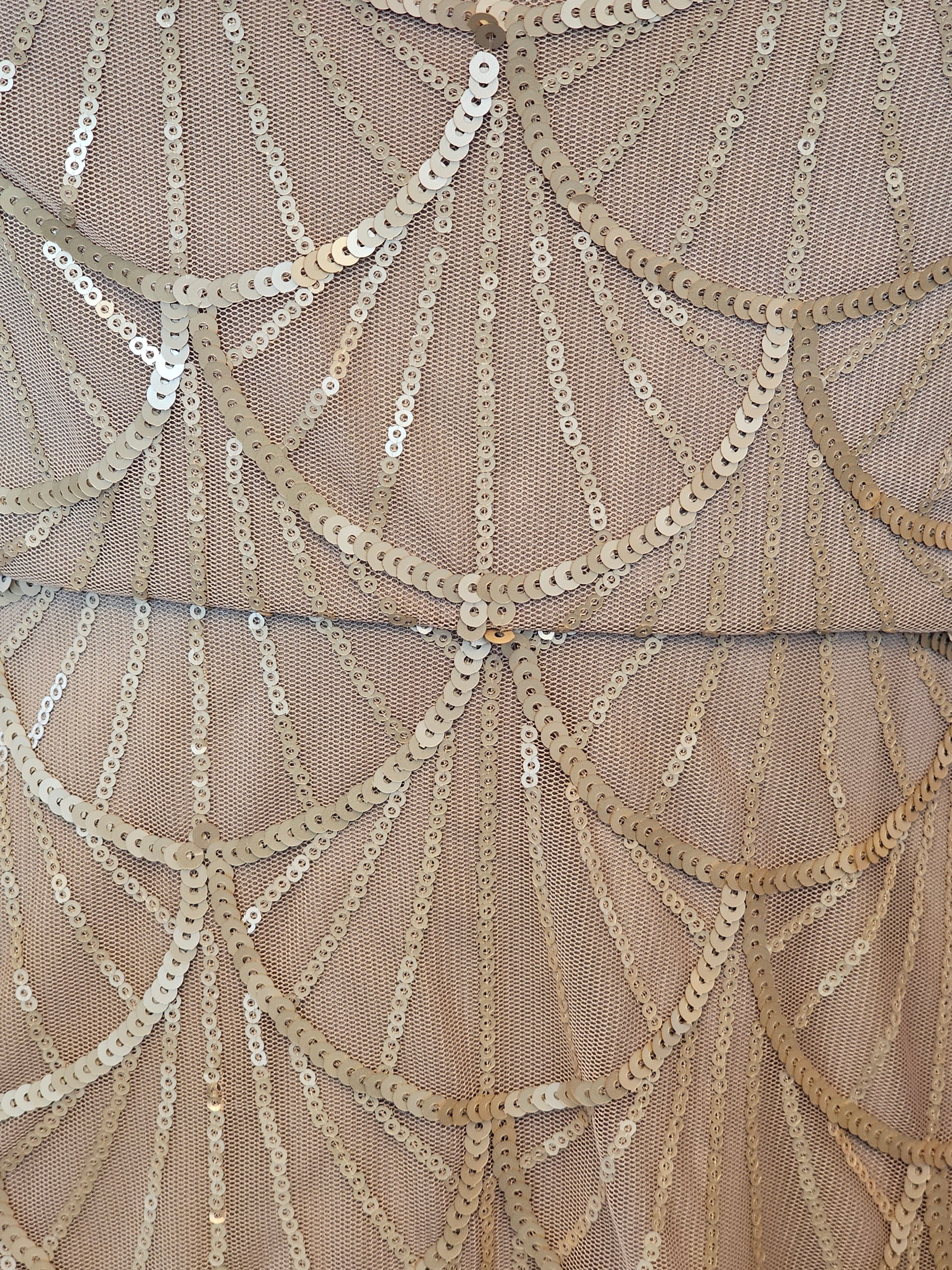 This peachy gown is the perfect versatile dress for your wardrobe. The simple sweetheart neckline, spaghetti straps, and straight skirt make it acceptable for almost any event. Finally, the seashell shaped beading draws in the eye and catches the light!