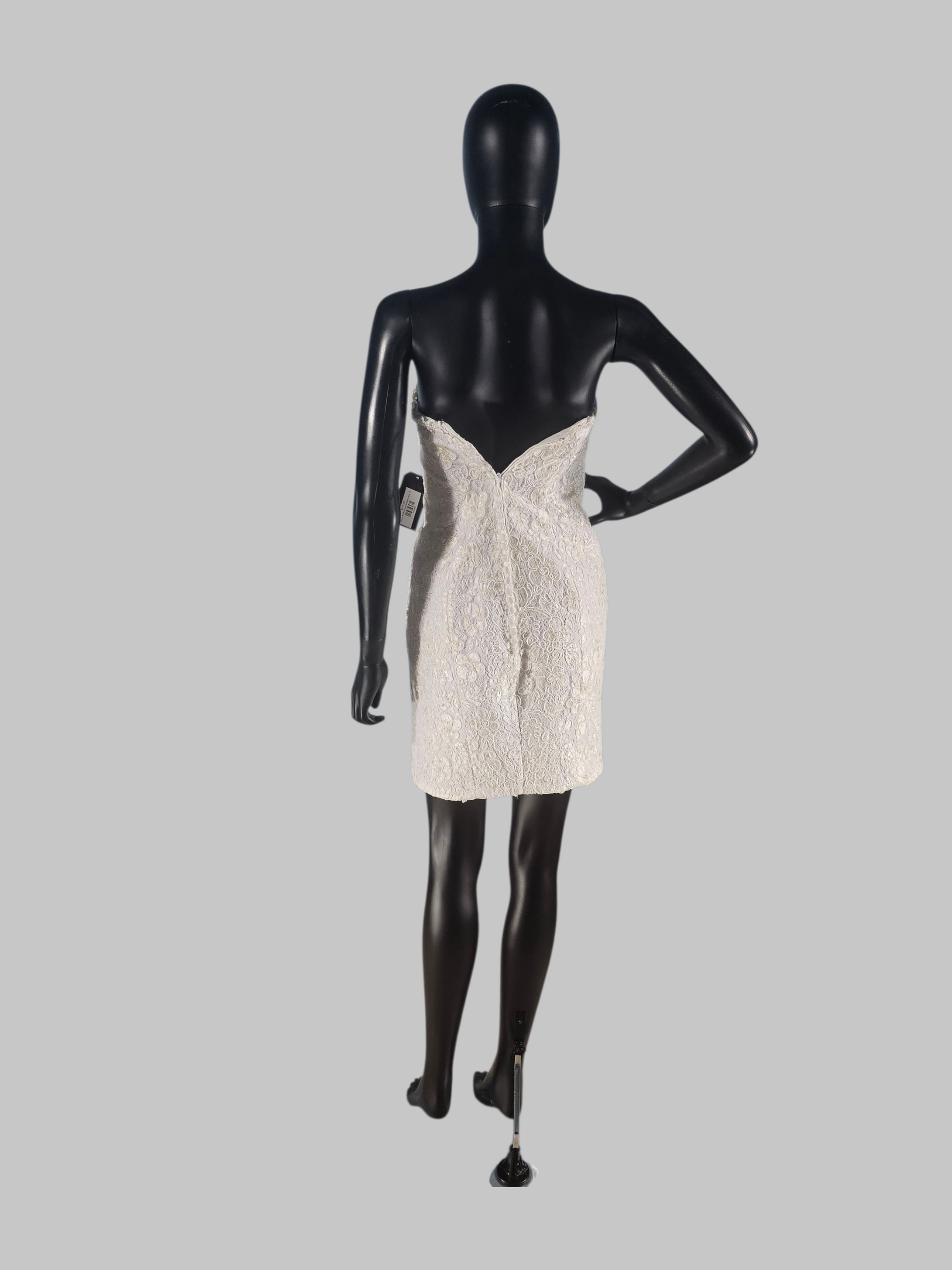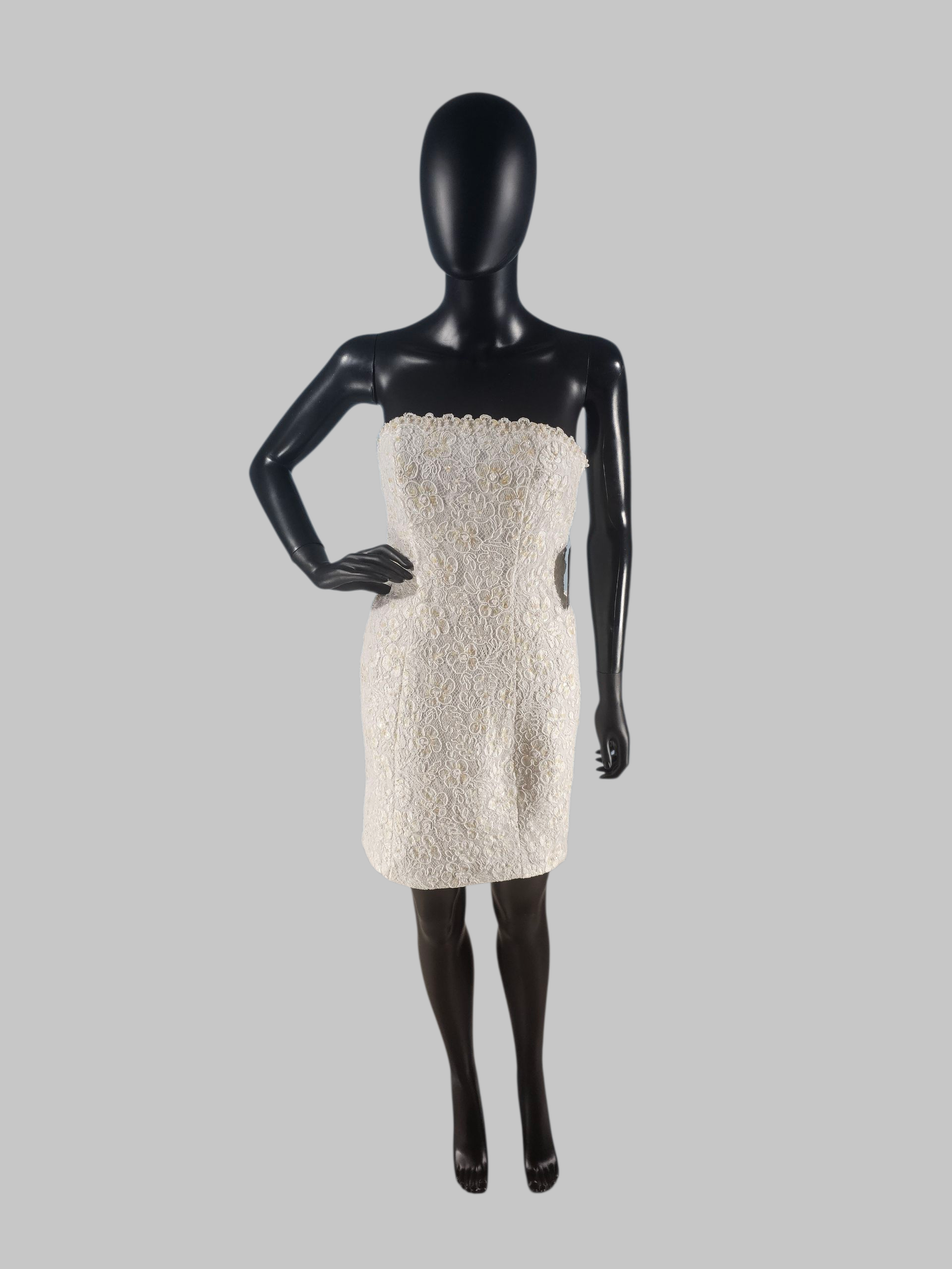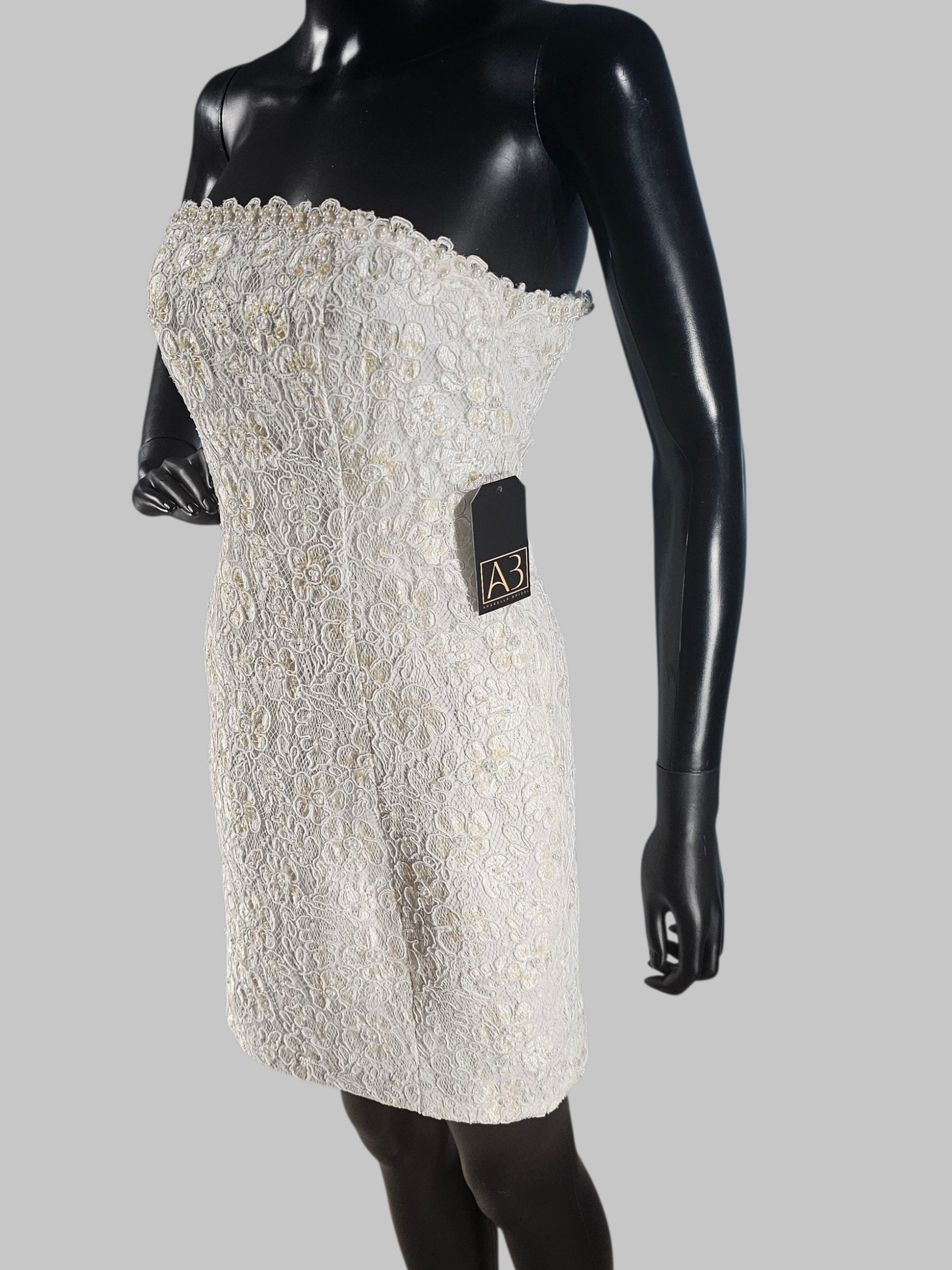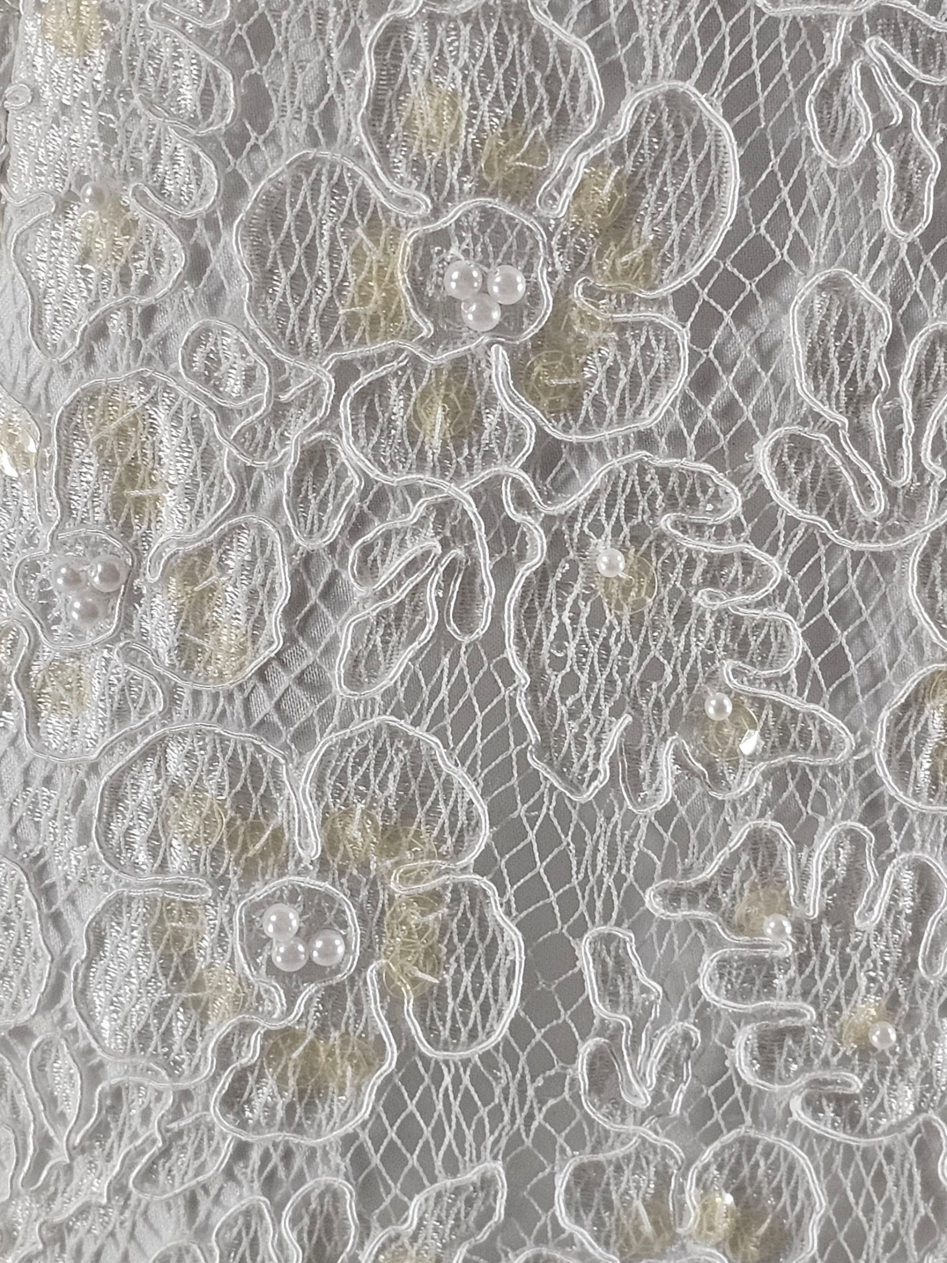 This gown is a lovely mix of sophisticated and fun. The floral lace is intricately mixed with pearls to add an extra sparkle and the square neckline creates a classic romantic feel. The short style makes this dress great for a destination wedding or a classy reception.