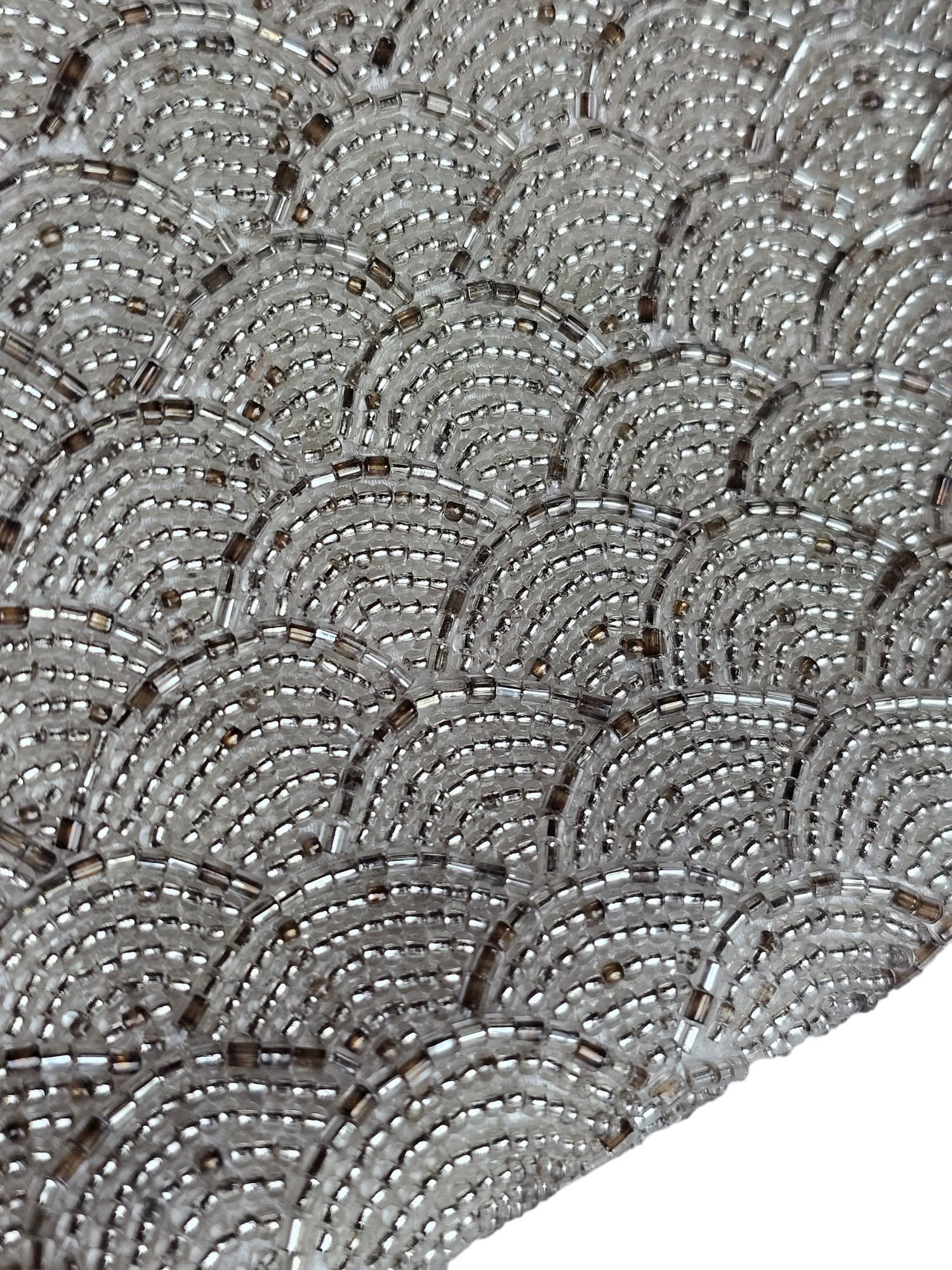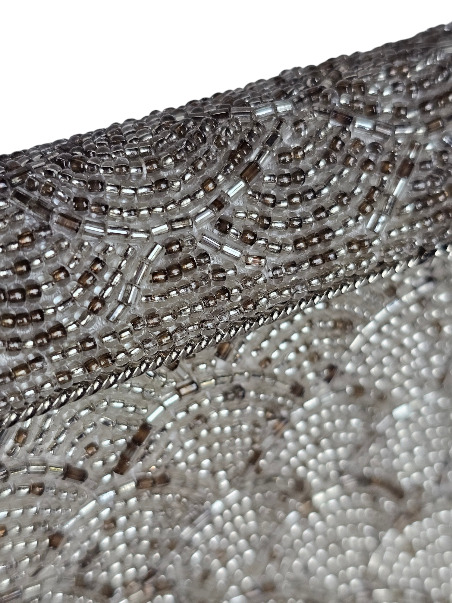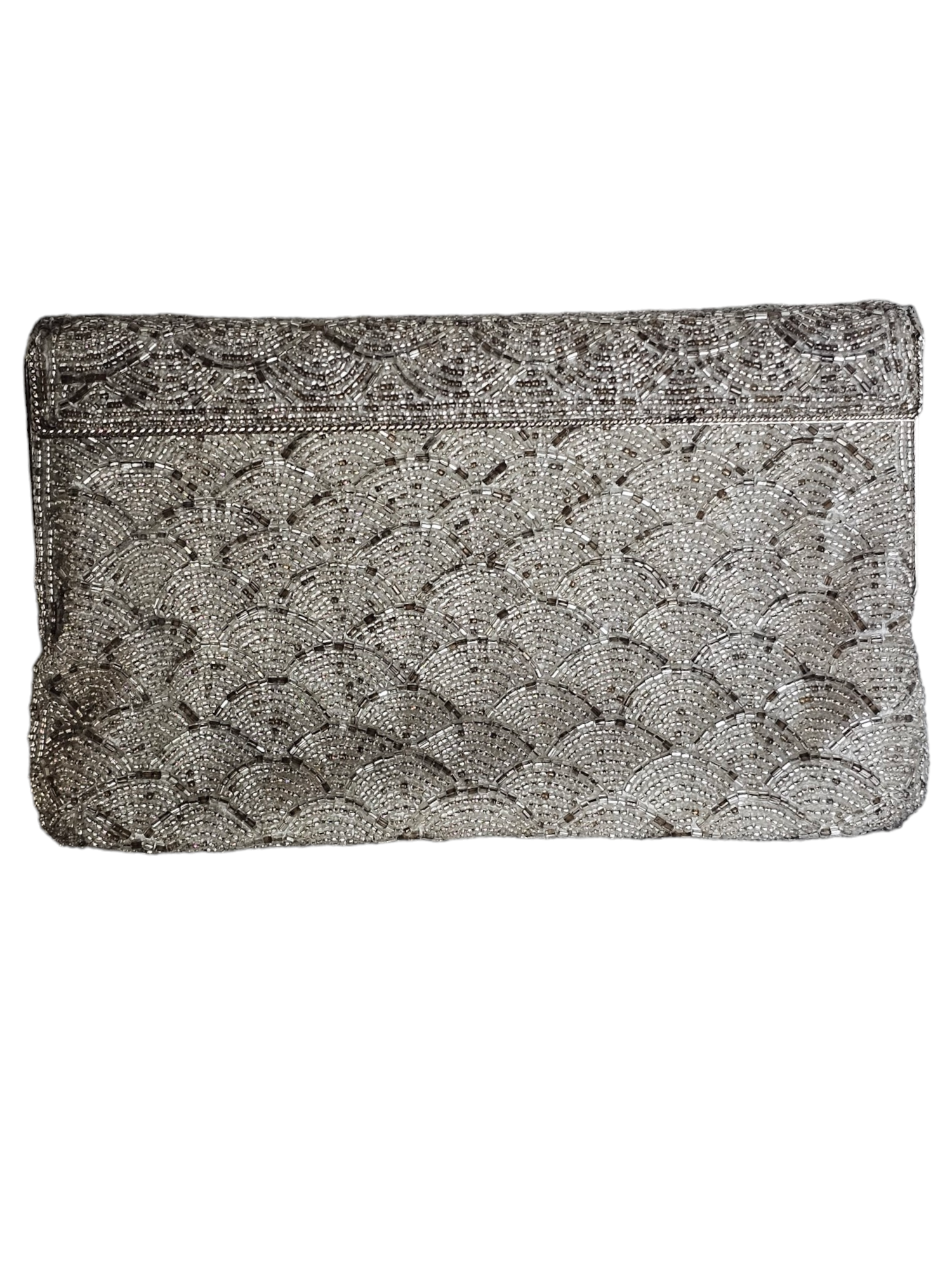 Elevate your evening ensemble with our luxurious Silver Beaded Clutch. The intricate scalloped bead pattern exudes elegance while the silver hinge clasp adds a touch of sophistication. Lined with cream satin, this clutch is the perfect addition to any formal look. Go ahead, make a statement.