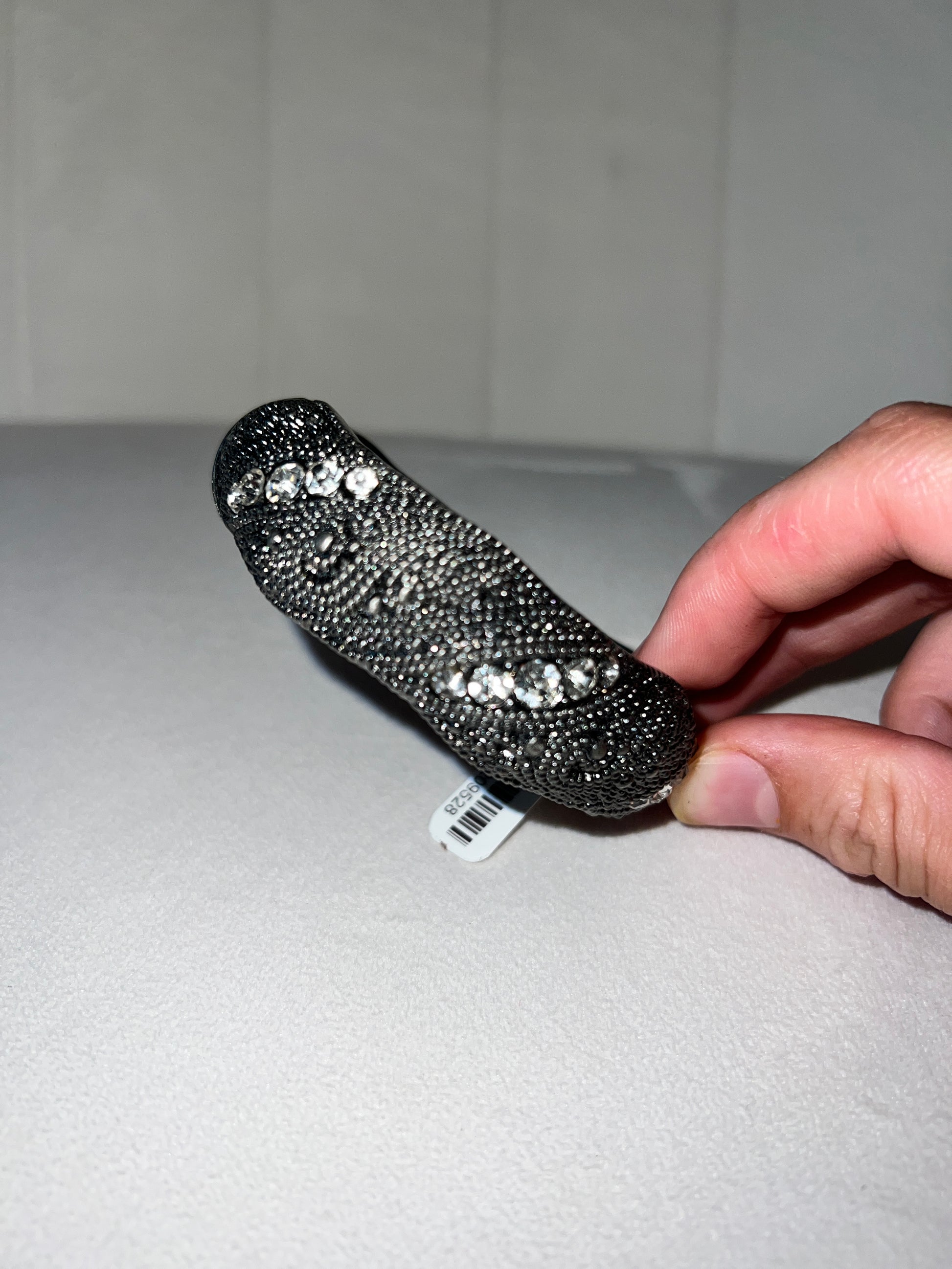 Expertly crafted, this Silver/Crystal Snap Bracelet boasts a dark, dreamy design that is sure to catch the eye. The heavy silver cuff, featuring a pressed design along its exterior, is elegantly adorned with inset white crystals for a touch of sparkle. With a convenient magnet clasp, this bracelet is both stylish and functional.